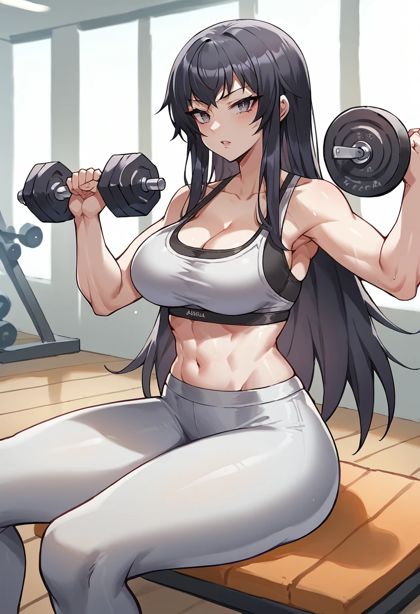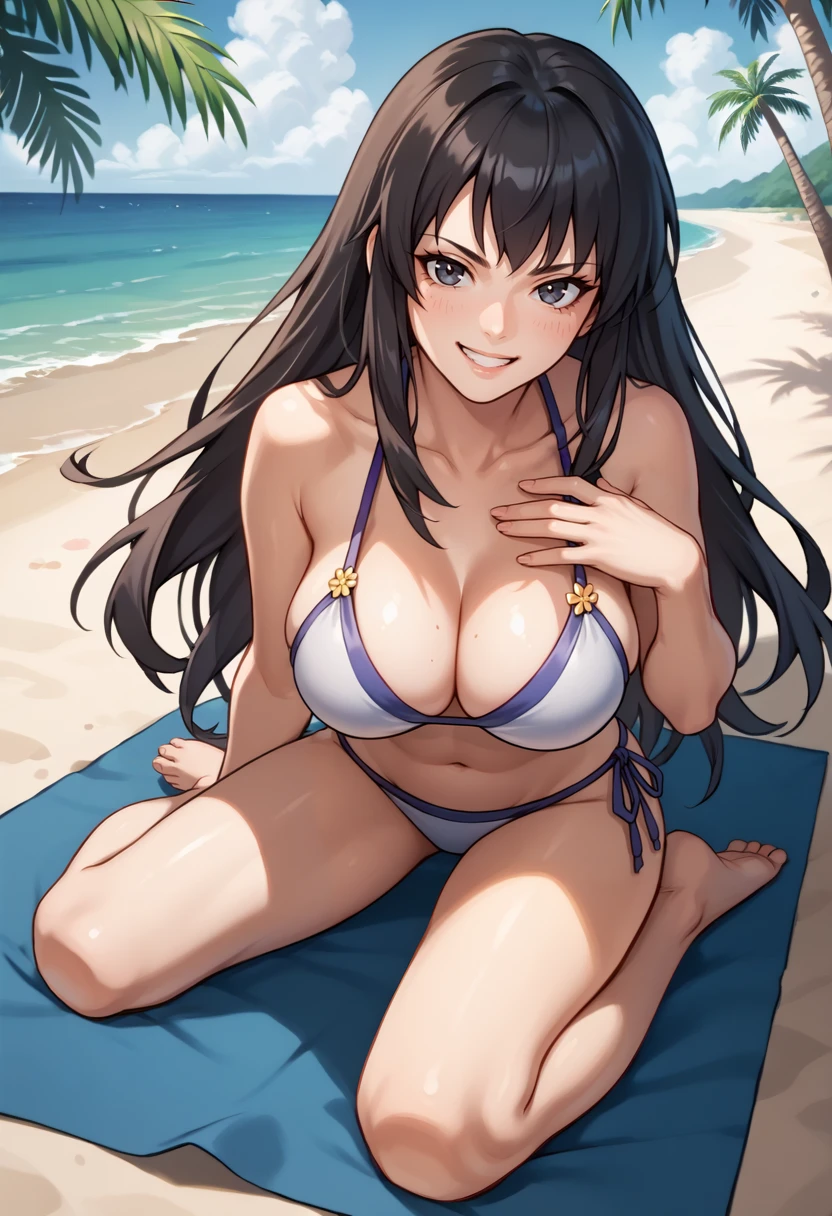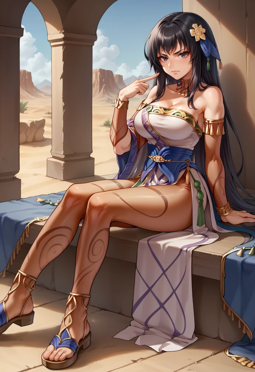 Sun-Piercing Steel (FEH): sunKarla, long hair, hair ornament, neck ring, white dress, strapless, cleavage, large breasts, arm warmers, single sleeve, pelvic curtain, print pantyhose, sandals