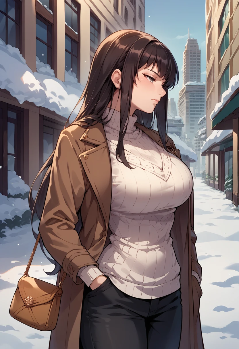 Default appearance: defKarla, long hair, white kimono, cleavage, large breasts, long sleeves, sash, side slit, knee boots, yellow footwear
