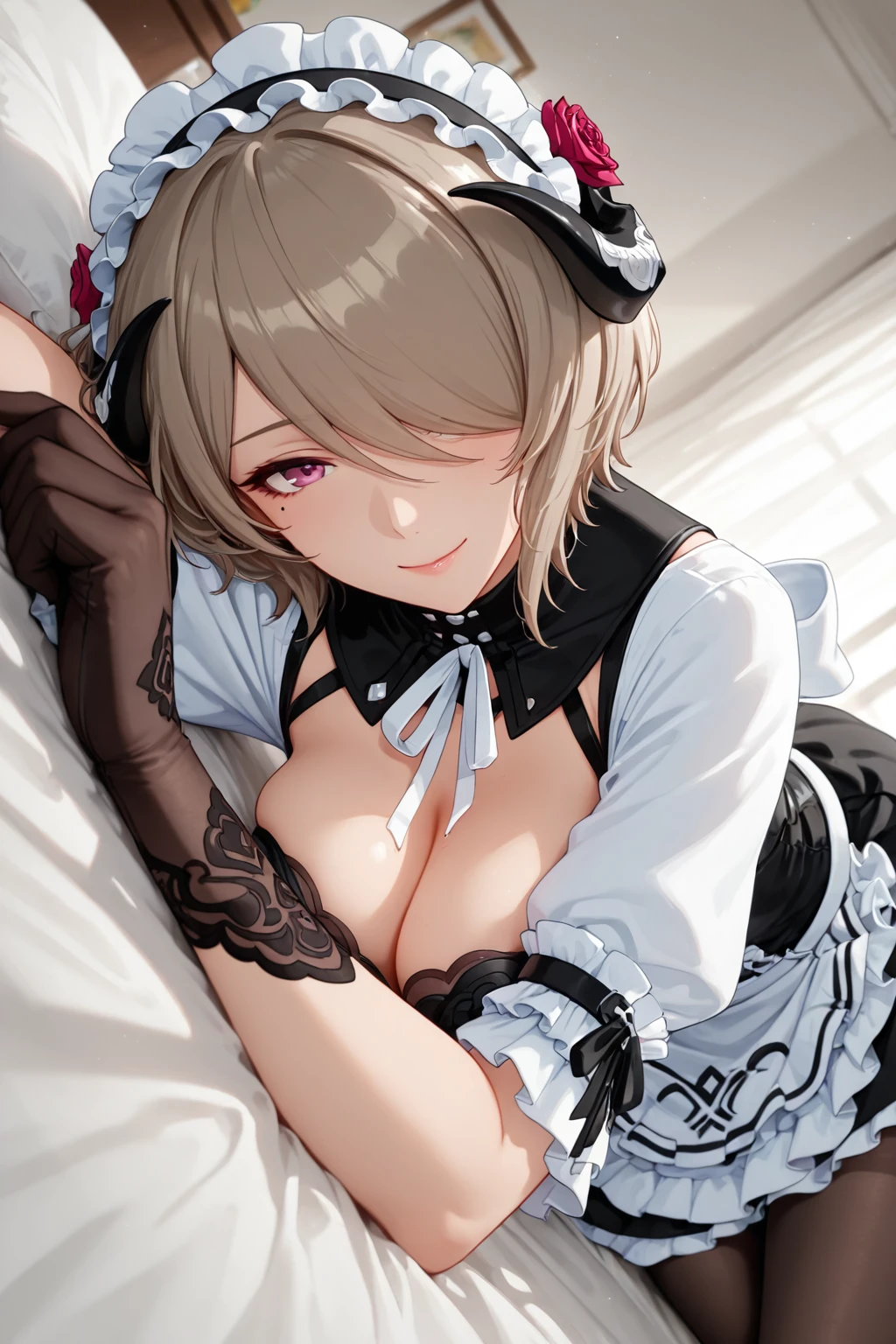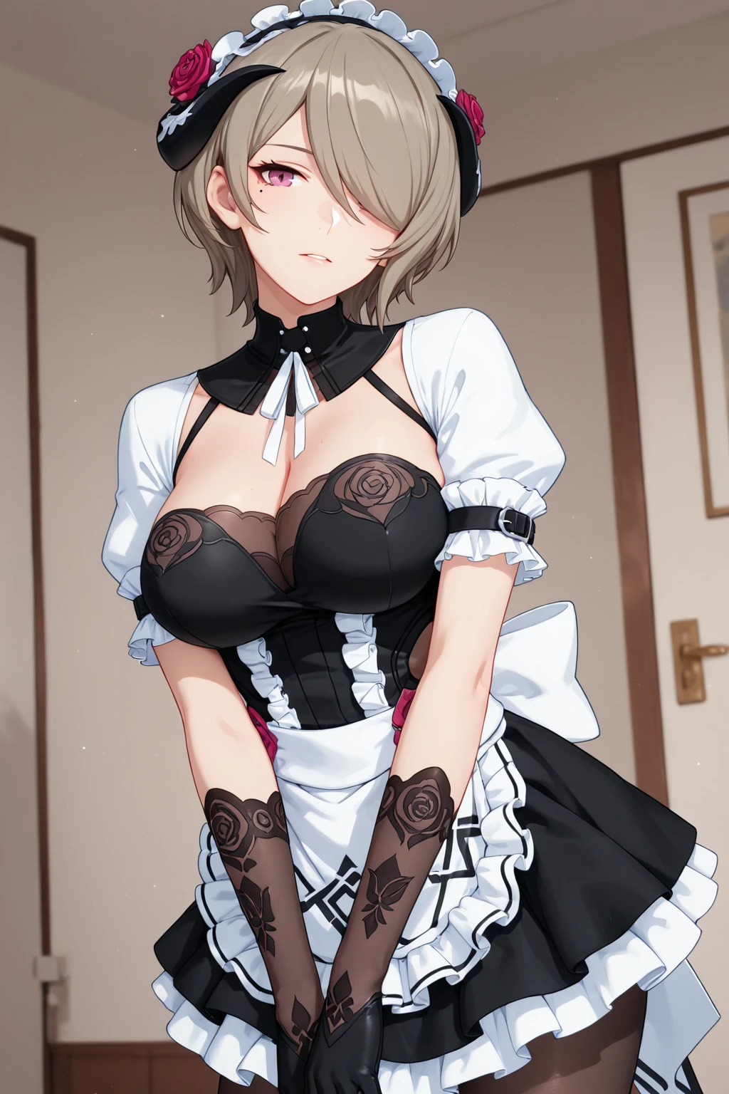 rita rossweisse_maid, rita rossweisse, brown hair, hair over one eye, mole under eye, mole, purple eyes, short hair,
