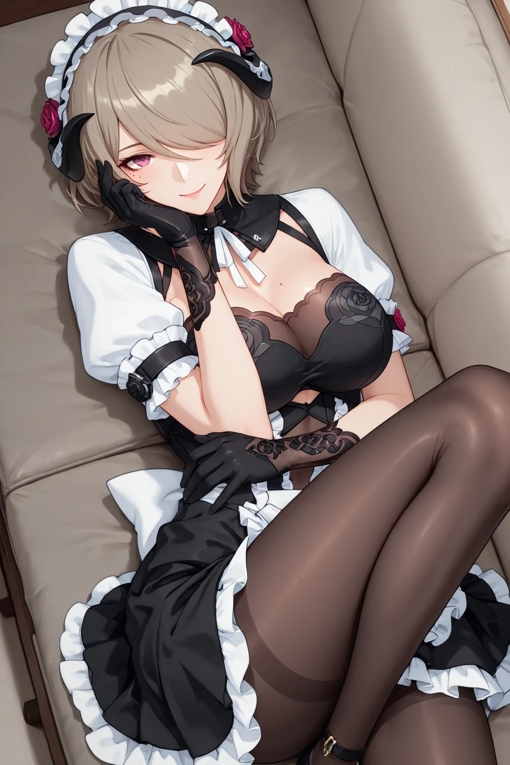 maid headdress, maid, gloves, black gloves, short sleeves, pantyhose, horns,
