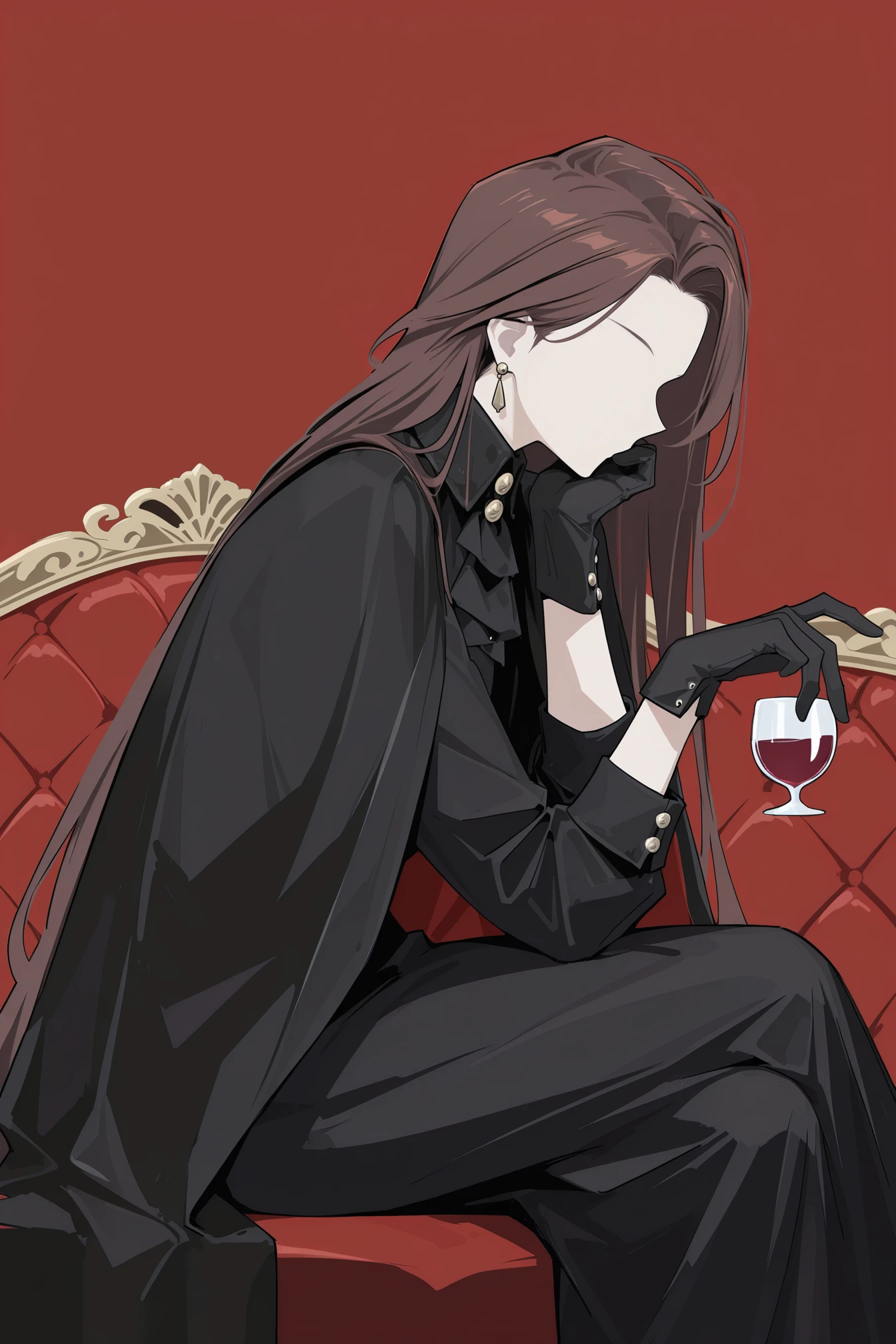valentina \(reverse:1999\), valentina-1999, brown hair, grey eyes, very long hair, earrings, black cape,black ascot, black shirt, bottons, black gloves, black dress,long dress,