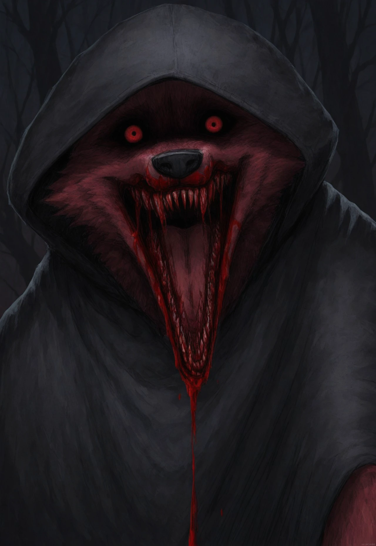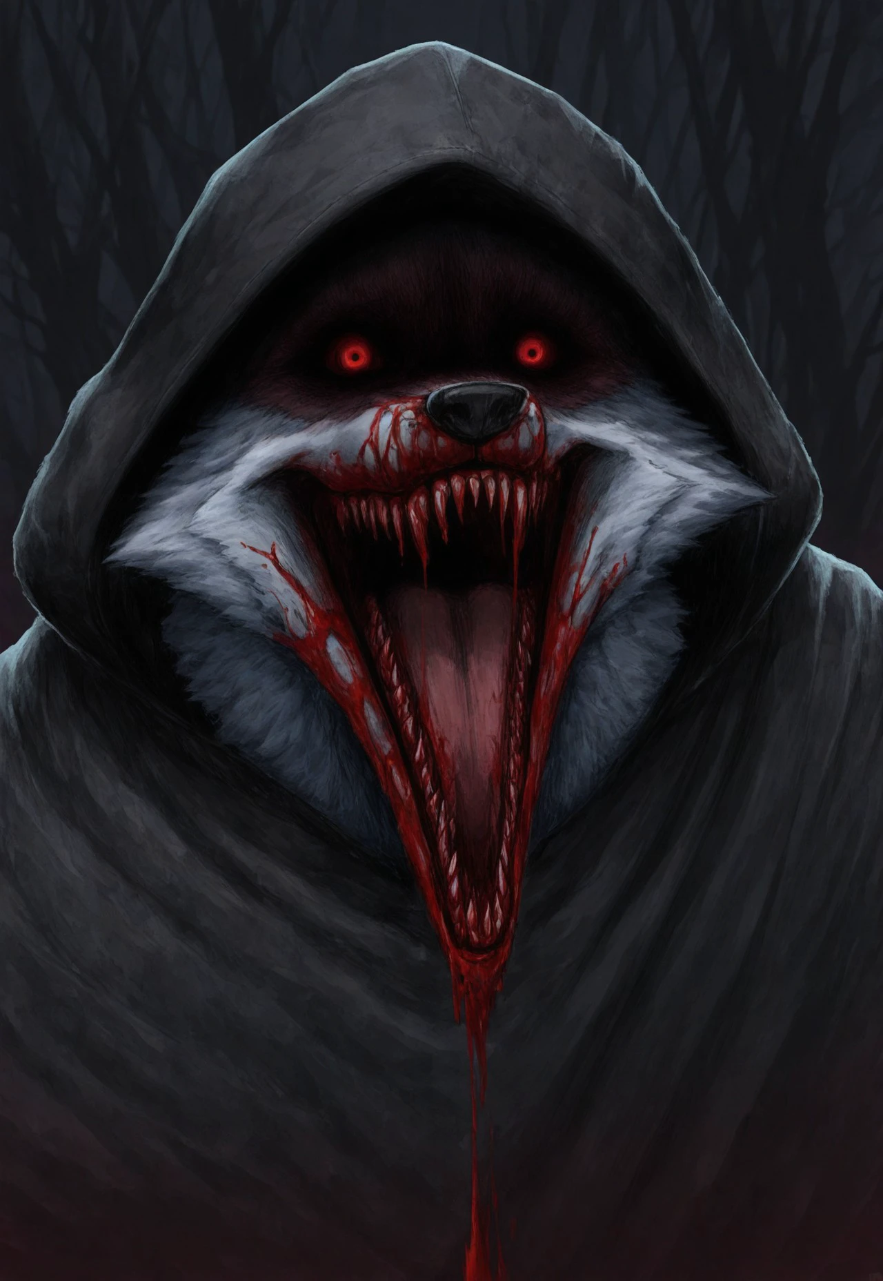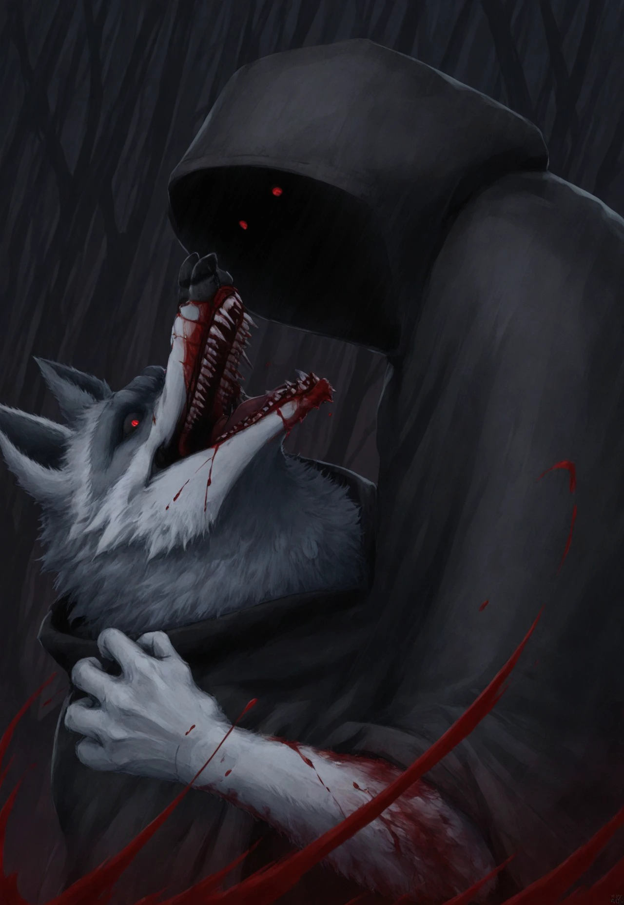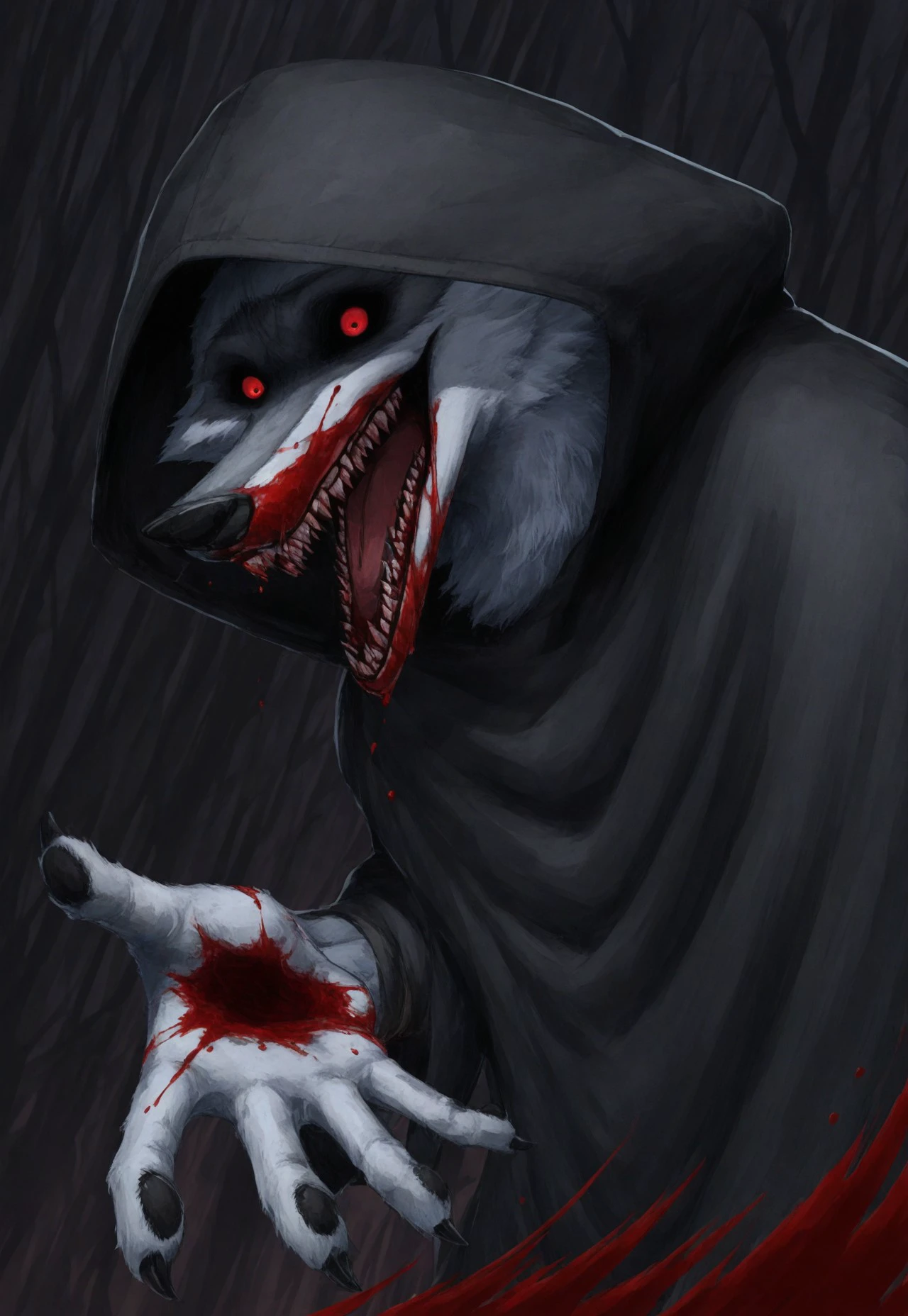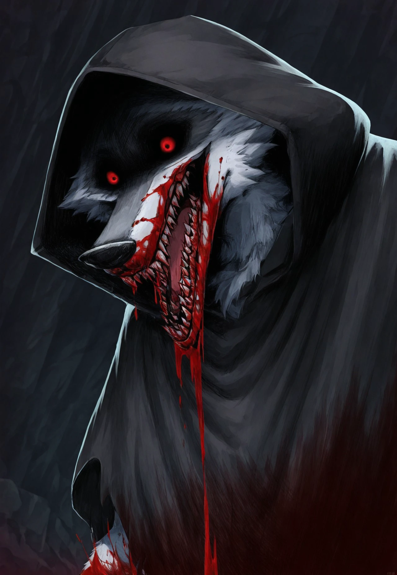 Suggested Character Tags: wolf, solo, 1boy, furry, white fur, cloak, hood, hood up [or hood down]