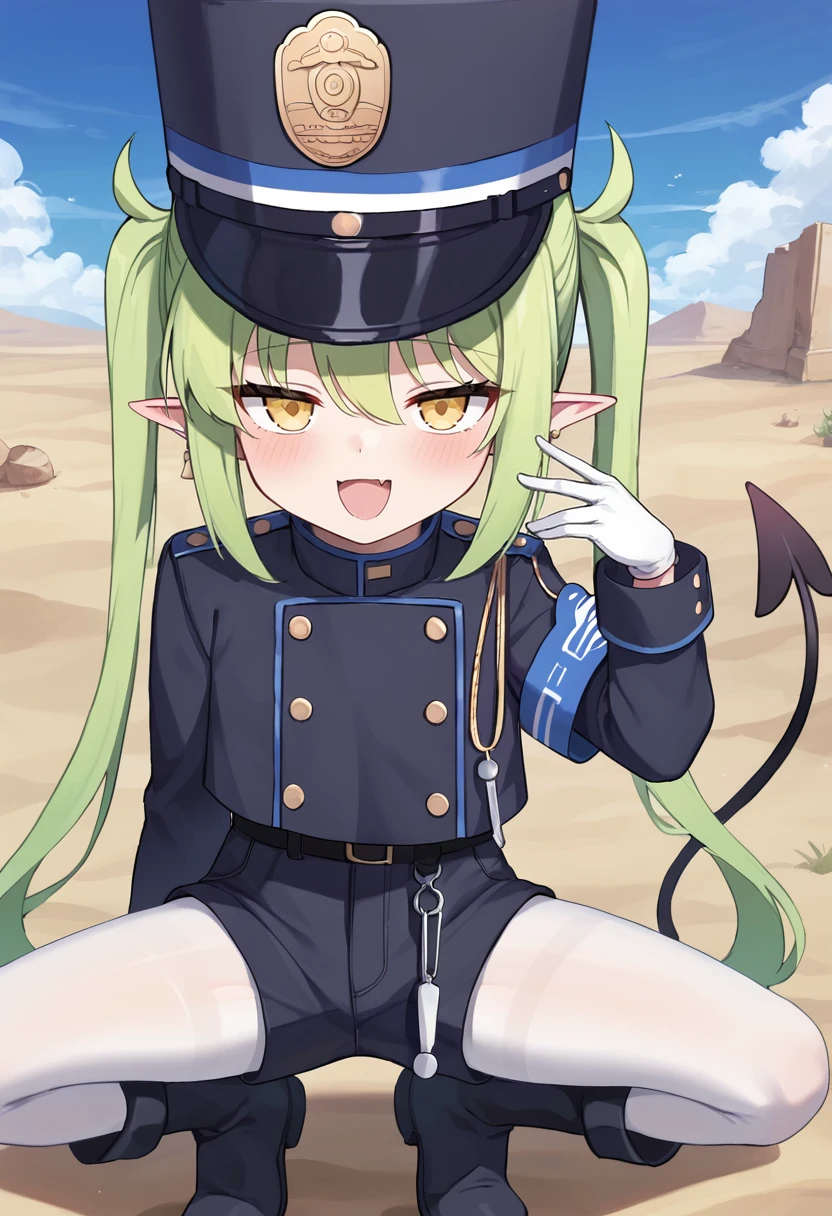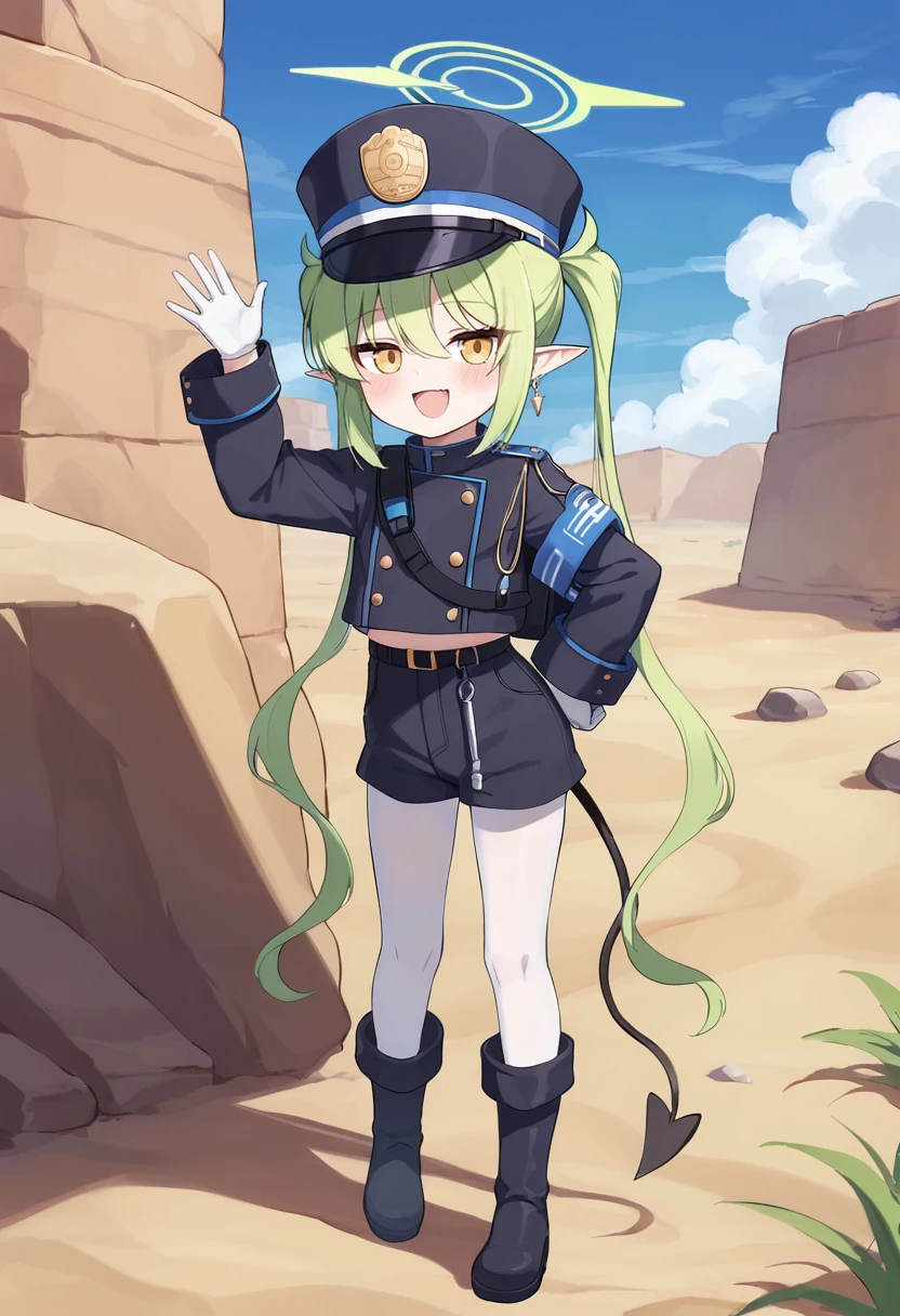 nozomi-default,nozomi_\(blue archive\),yellow eyes,green hair,long hair,earring, pointy ears,halo,tail,jacket,shorts,arm band,white pantyhose, white gloves,peaked cap,boots