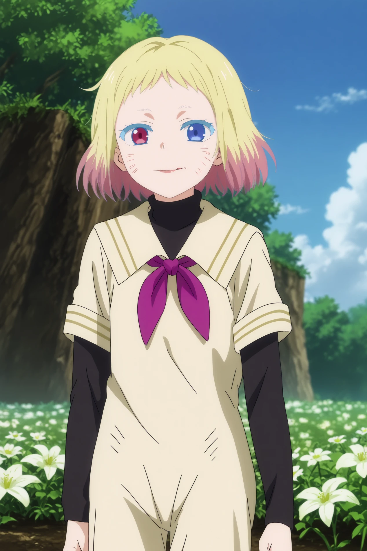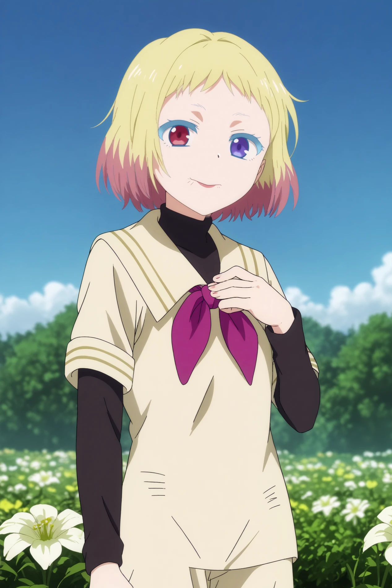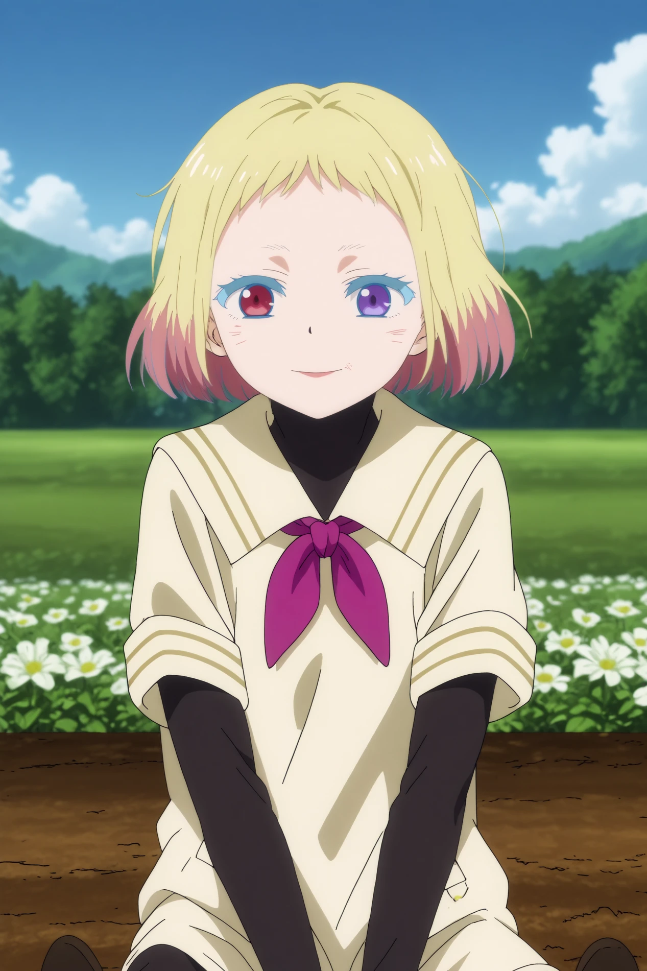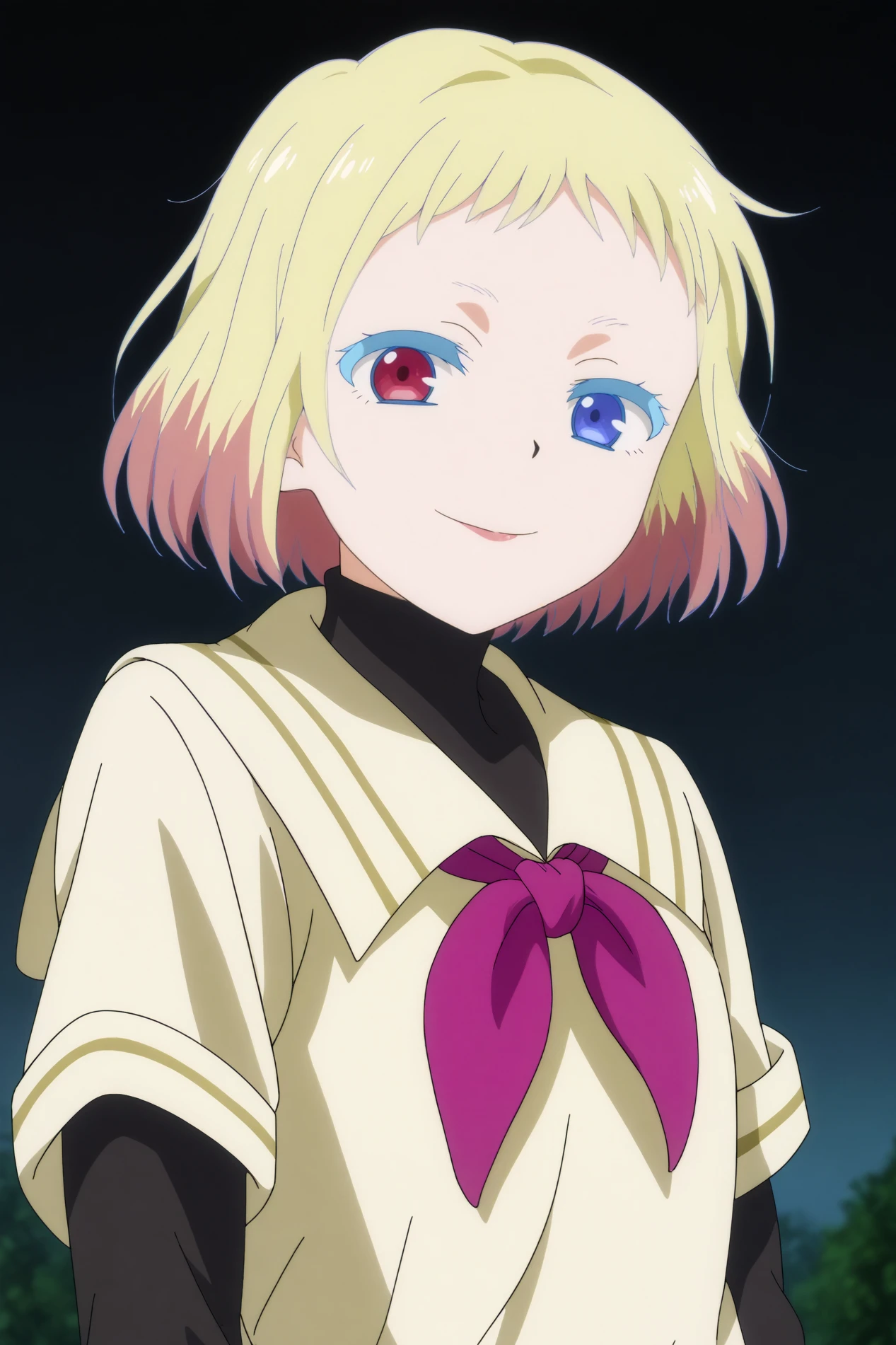Triggers : awano kotobuki,1girl,solo,smile,heterochromia,blonde hair,purple eyes,short hair,looking at viewers,gradient hair,facial mark,neckerchief,shirt,school uniform,sailor collar,short over long sleeves,layered sleeves,purple neckerchief