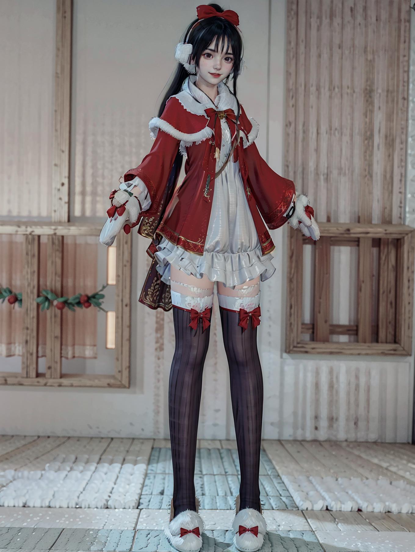 <lora:[衣服]-[林中鹿-天刀少女]TDSVlzl_v2:0.7>,1girl,(loli:1.2),solo,hairball earmuffs,fur-trimmed_gloves,vertical-striped_legwear,black_thighhighs,white fluffy slippers,happy,standing,(full body:1.6),indoor,tile_floor,christmas_tree,(looking_at_viewer:1.2),(best quality),((masterpiece)),
