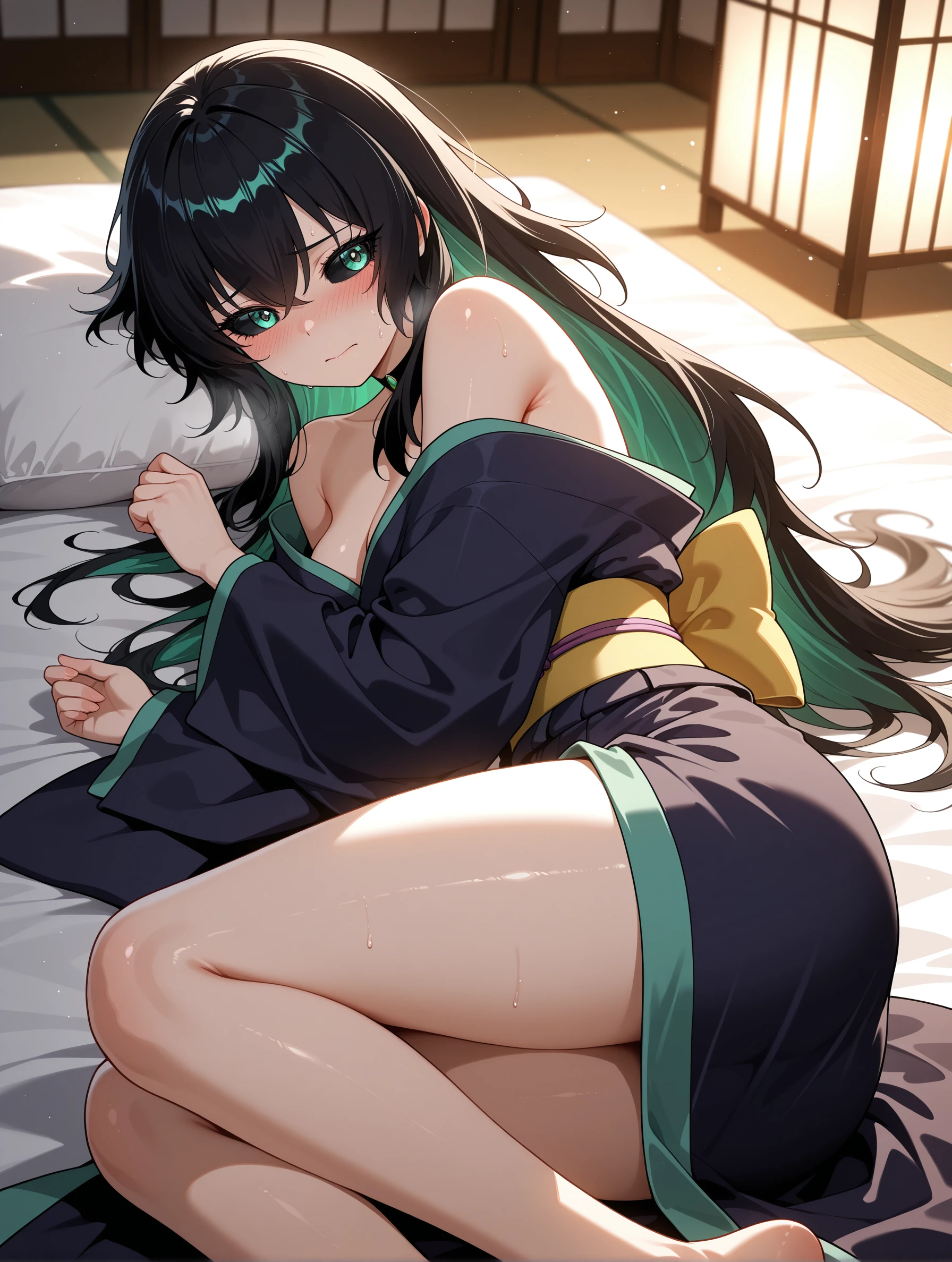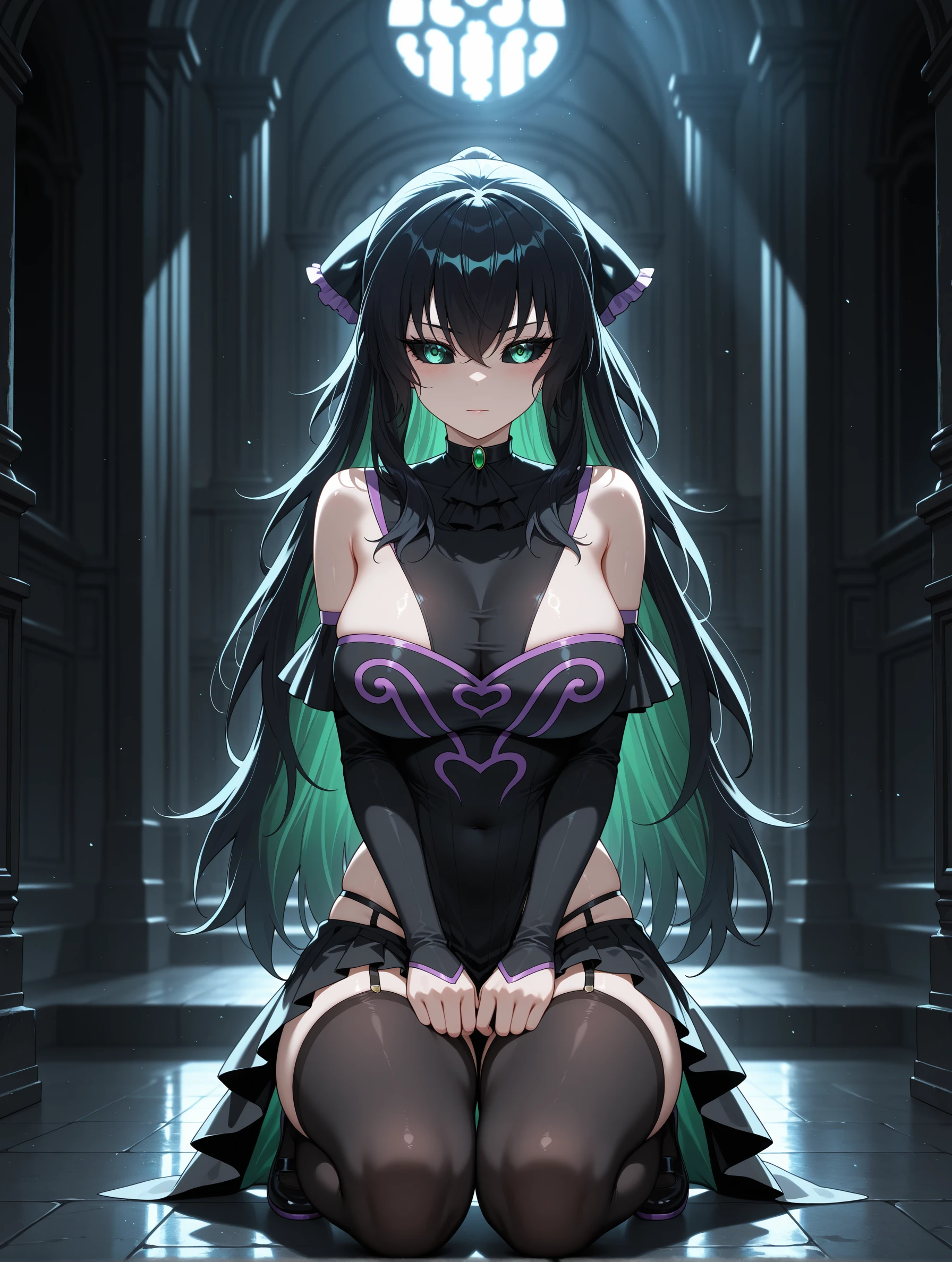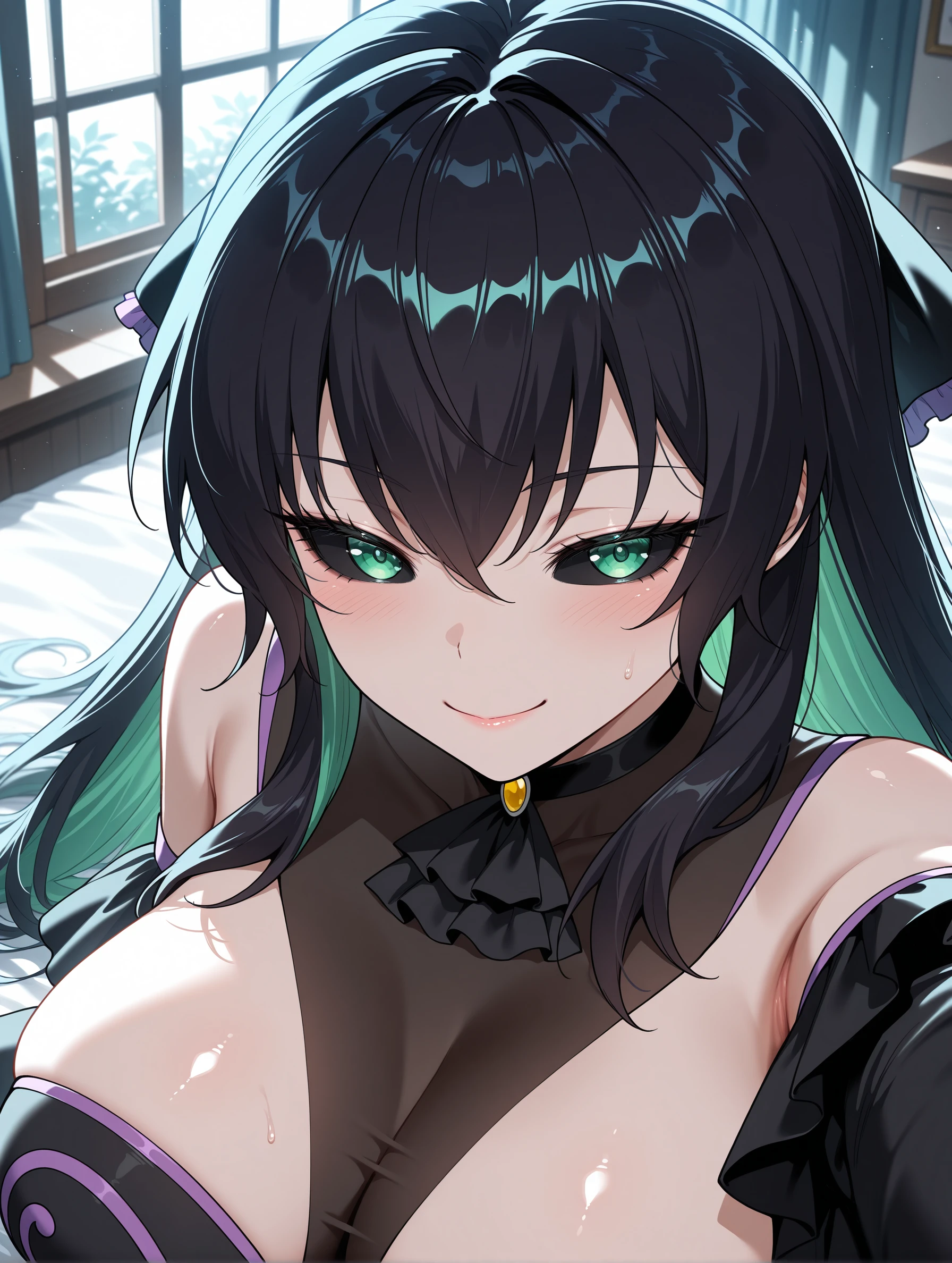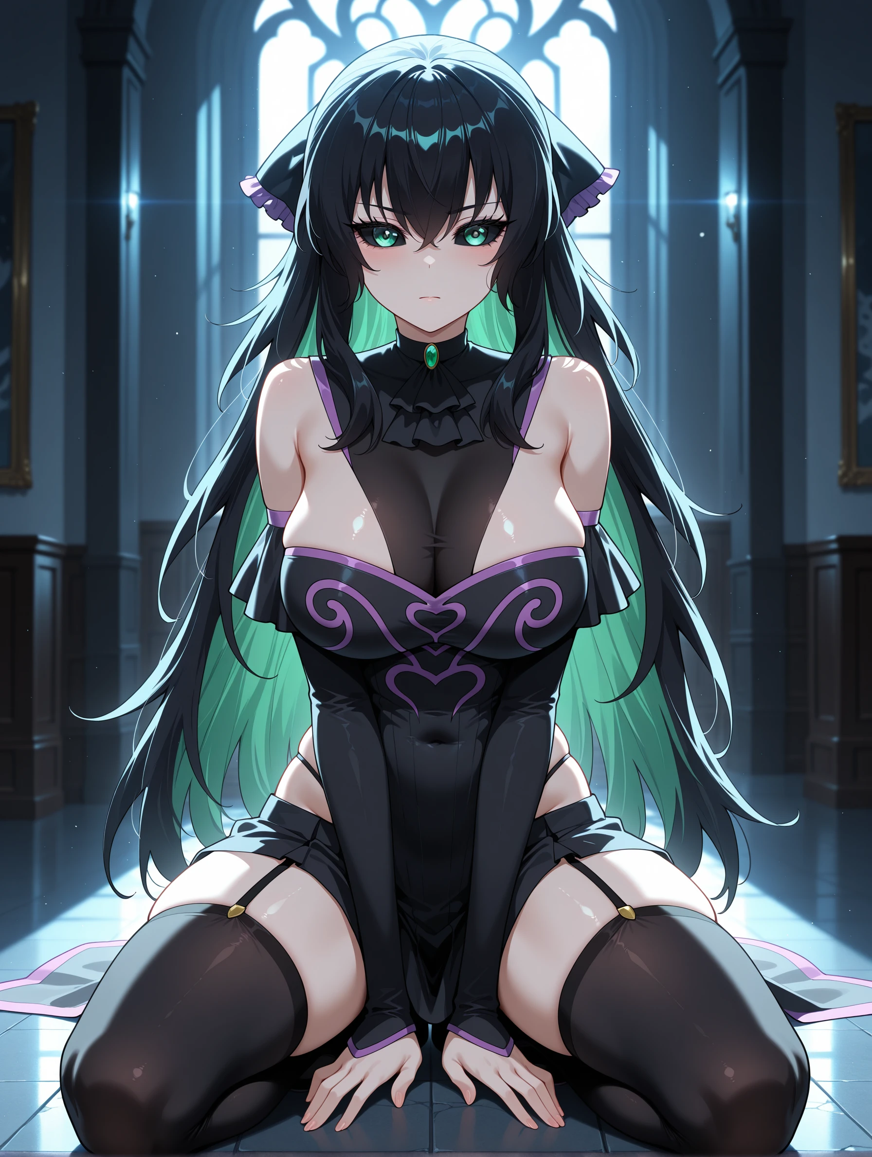 qingtian,long hair,black hair,green eyes,multicolored hair,black sclera,