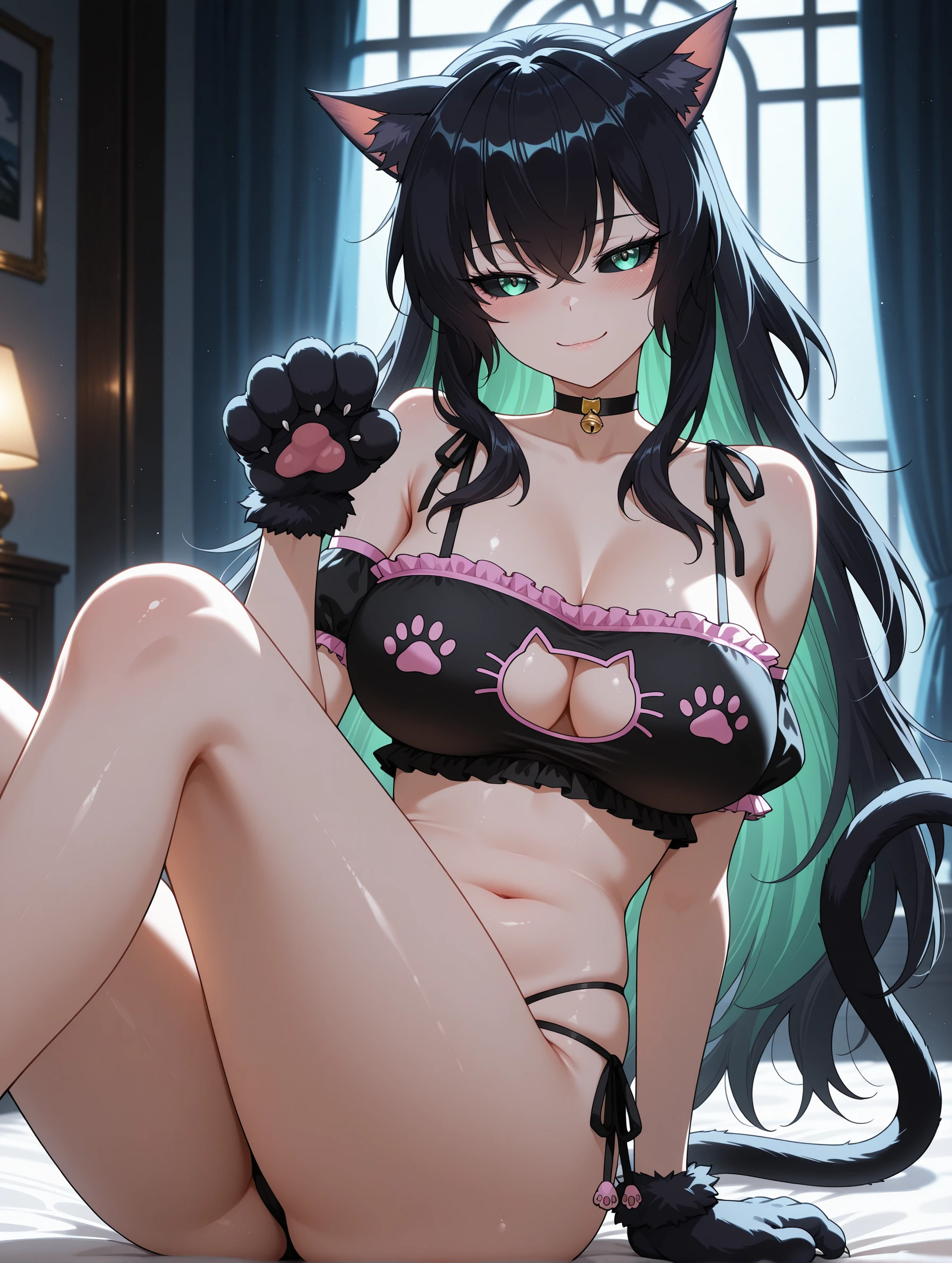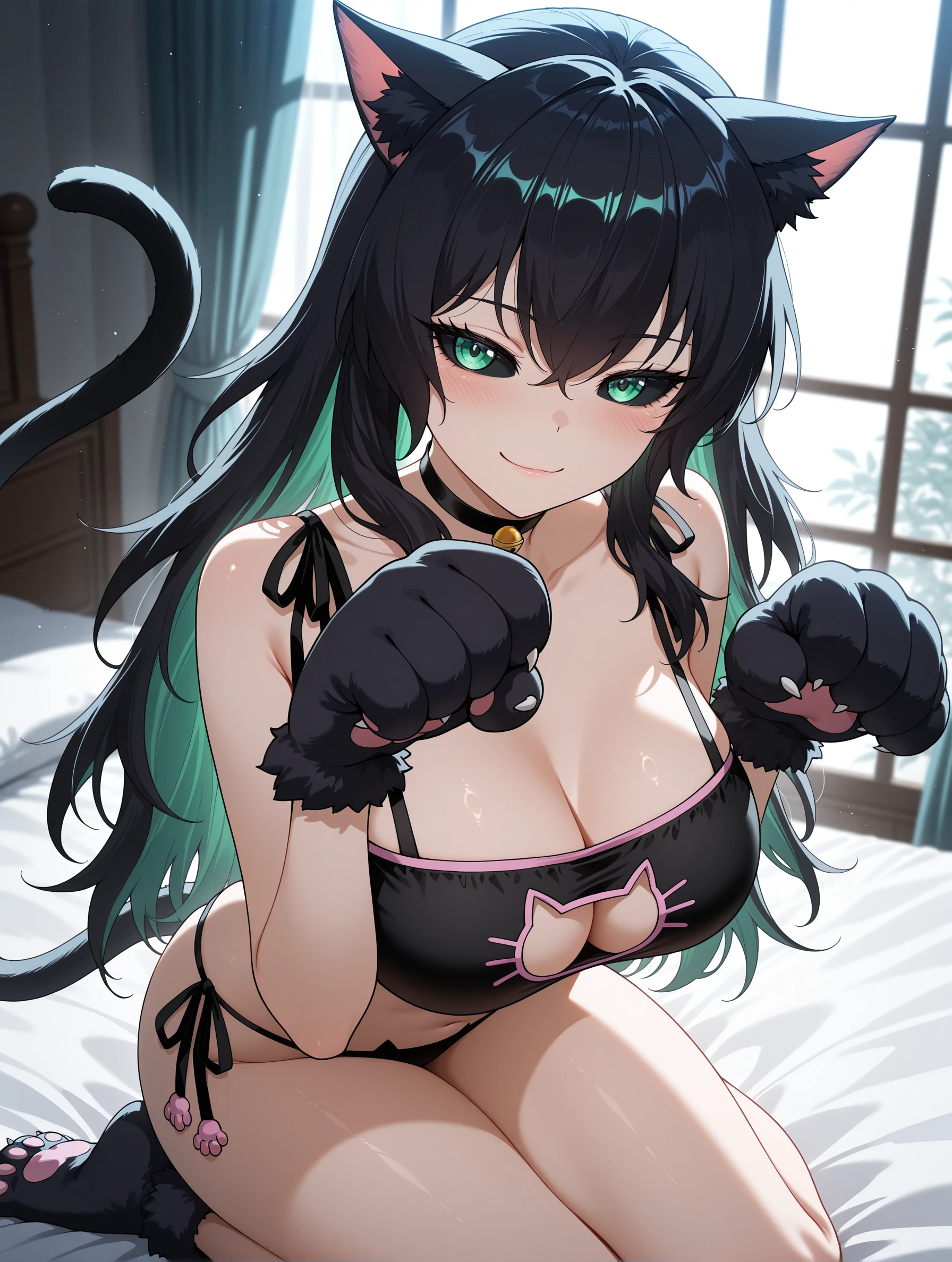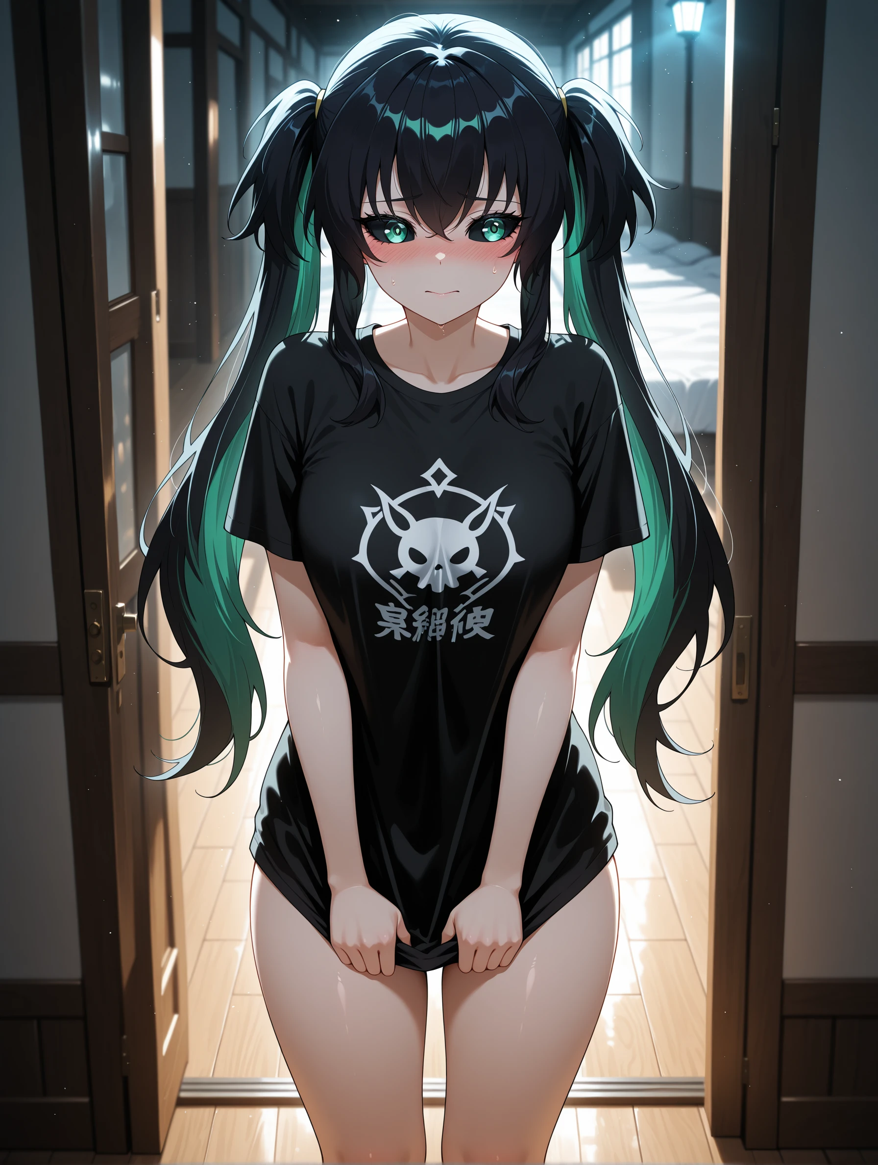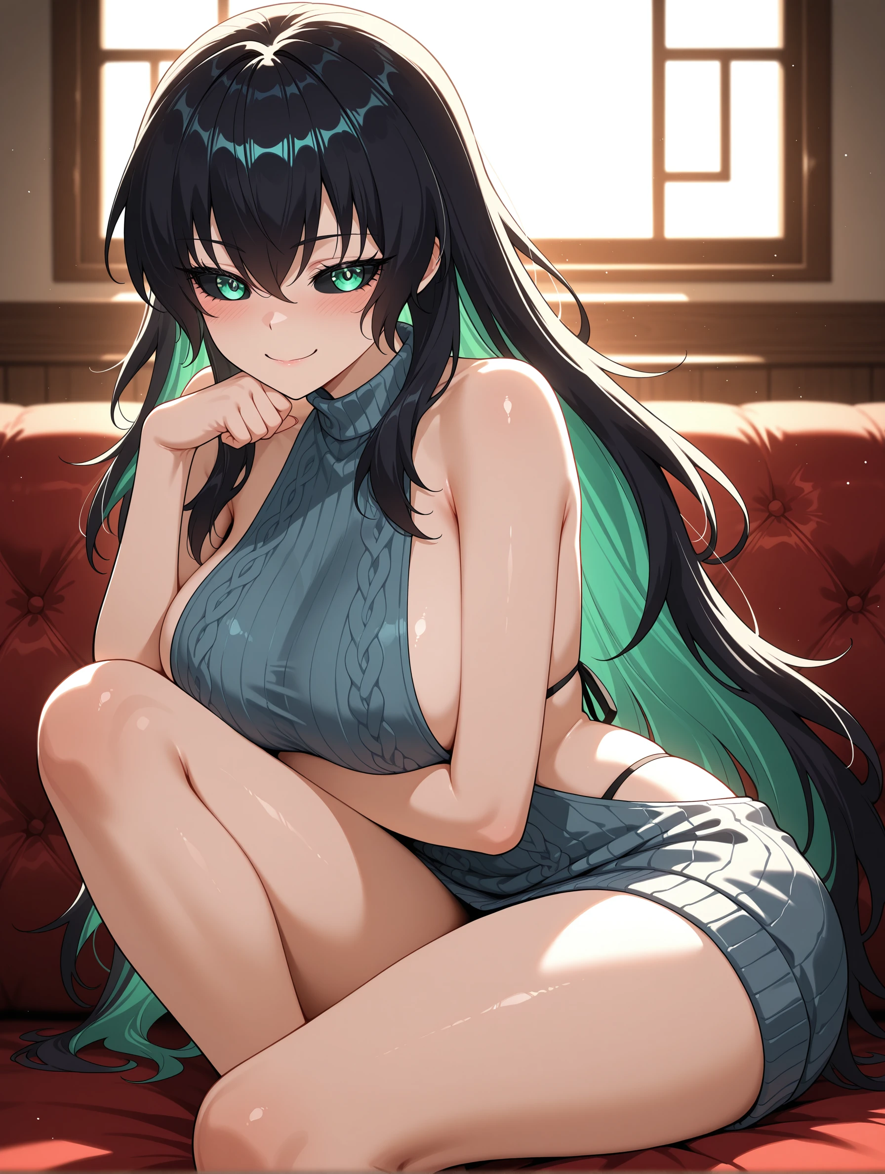qingtian,long hair,black hair,green eyes,multicolored hair,black sclera,