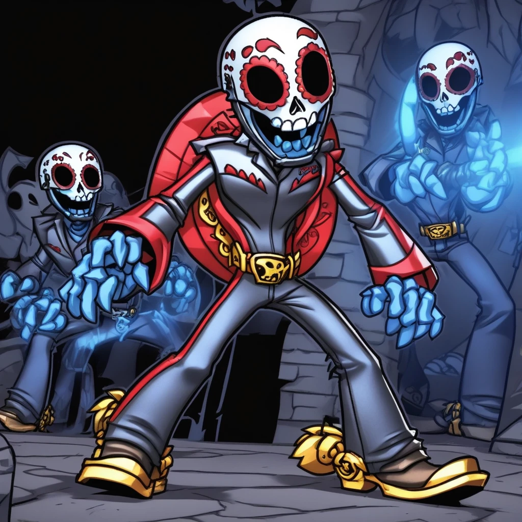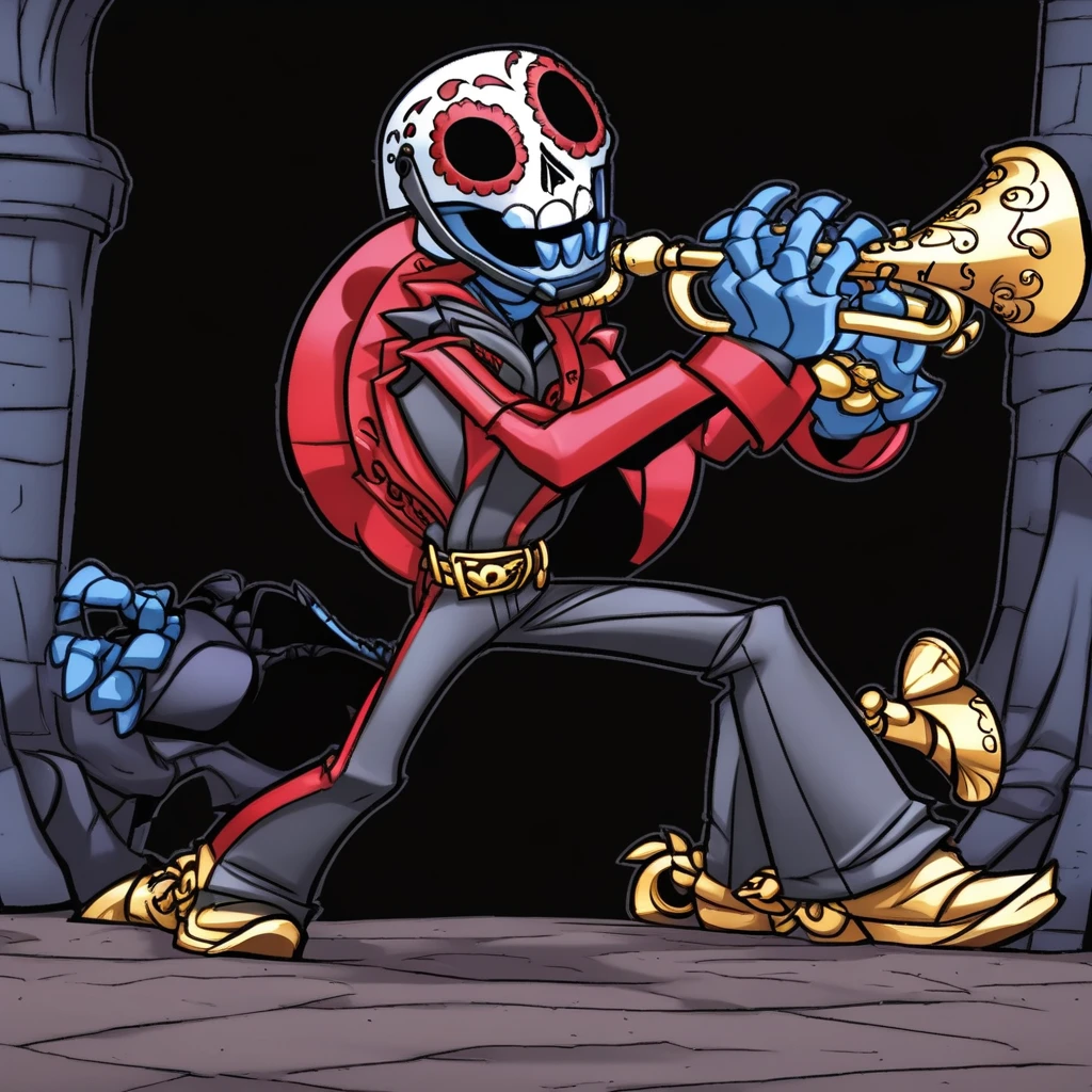 Fiesta (skylanders), blue skeleton, white skull mask with red markings, black strap on mask, black racer outfit, gold belt, cowboy shoes, gold cowboy Spurs, holding a horn in the shape of a gun, red sombrero on back