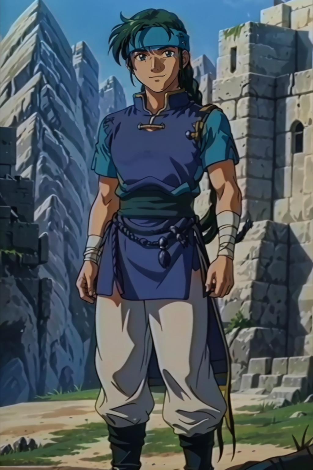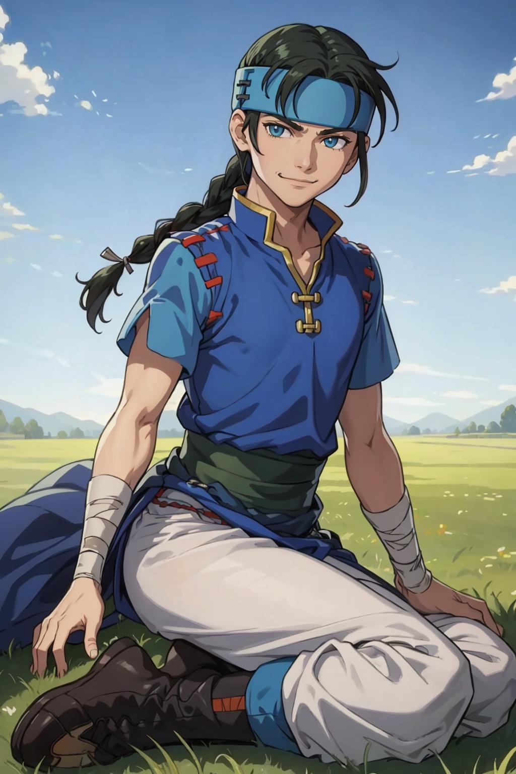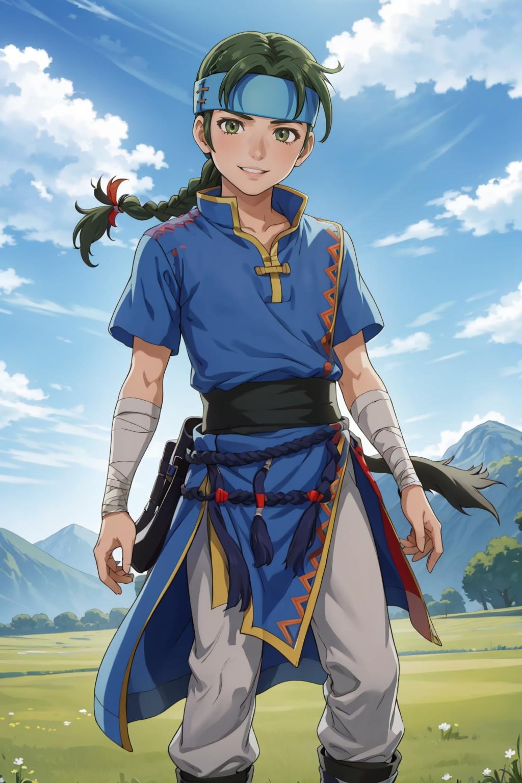 For his default outfit its "blue shirt, pants, boots, headband, braid, bandages"