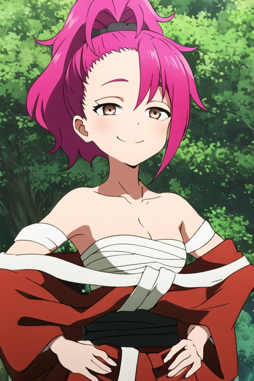 kunoichiazami, brown eyes, pink hair, ponytail, red kimono, bandage