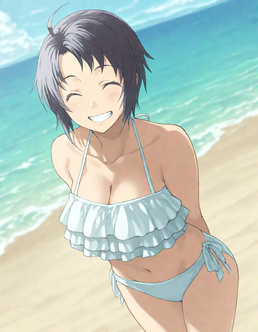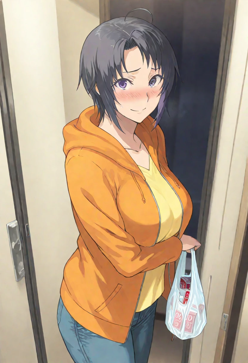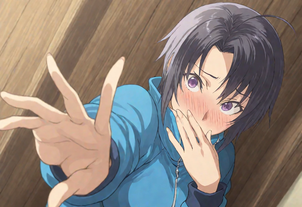 1girl,mikage_aki,short hair,forehead,asymmetrical_bangs,ahoge,black hair,purple eyes