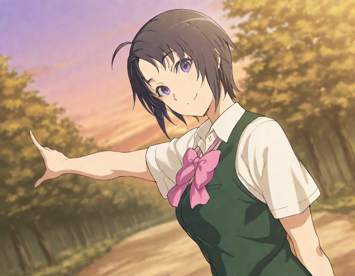 school uniform,white collared shirt,short sleeves,green vest,pink bow,green skirt