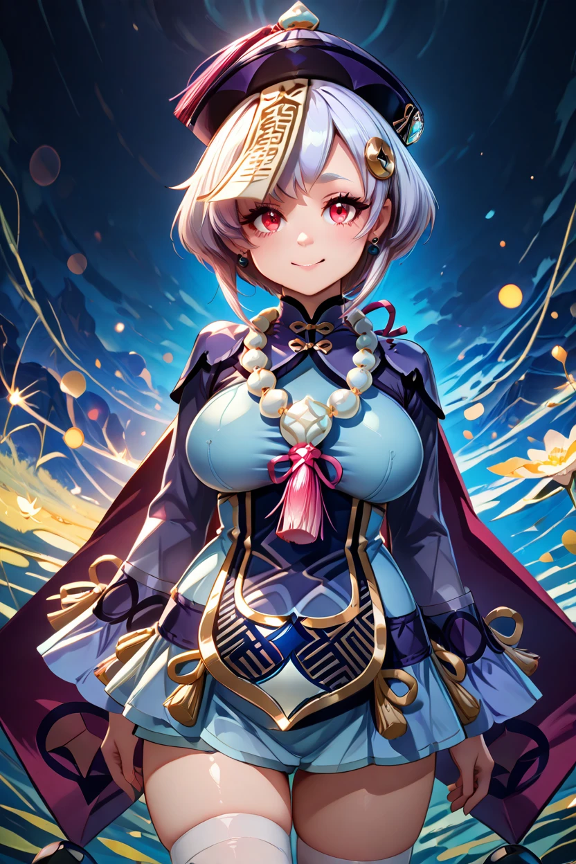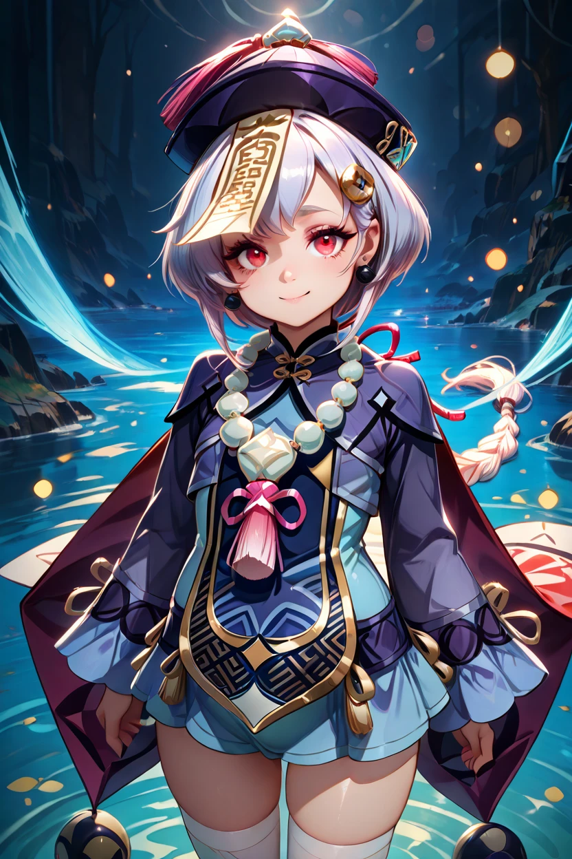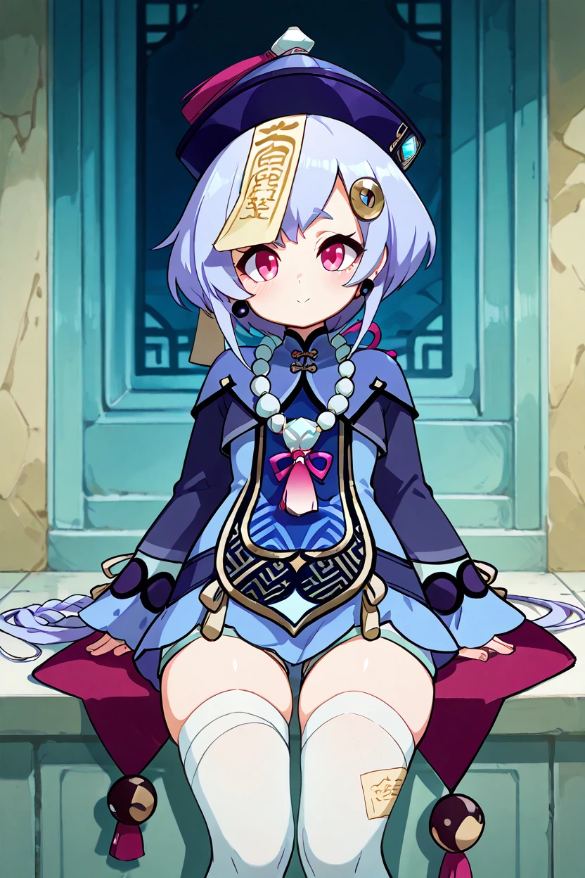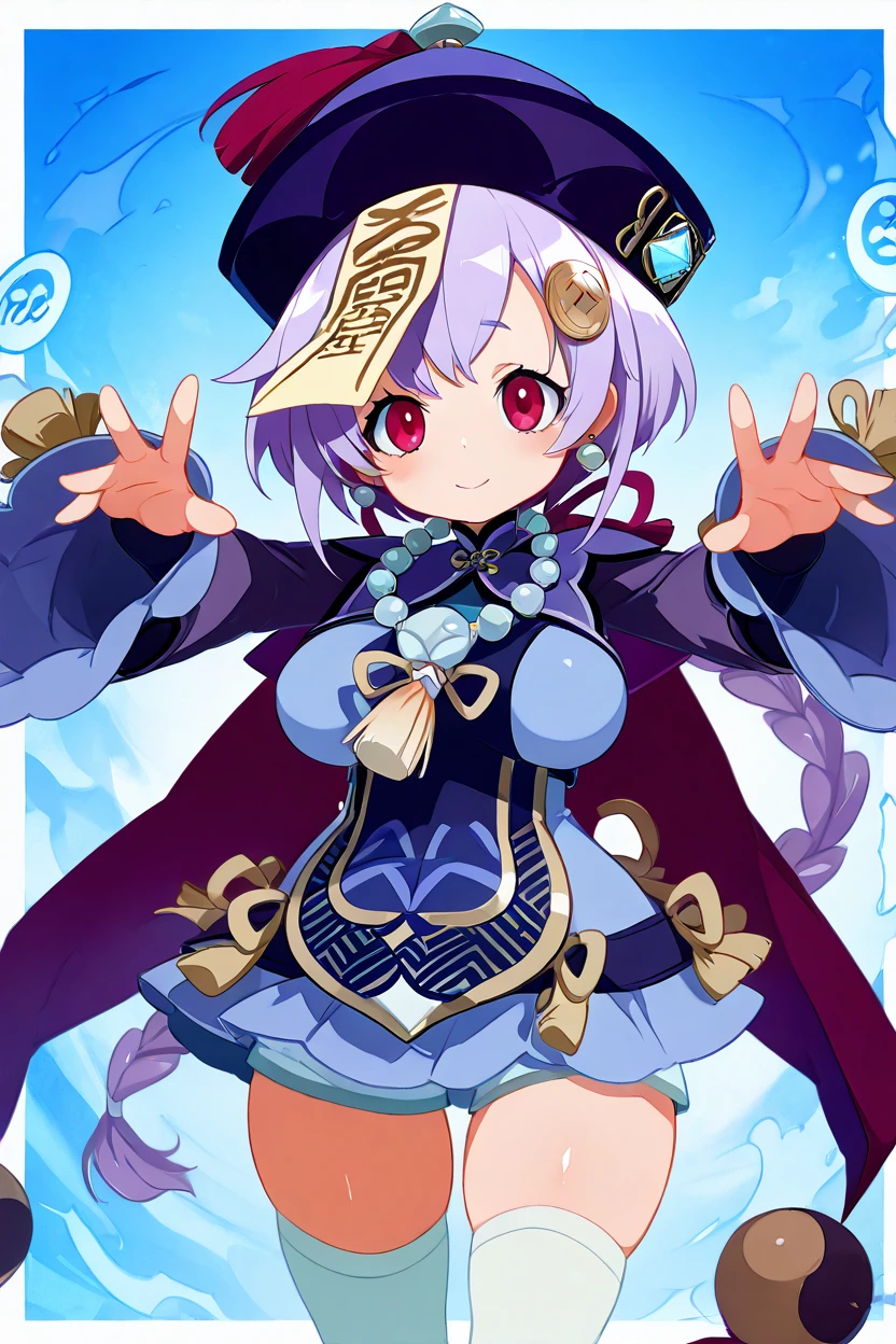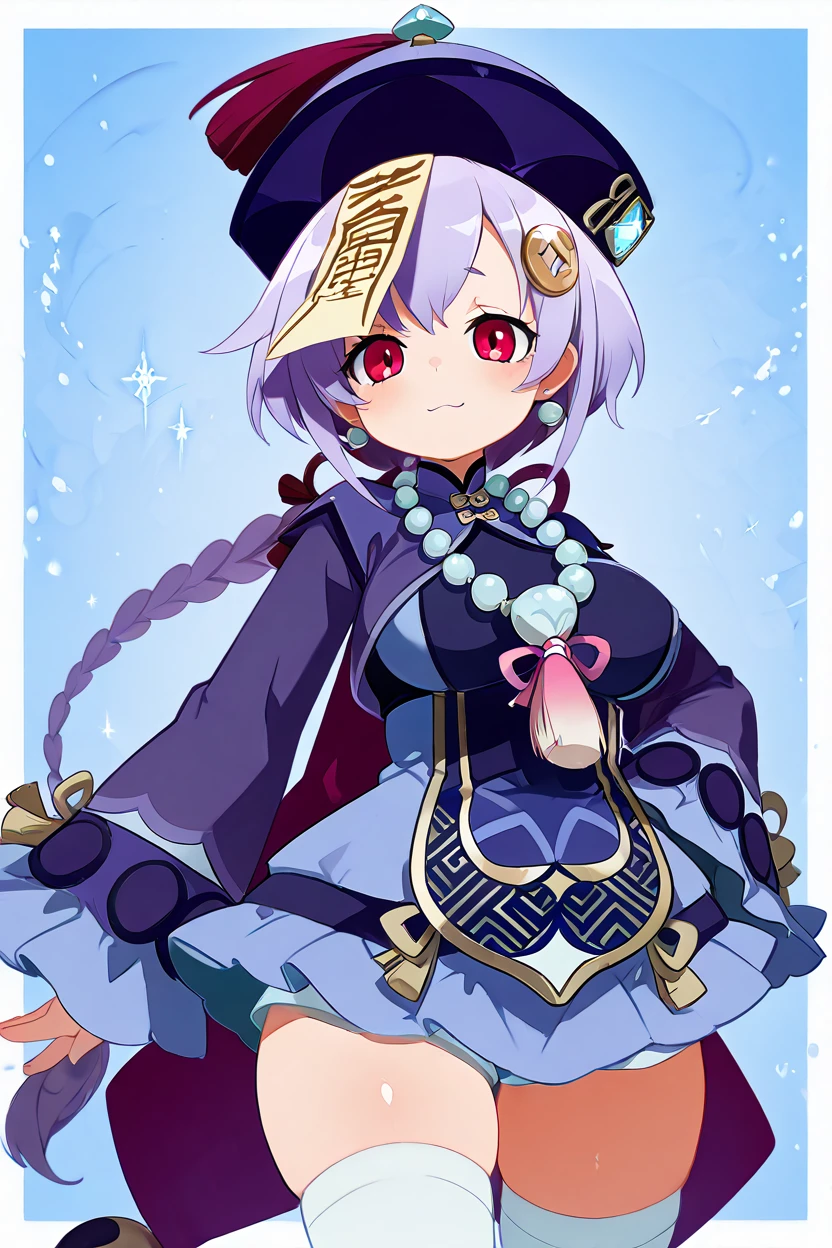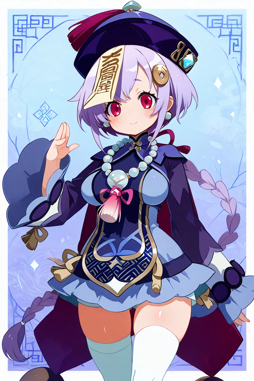 zzQiqi, braid, long hair, red eyes, hair ornament, earrings, ofuda, qingdai guanmao, jiangshi, long sleeves, bead necklace, wide sleeves, white thighhighs, dress,