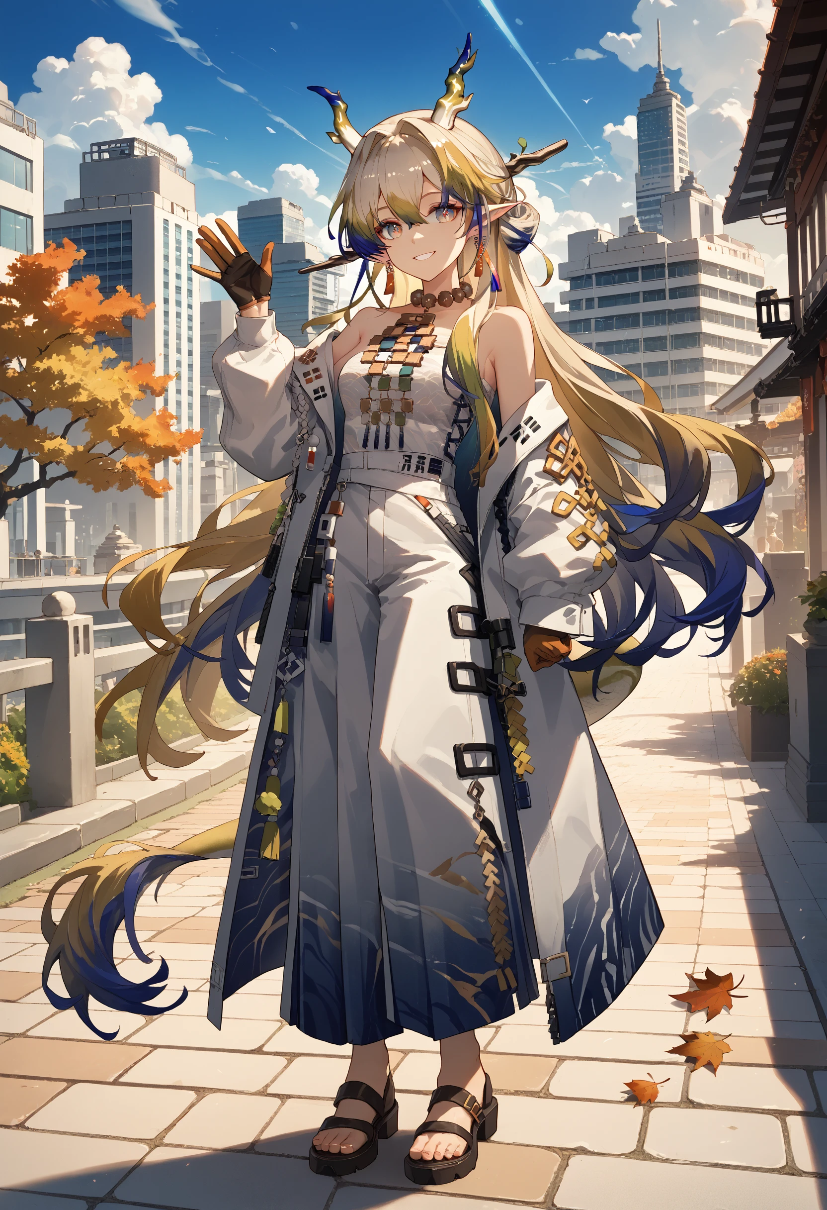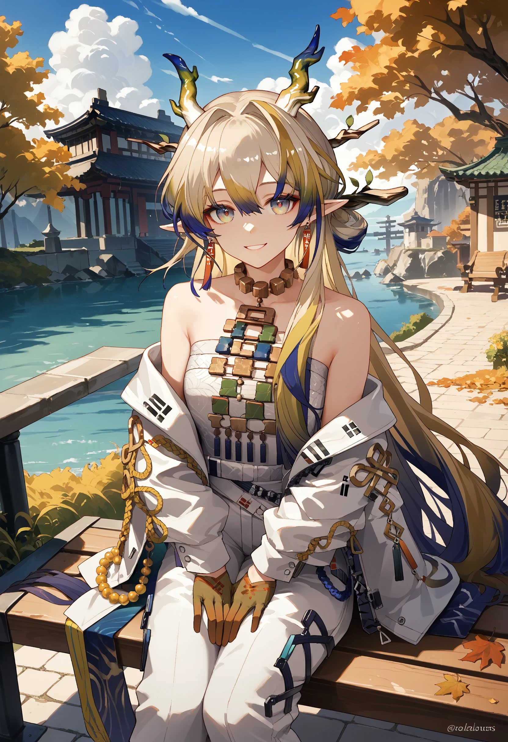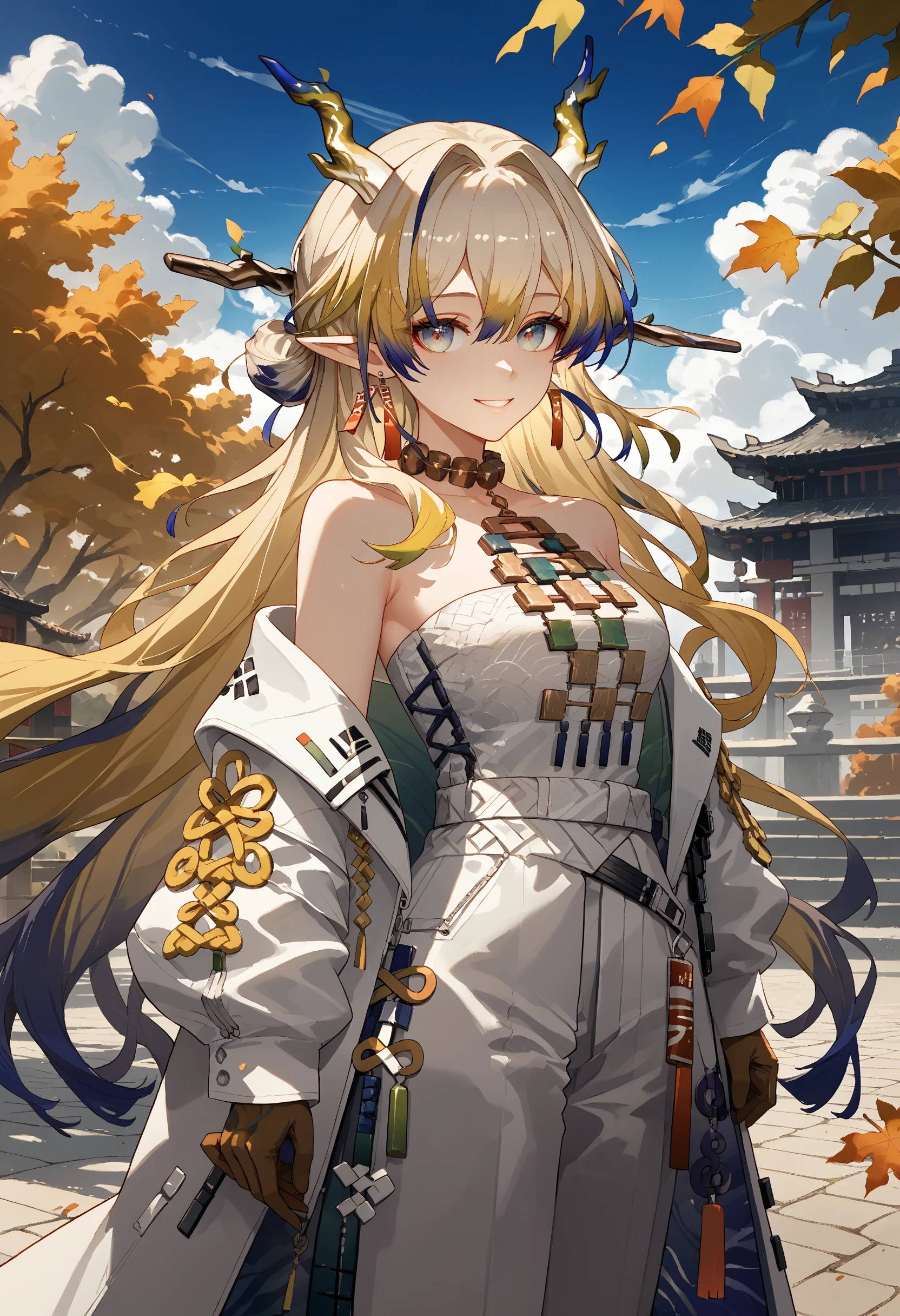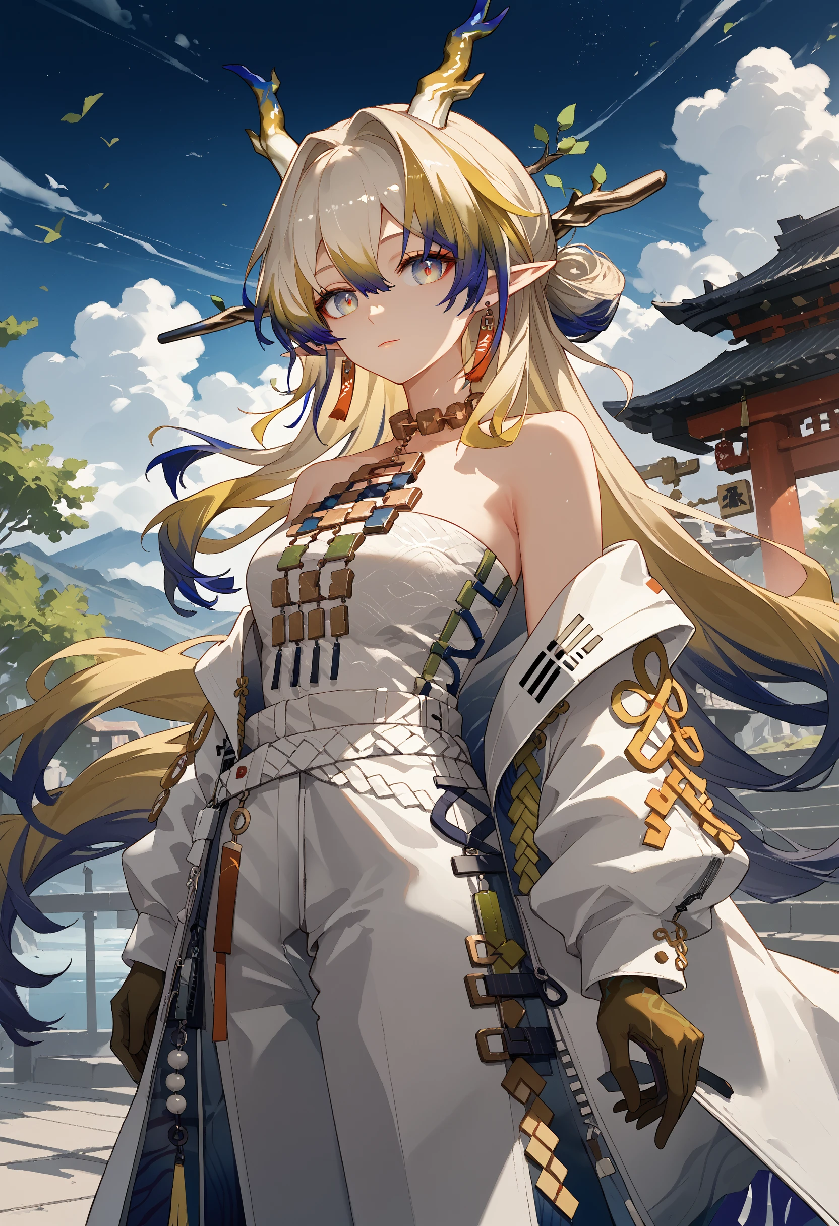 shu_(arknights), 1girl, solo, very long hair, horns, pointy ears, multicolored hair, bare shoulders, off shoulder, blonde hair, multicolored eyes, hair between eyes