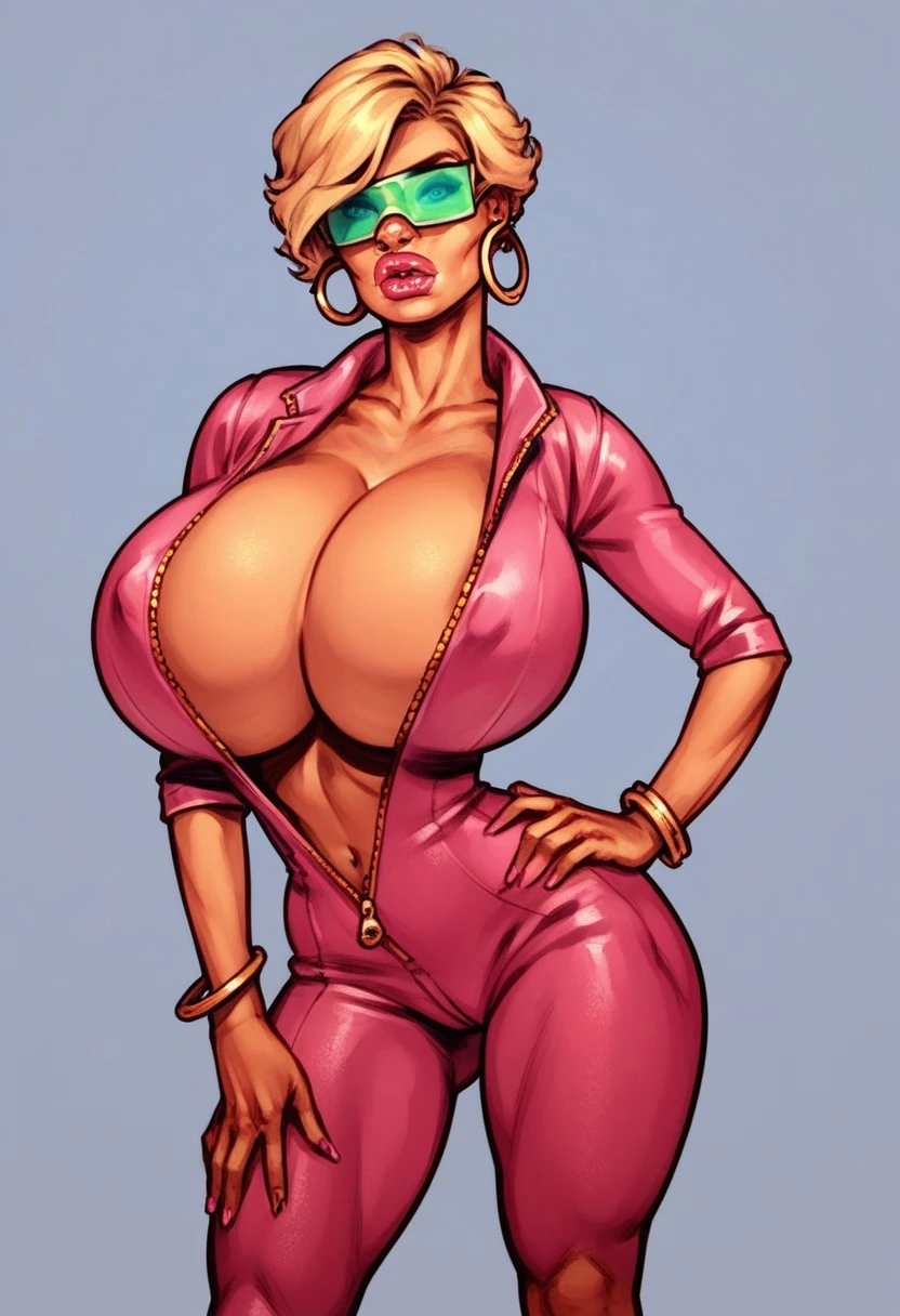 ta_b00m, blonde hair, short hair, blue eyes, thick lips, gigantic breasts, fat , narrow waist, big ass, green_shades, raised_shades, pink_heels, ball_cap,