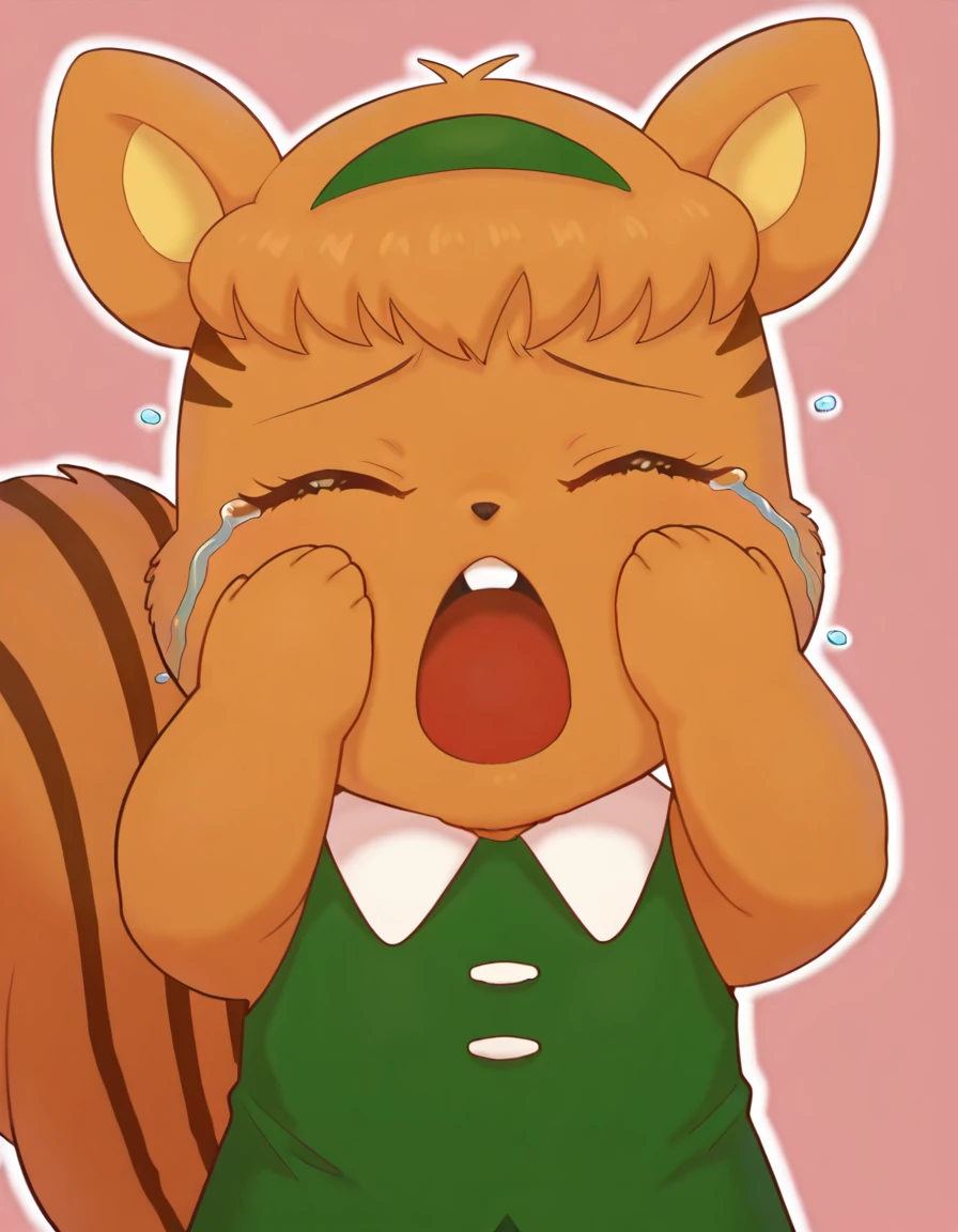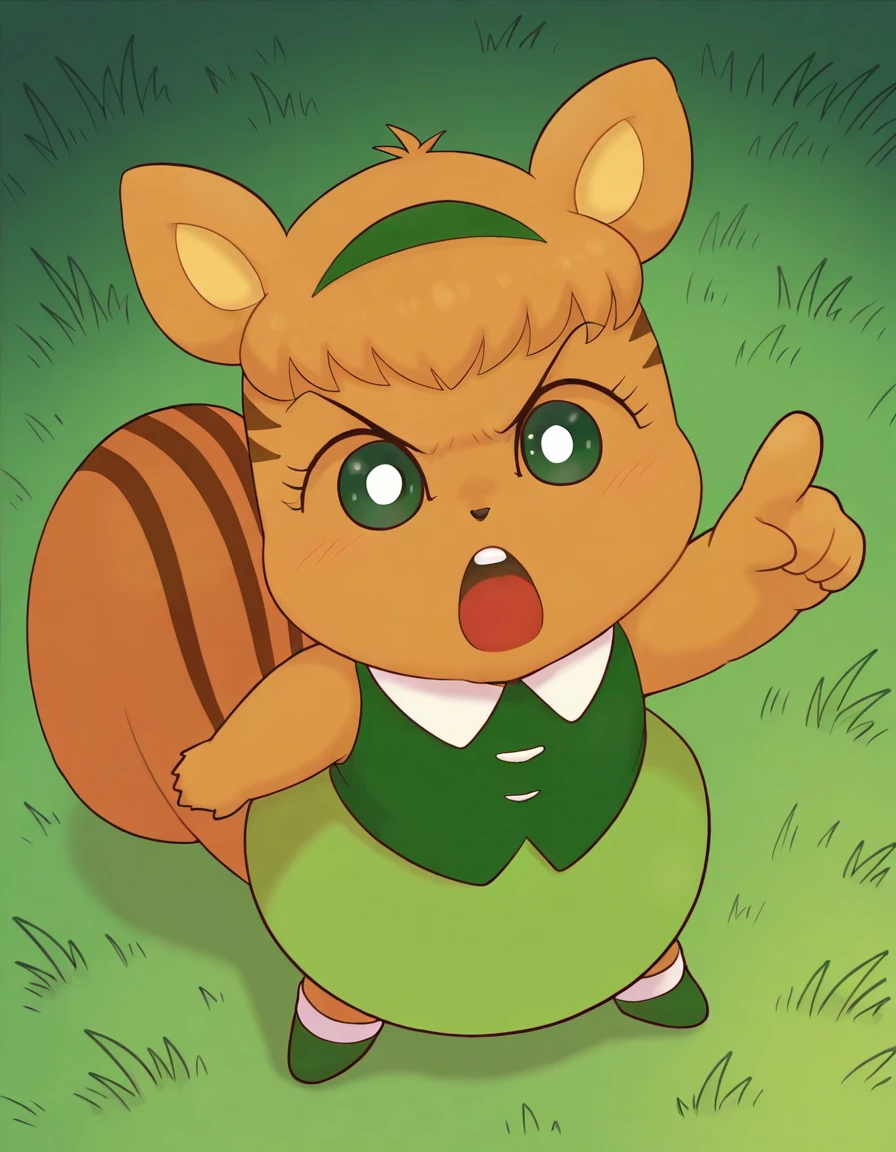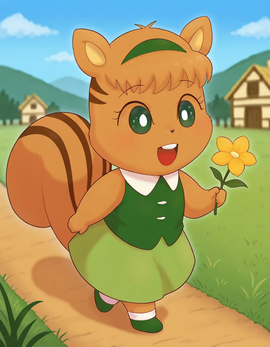 anthro, young, chibi, chipmunk, furry, brown fur, big tail, green hairband, green sleeveless shirt, white collar, light green skirt, white socks, green shoes, white pupils, no sclera, green eyes