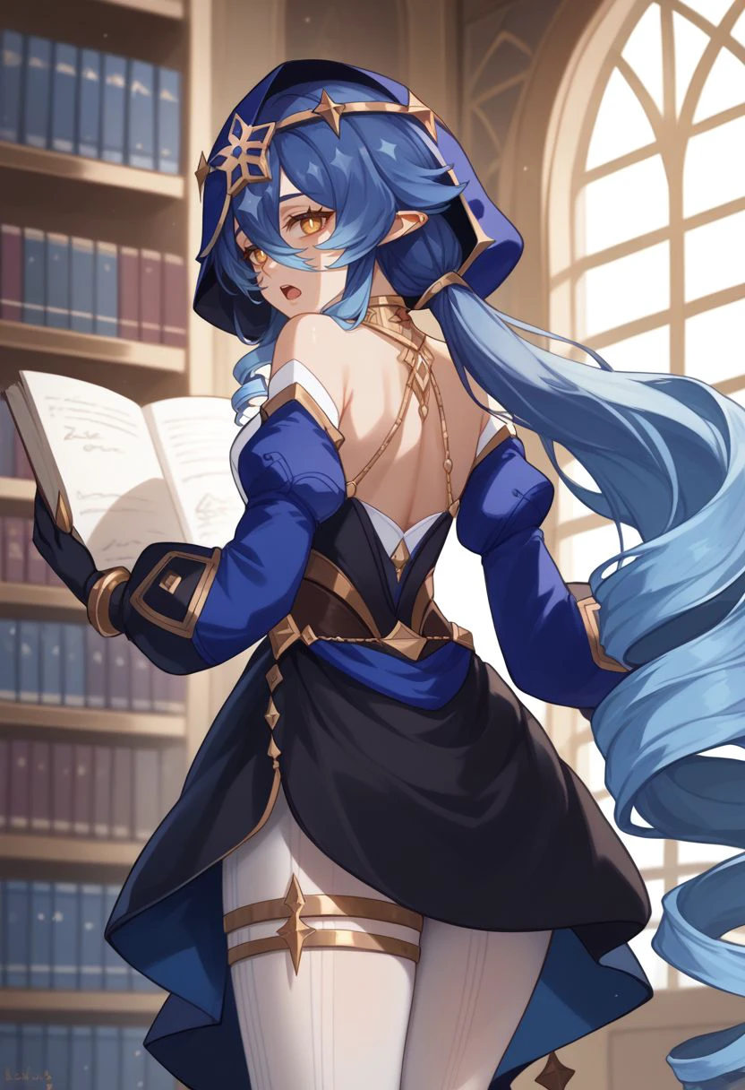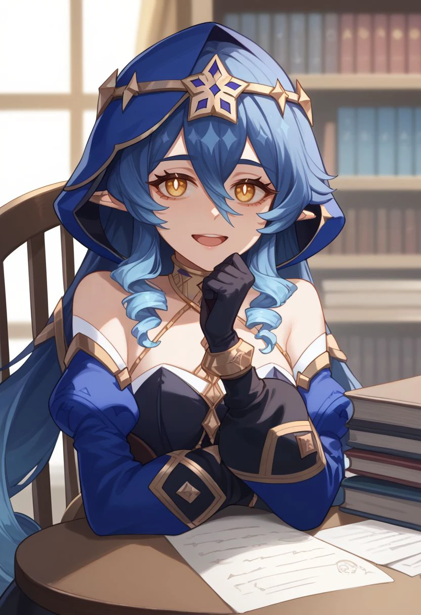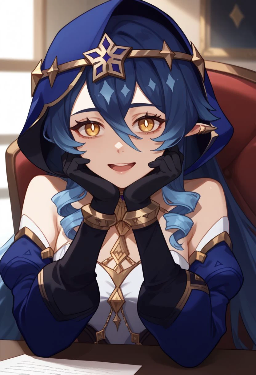 Appearance : layladef, blue hair, yellow eyes, drill hair, hair between eyes, drill sidelocks, twin drills, pointy ears, bags under eyes,