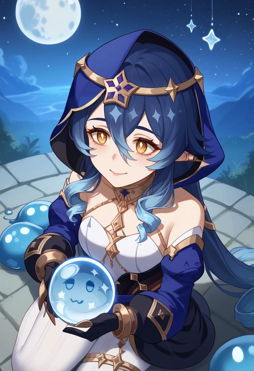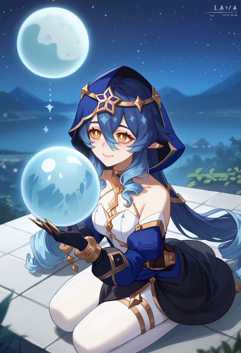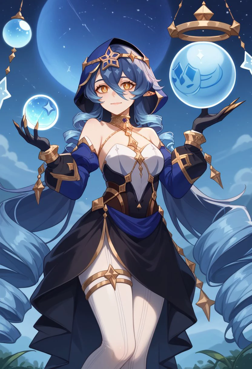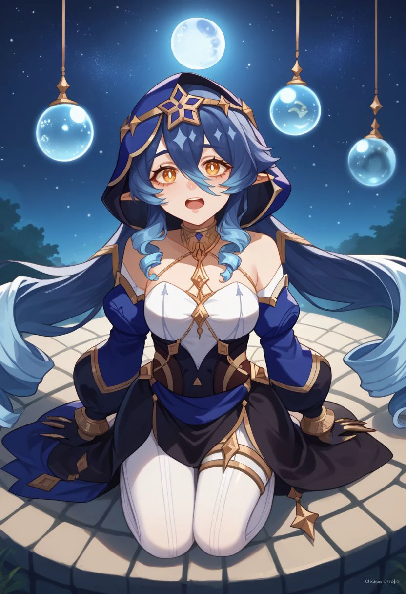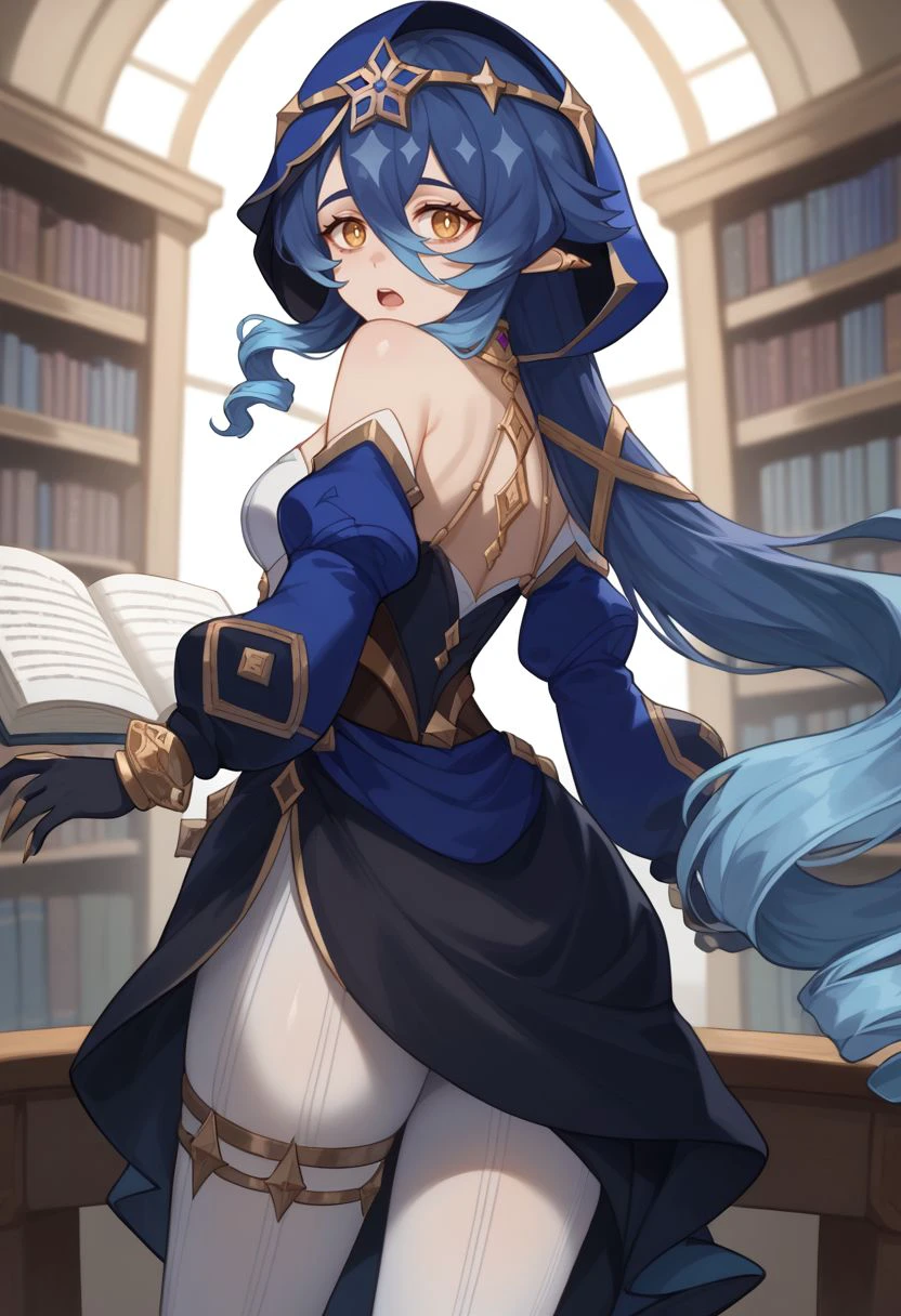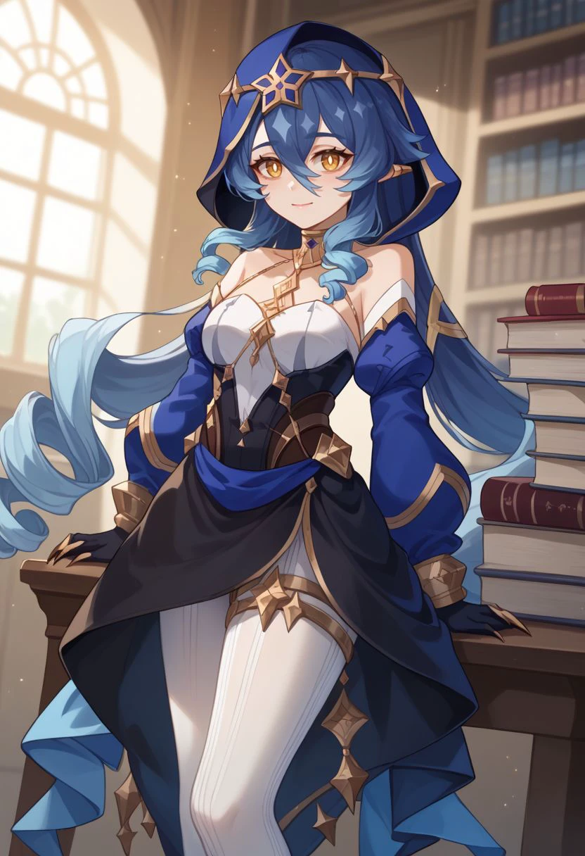 Outfit : blue hood, jewelry, neck ring, bare shoulders, detached sleeves, juliet sleeves, puffy long sleeves, claw ring, black gloves, white pantyhose, thighlet, high heels, gold footwear