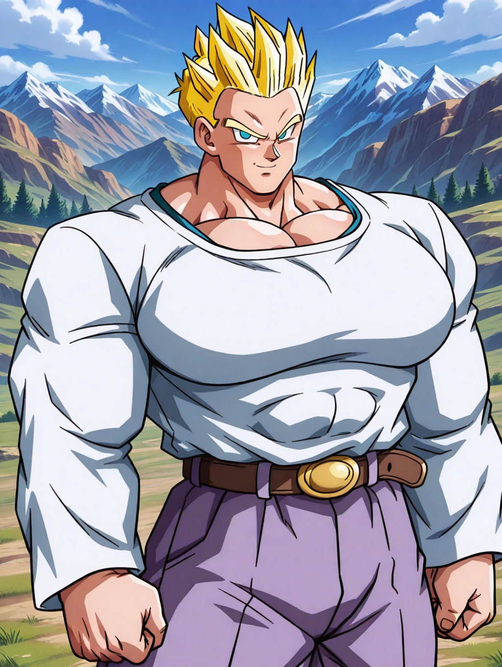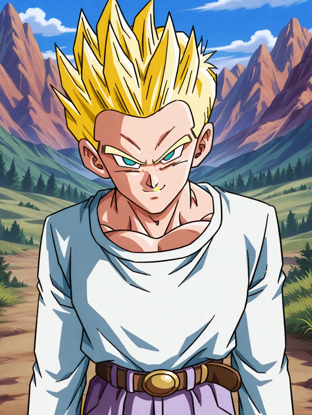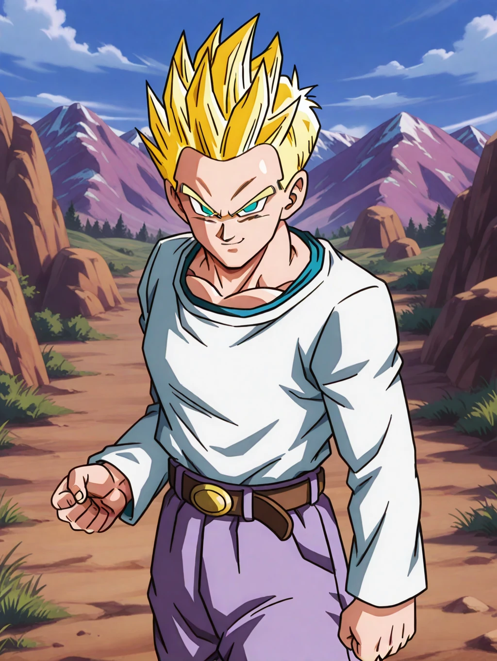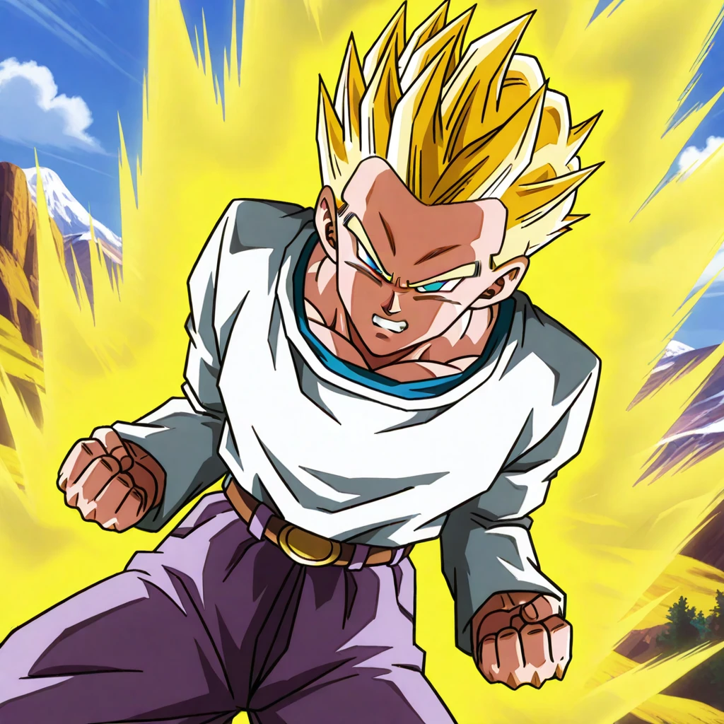 SSGTGoten,1boy,spiked hair,tilted hair,yellow hair,super saiyan,blue eyes,white long sleeved shirt,long sleeves,lavender chino pants,beige brown boots,solo,