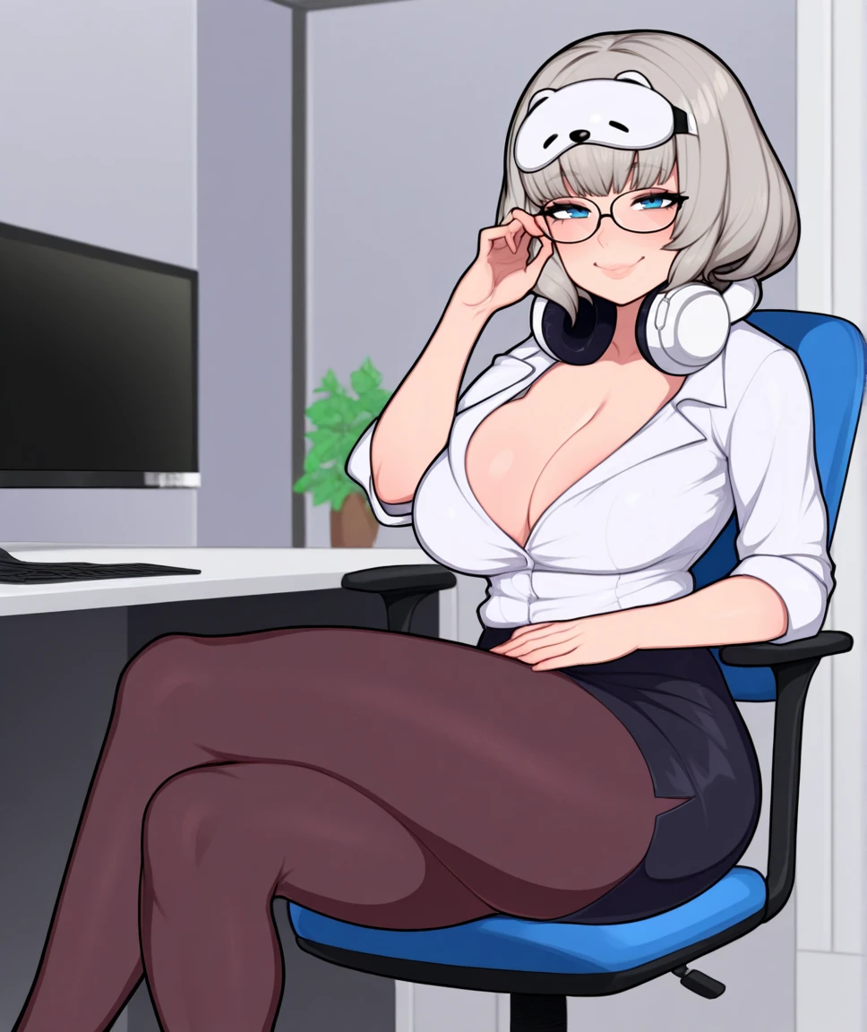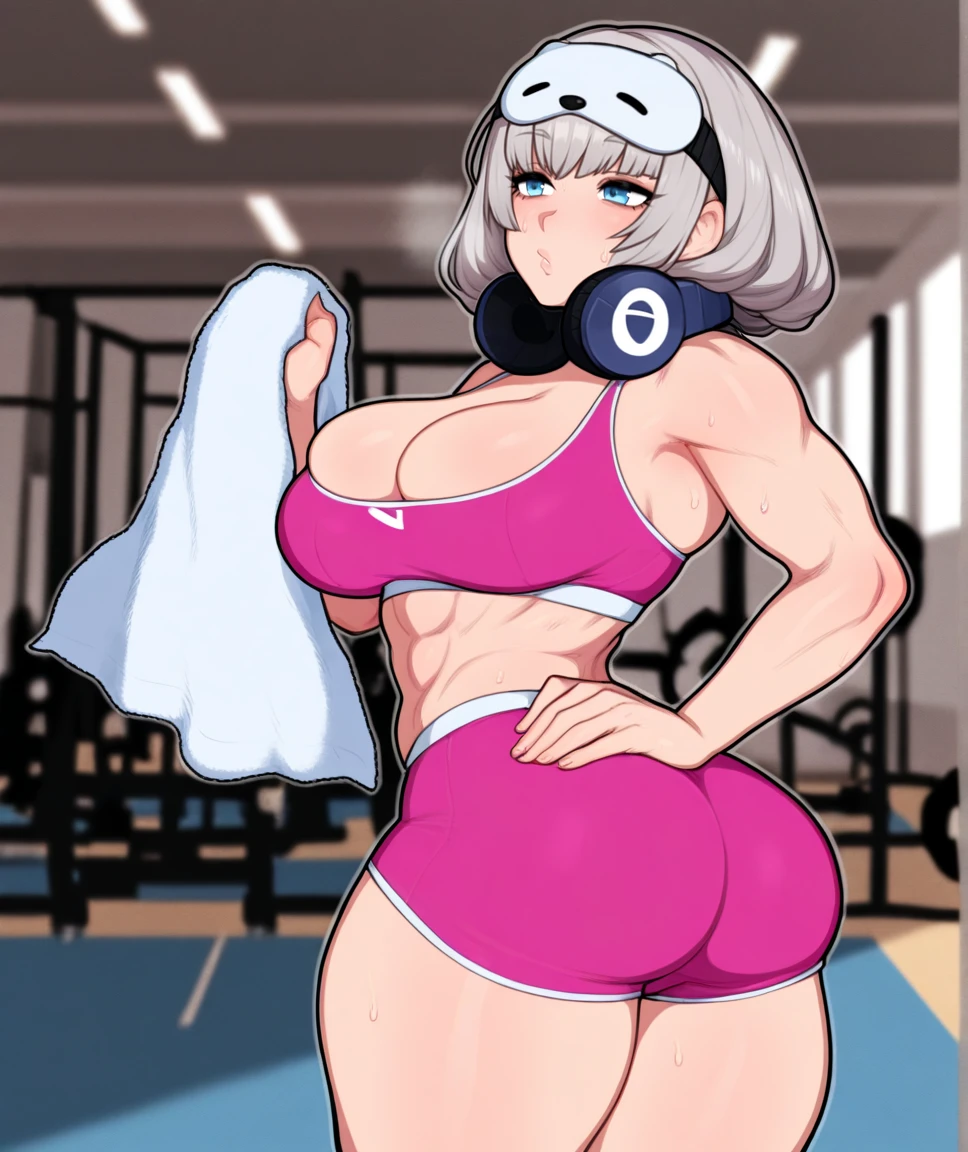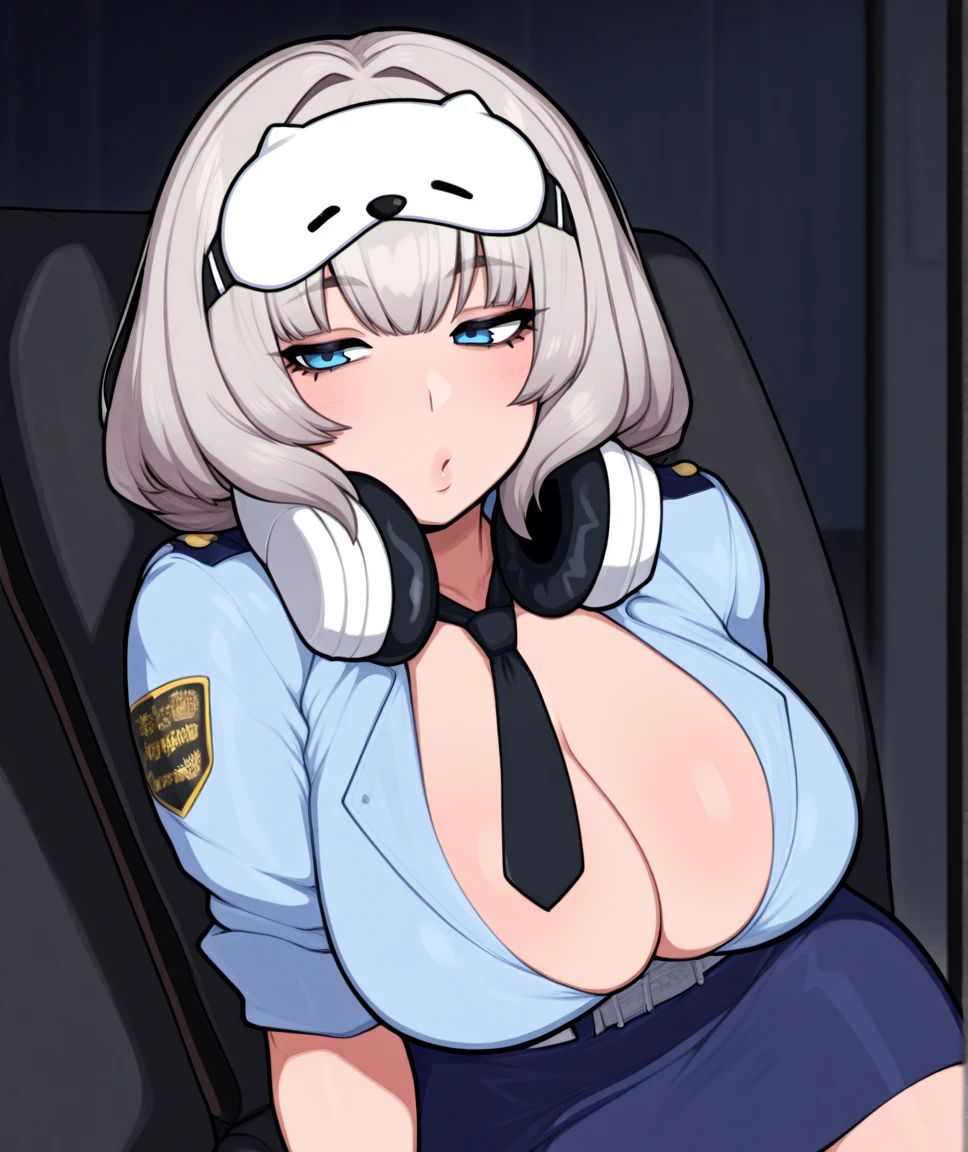1girl, nevenikke, medium hair, grey hair, purple eyes, large breasts