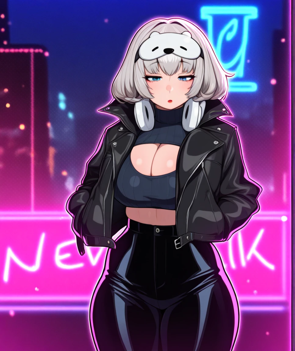 animal hood, sleep mask, bear costume, black bodysuit, shrug (clothing), headphones around neck, hooded coat, long sleeves, fur trim, zipper pull tab, clothes writing, skin tight