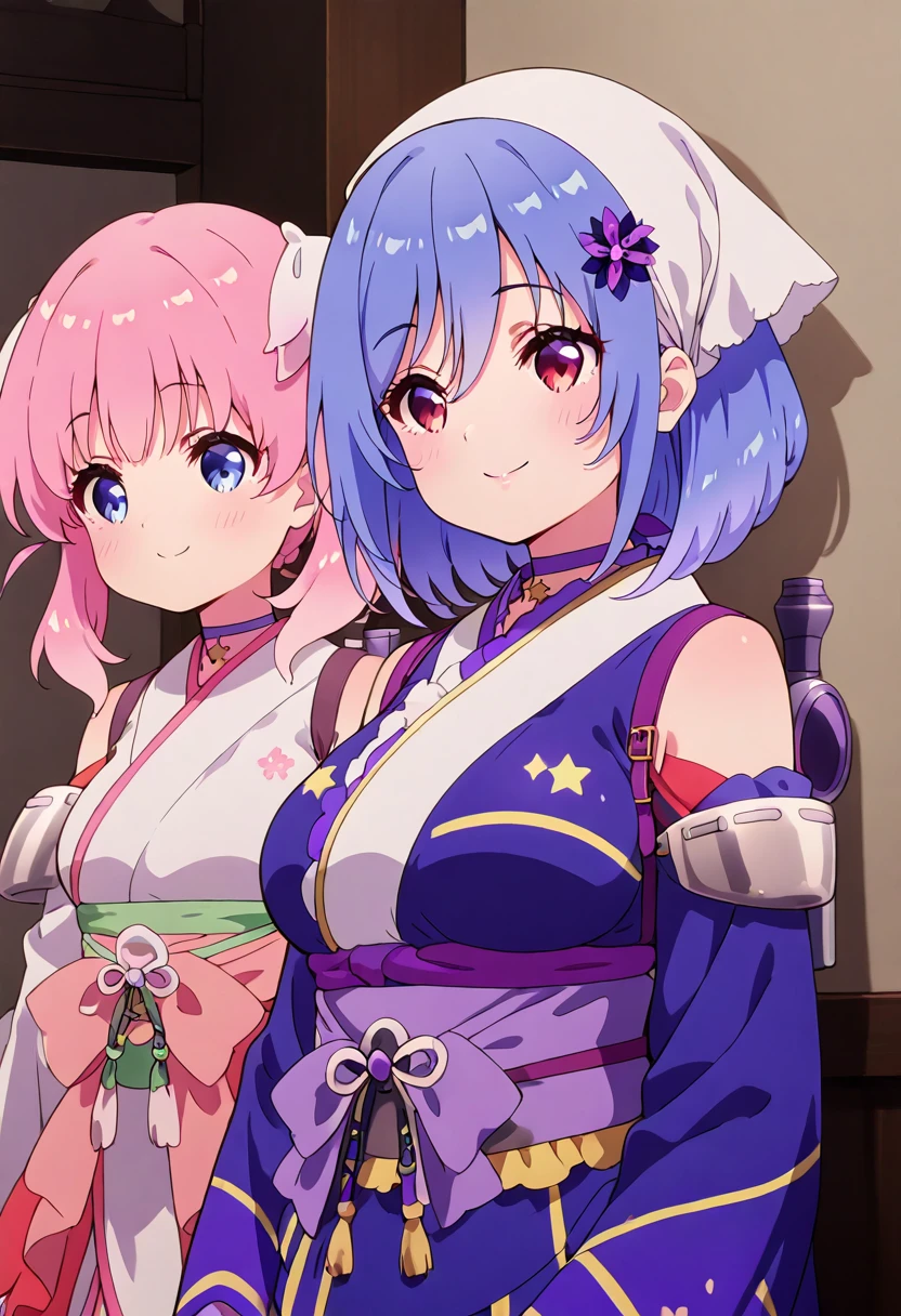 zzHoukiboshi, red eyes, hair between eyes, blue hair, hair flower, hair ornament, short hair, flower, head scarf, japanese clothes, indoors, kimono, choker, portrait, purple kimono, purple choker,