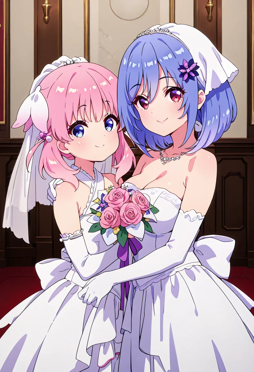 zzHaizakura, blue eyes, pink hair, twintails, medium hair, hair ornament, japanese clothes, kimono, detached sleeves, bare shoulders, white kimono, hair bobbles,