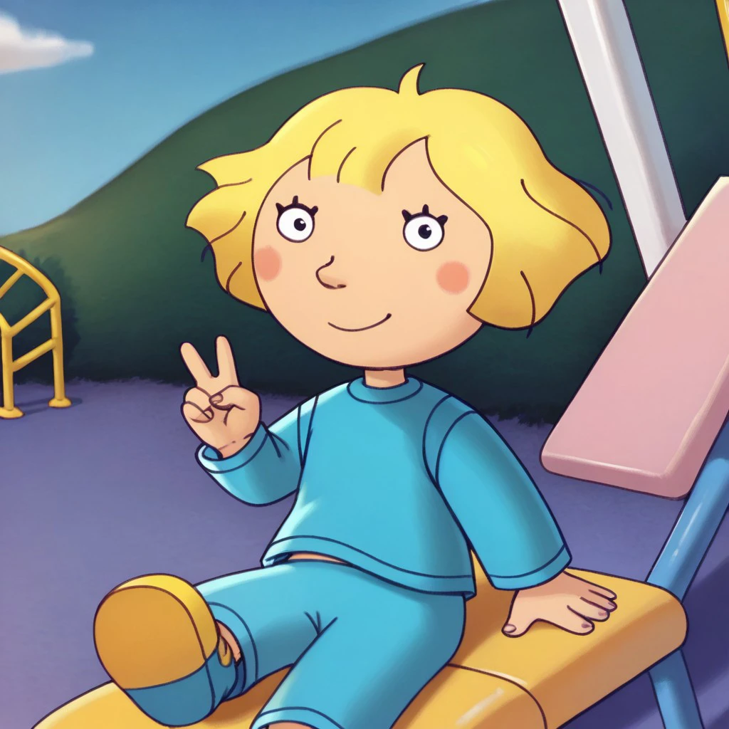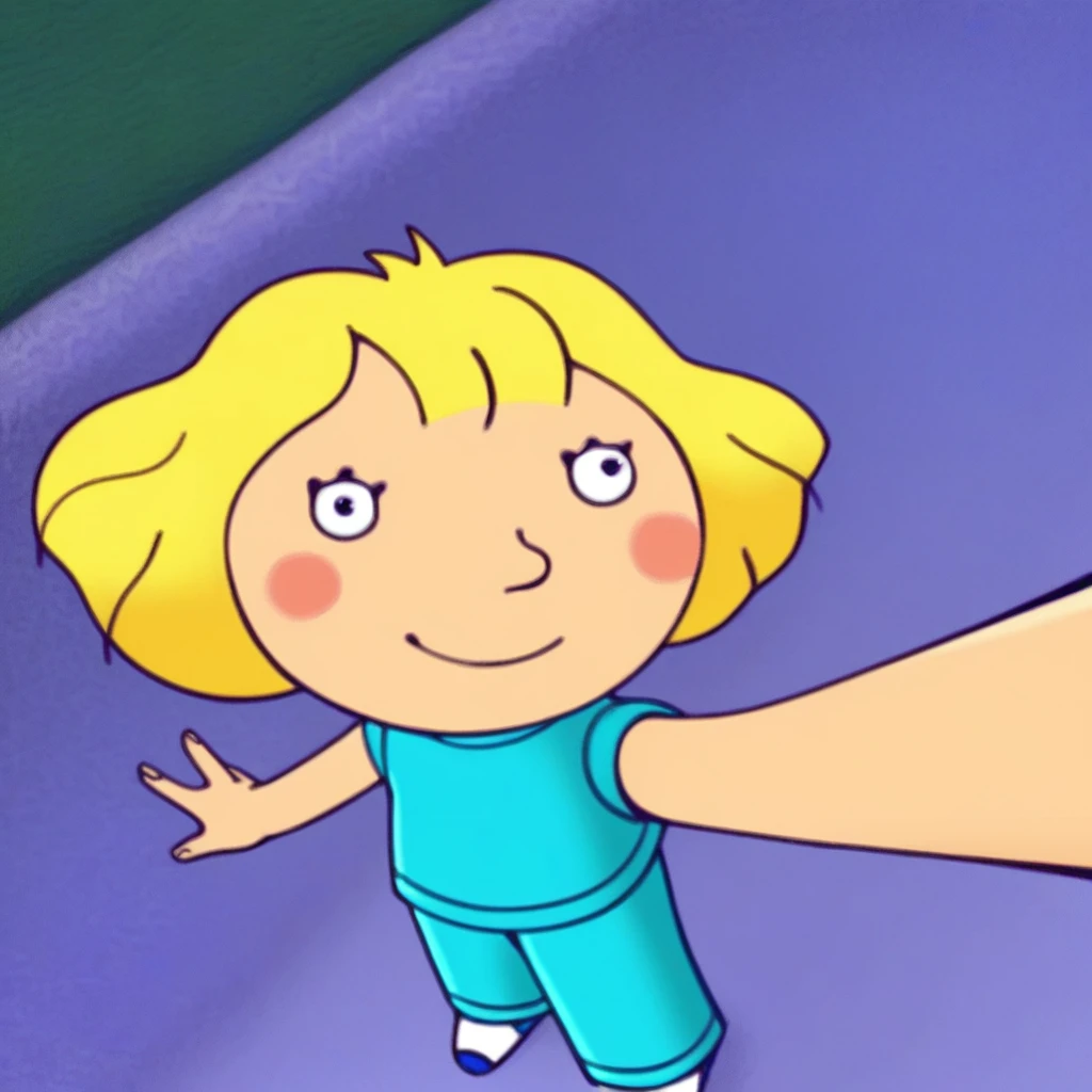 lucy_zl, 1girl, blonde hair, short hair, black eyes, blush stickers, blue shirt, blue pants