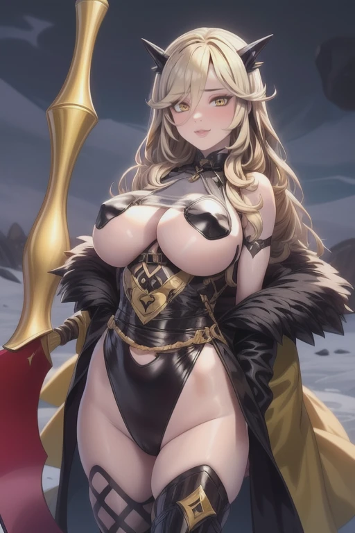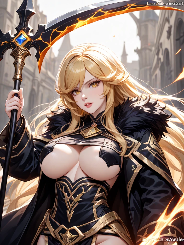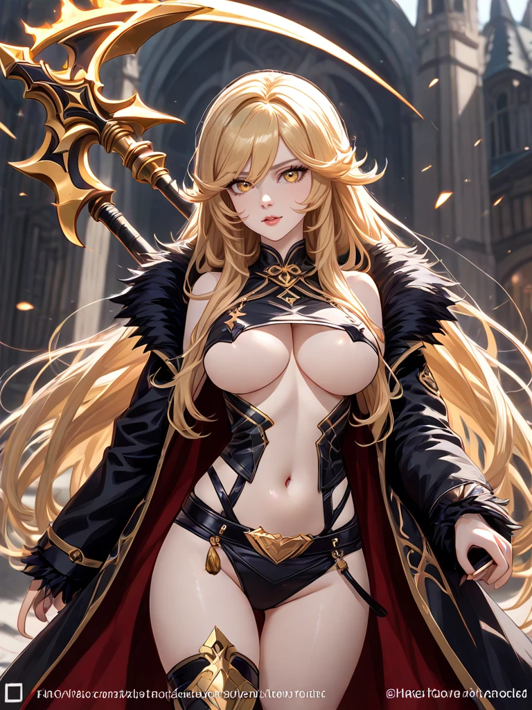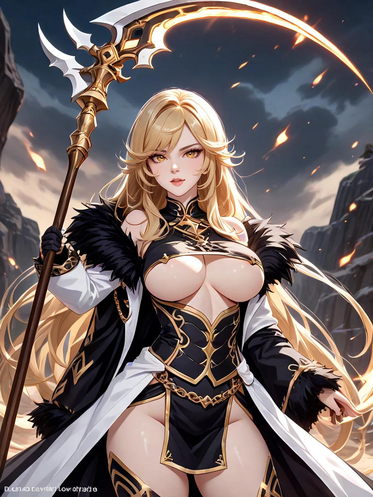long hair, yellow eyes, parted lips, holding forging war scythe, underboobs, open coat, black fur trim coat