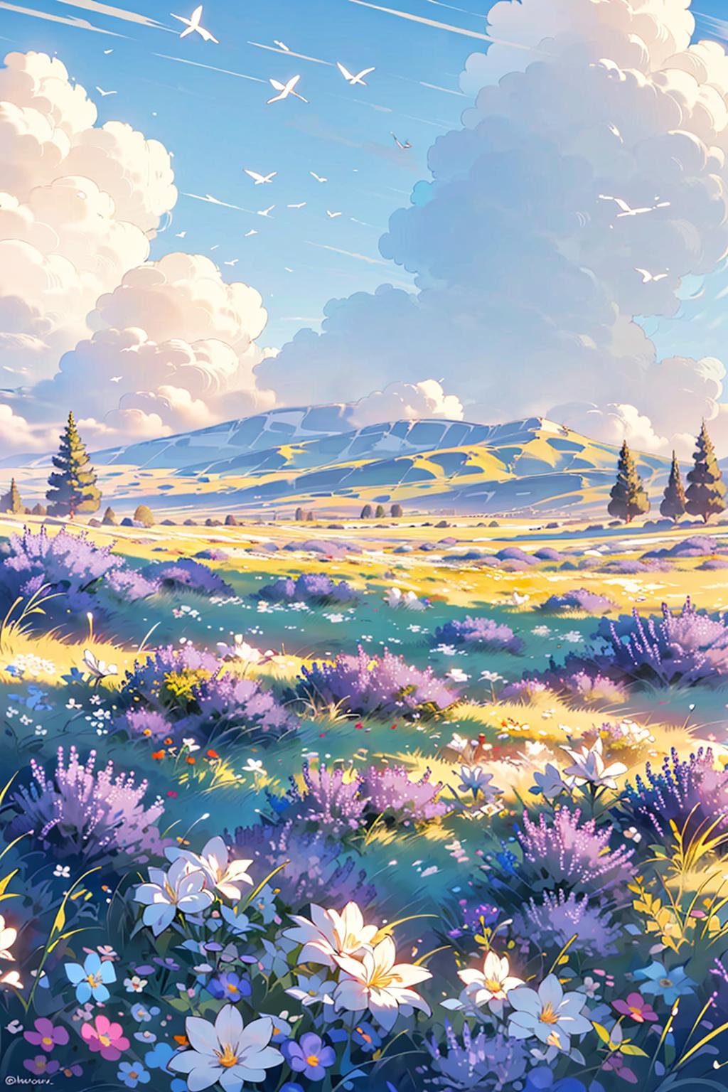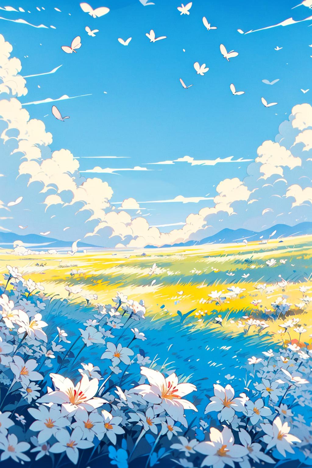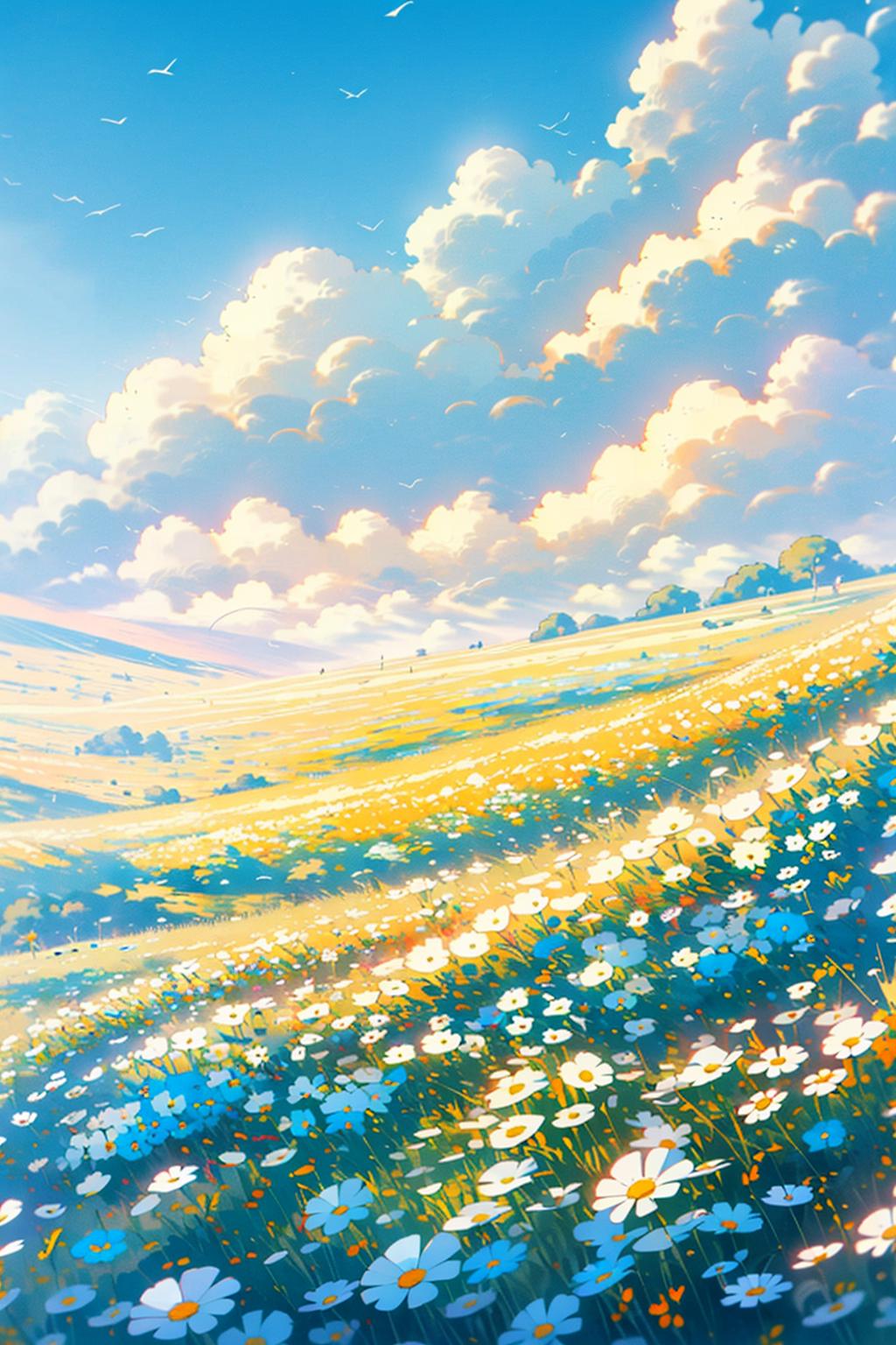 For example flower, landscape, sky, outdoor, clouds, field, no one, flower field, blue sky, day, bird, blue flower, cloudy sky, white flower...