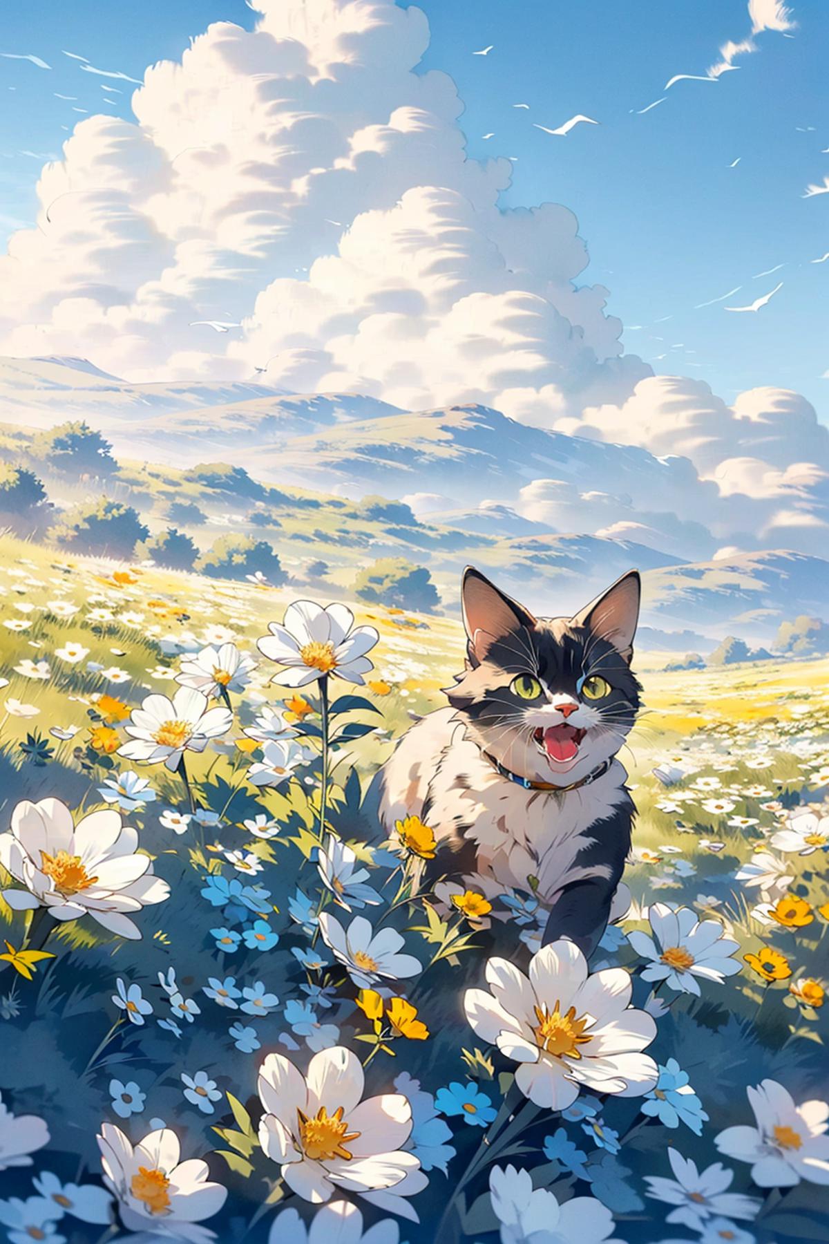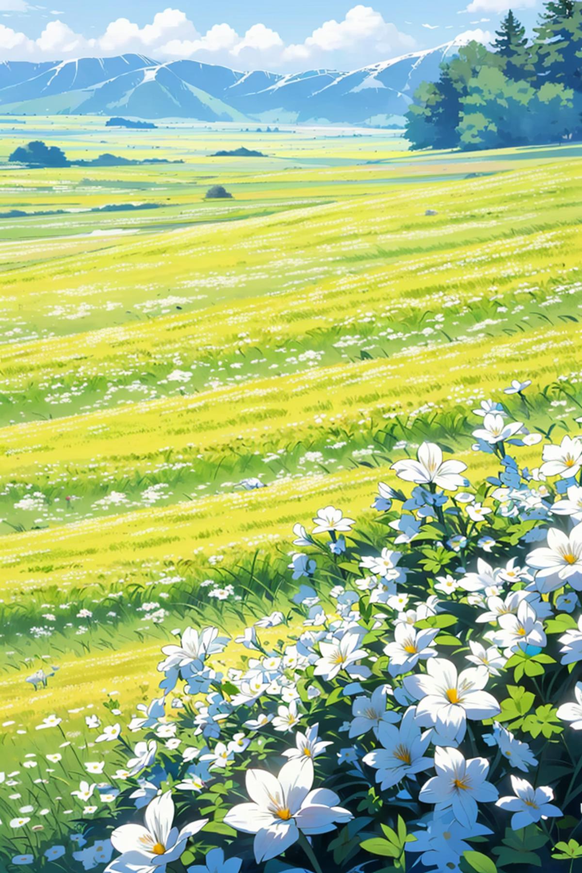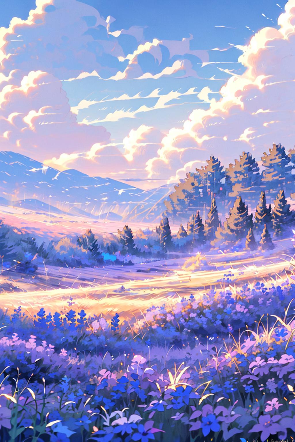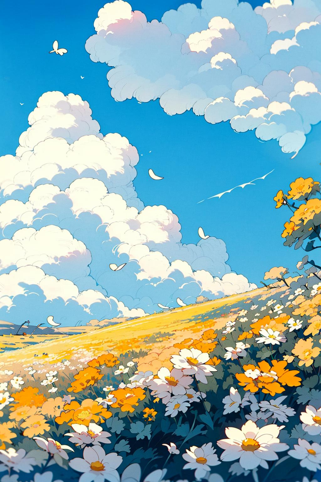 For example flower, landscape, sky, outdoor, clouds, field, no one, flower field, blue sky, day, bird, blue flower, cloudy sky, white flower...