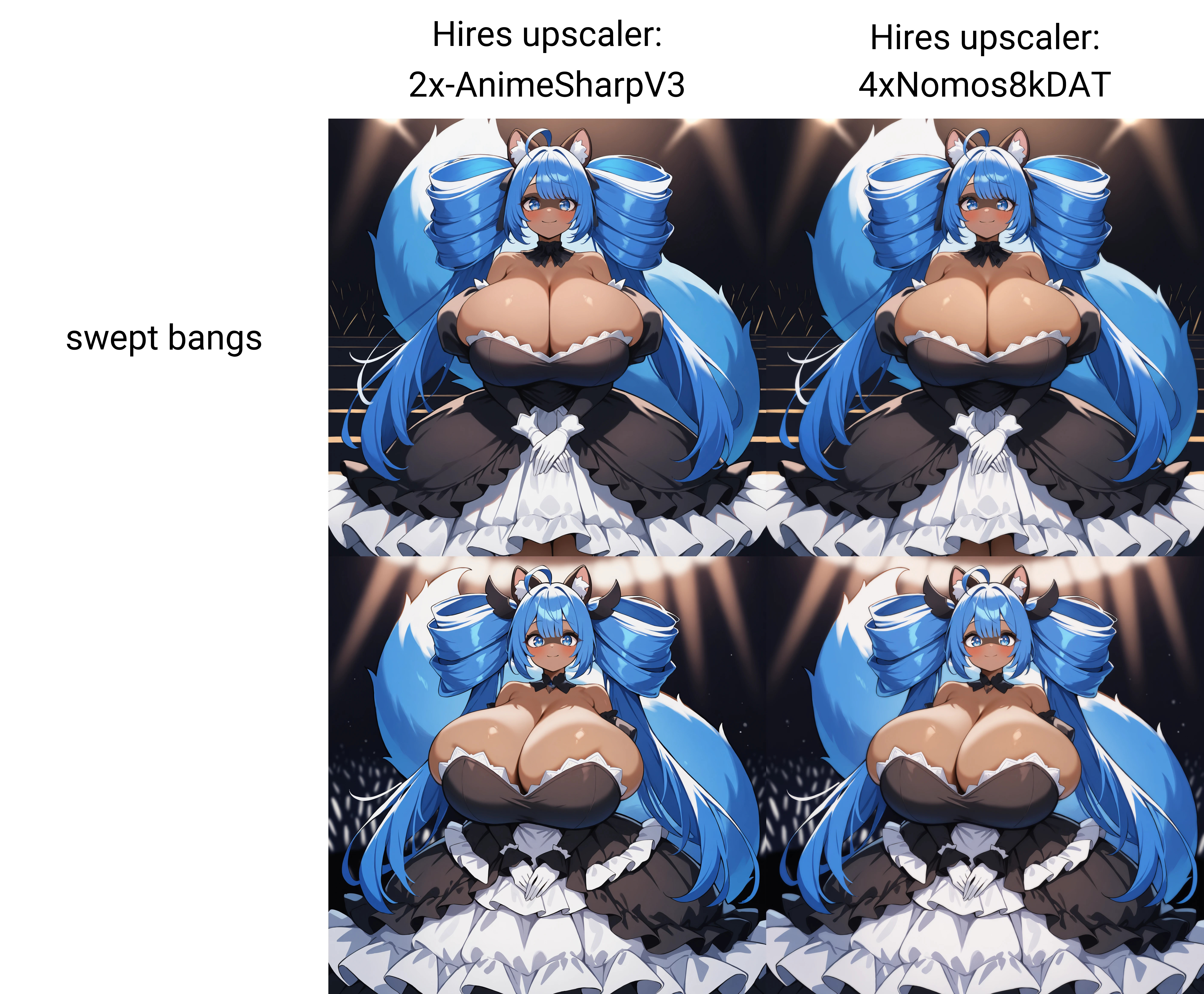 ahoge, swept bangs, very long hair, gradient skin, colored extremities, colored skin, animal ears, animal ear fluff, tail, blue tail, eye maskHelper Negatives: