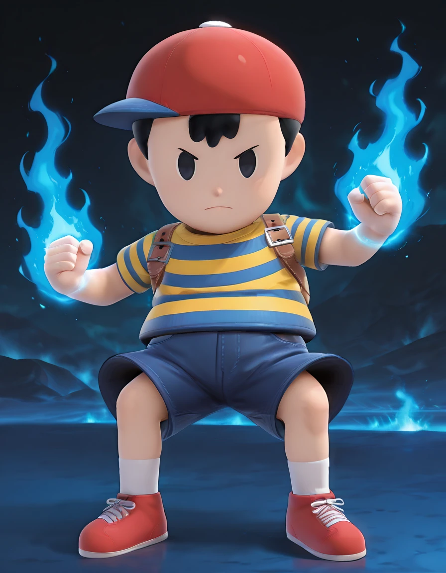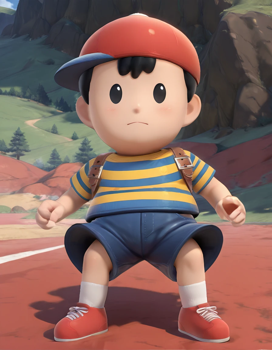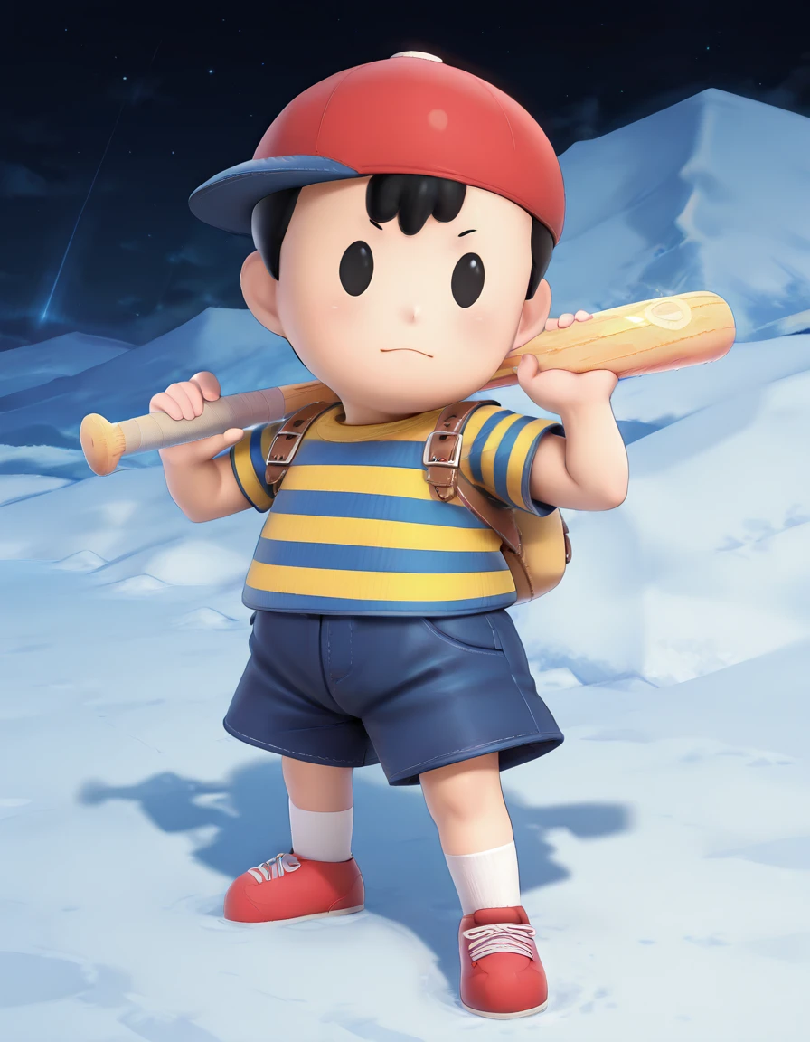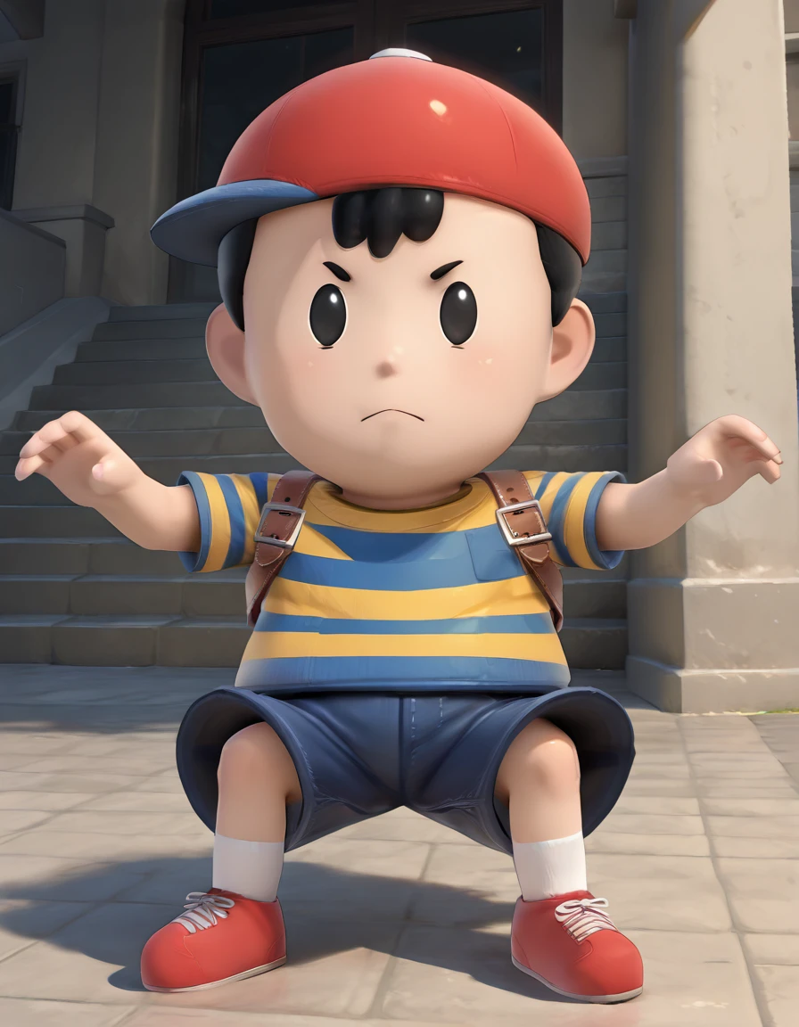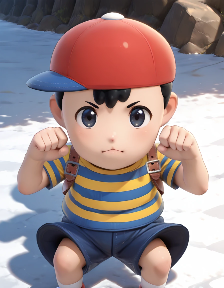 hat, striped shirt, shirt, black hair, shorts, backpack, blue shorts, red baseball cap