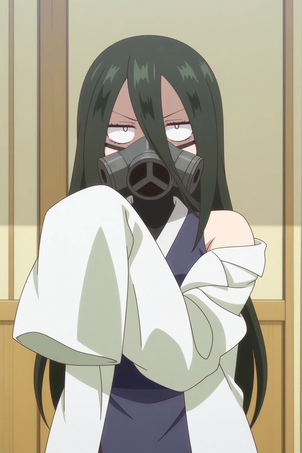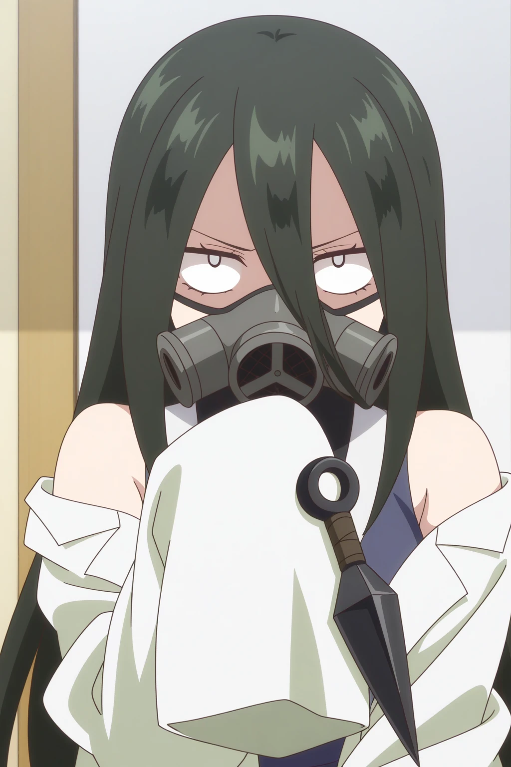 ninja, kunai, gas mask, sleeves past fingers, spikes, lab coat