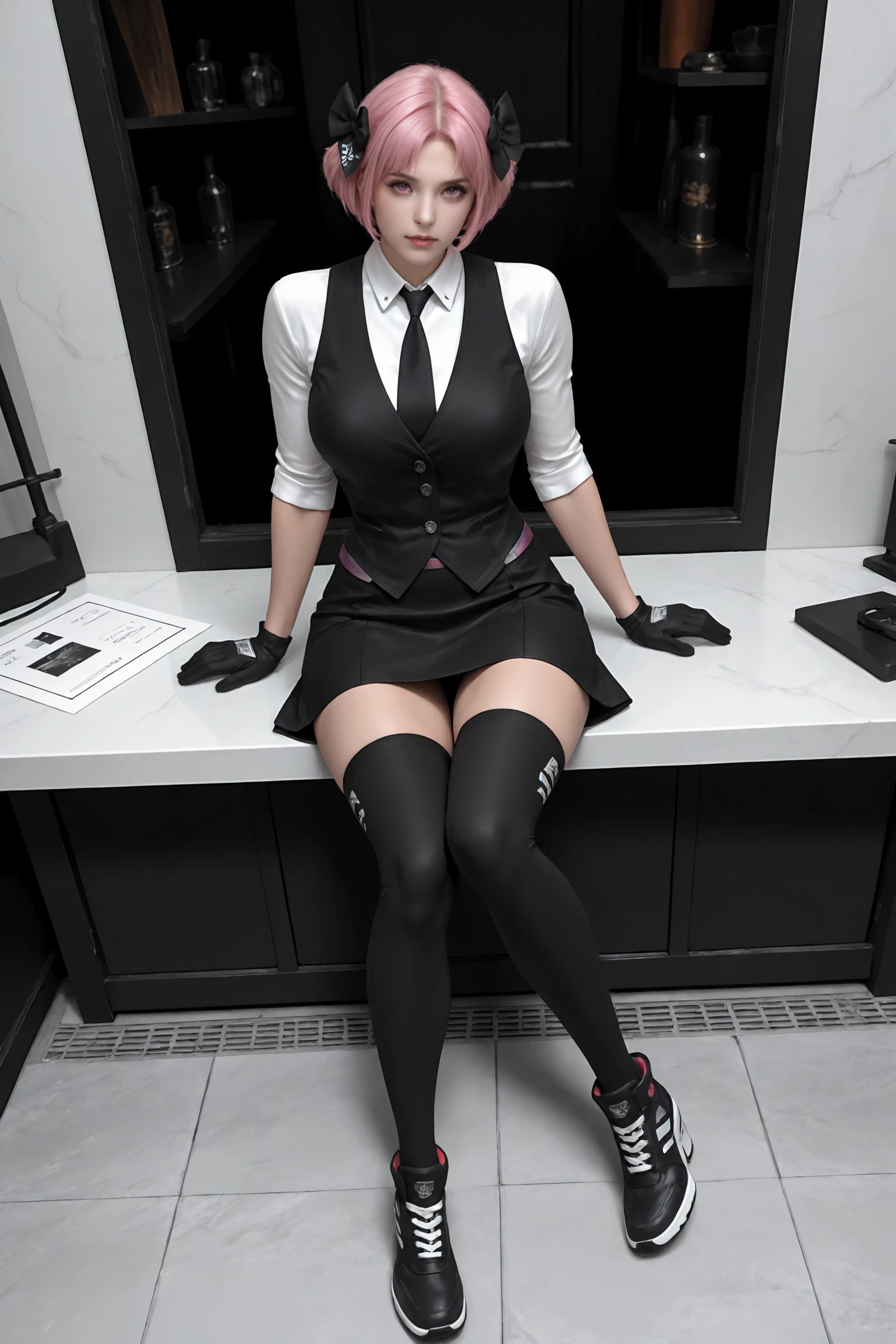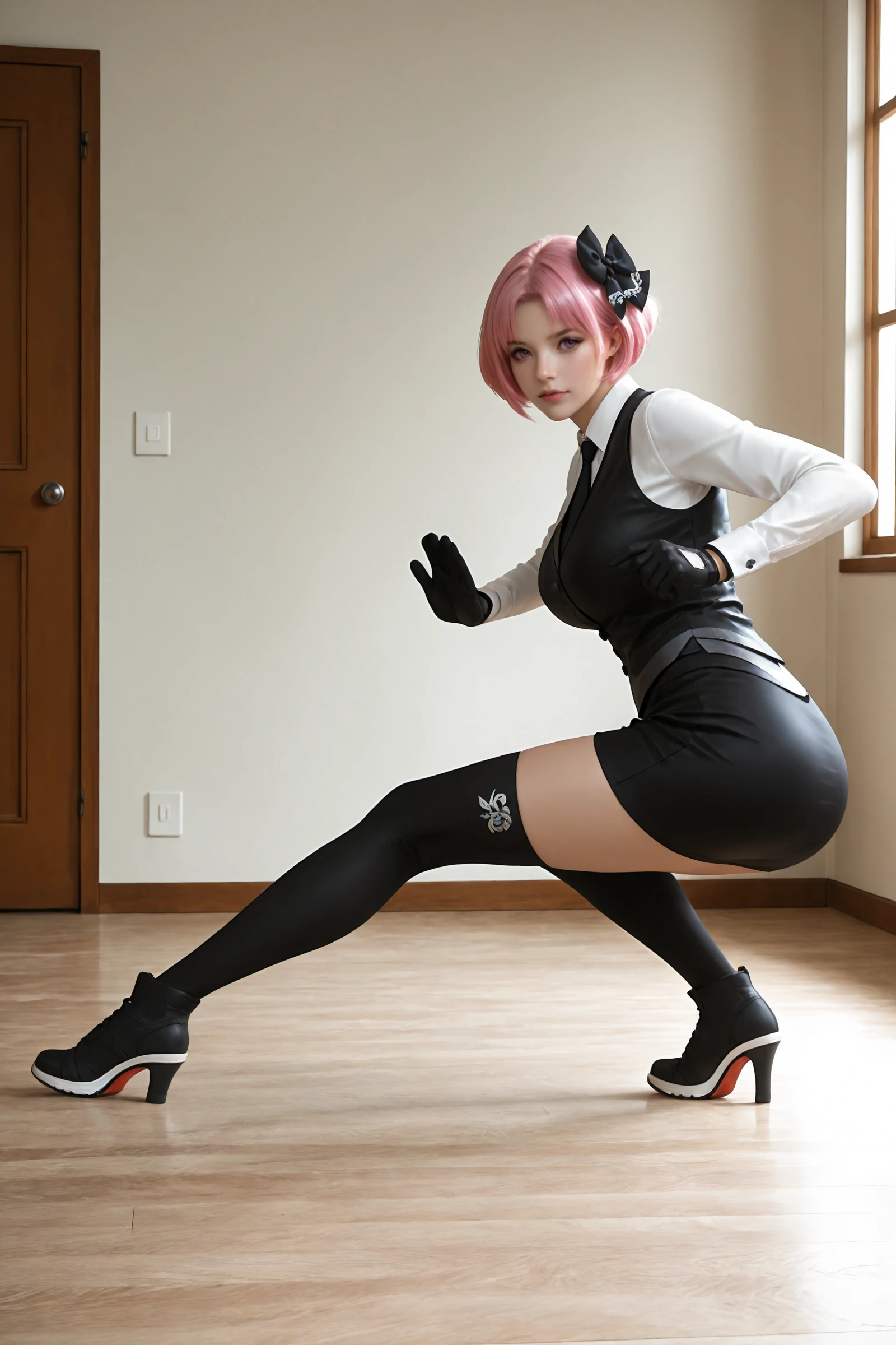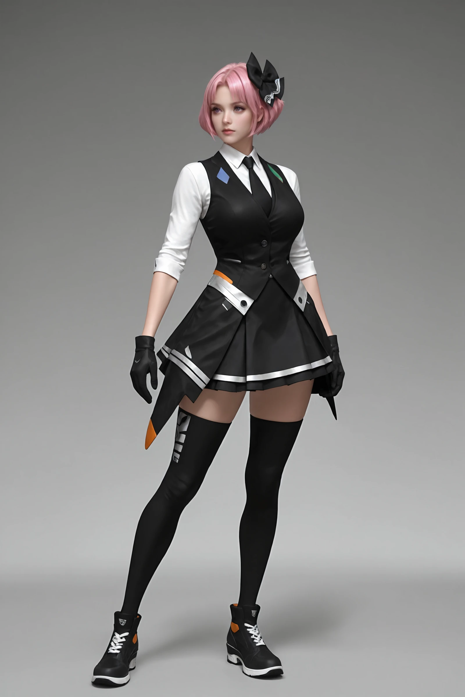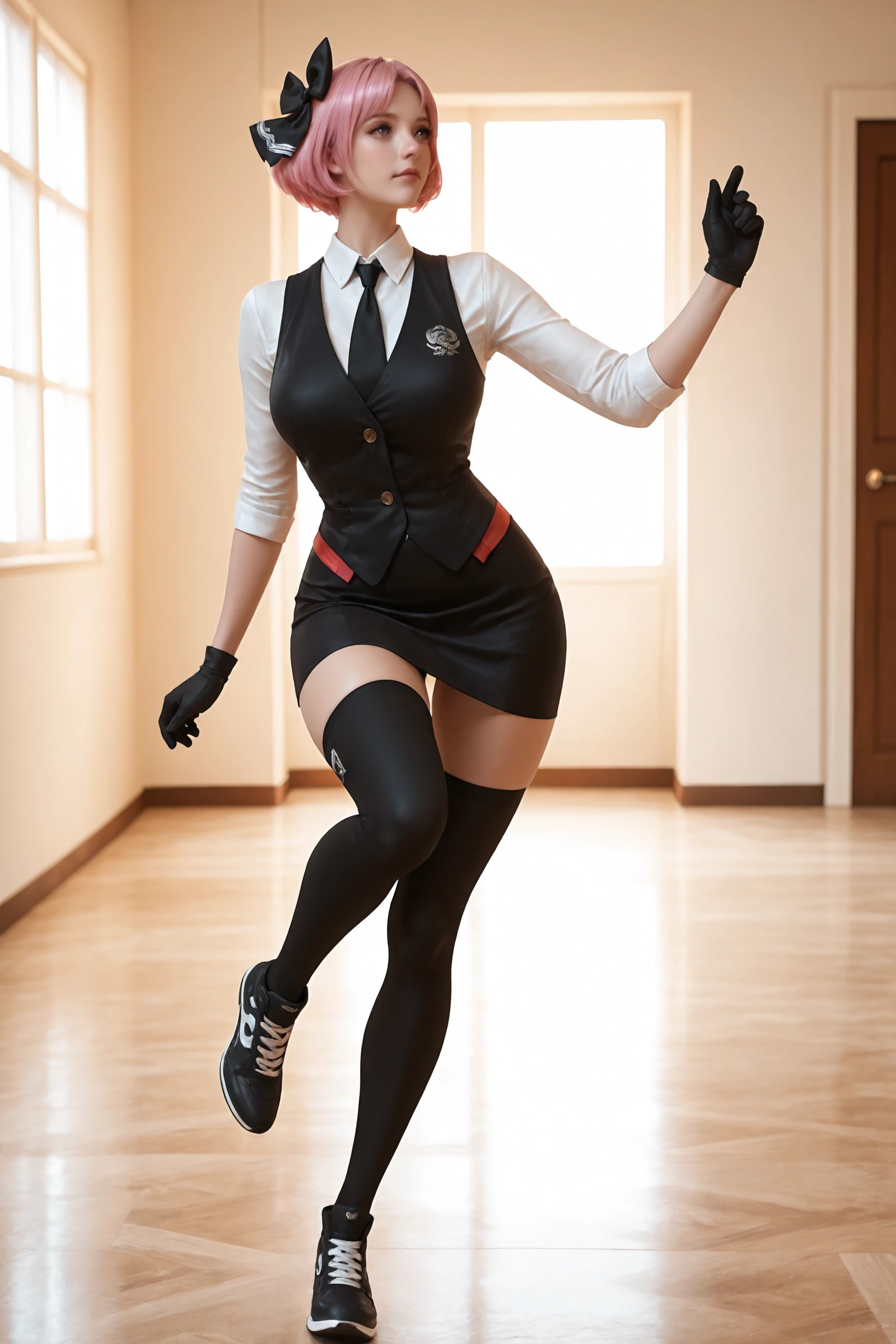 short_hair,pink_hair,hair_bow, large_breasts,necktie, collared_shirt,vest,black_gloves,skirt,black_thighhighs, black_footwear,sneakers,high_heels,