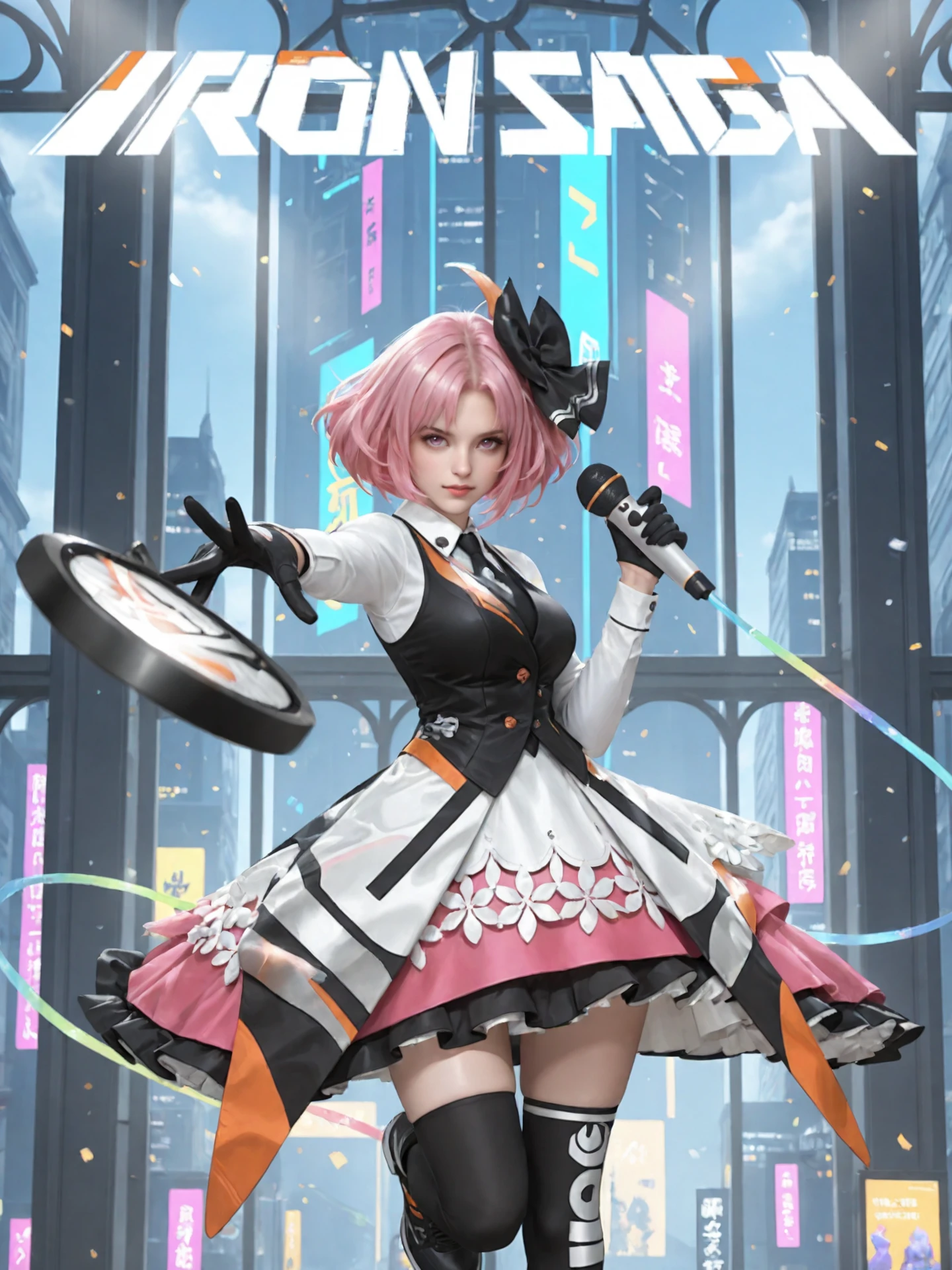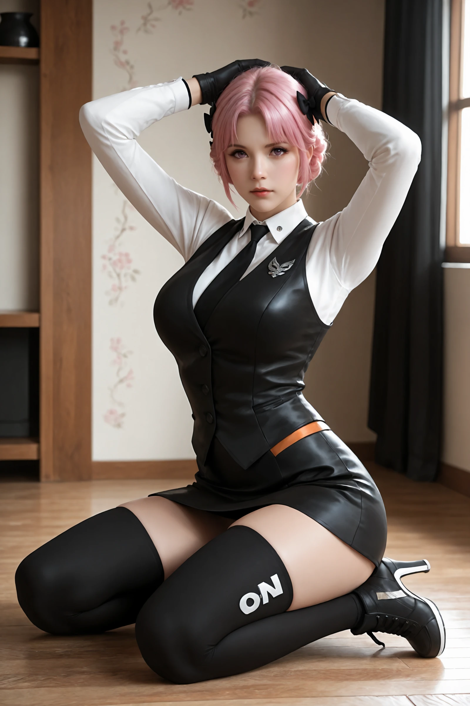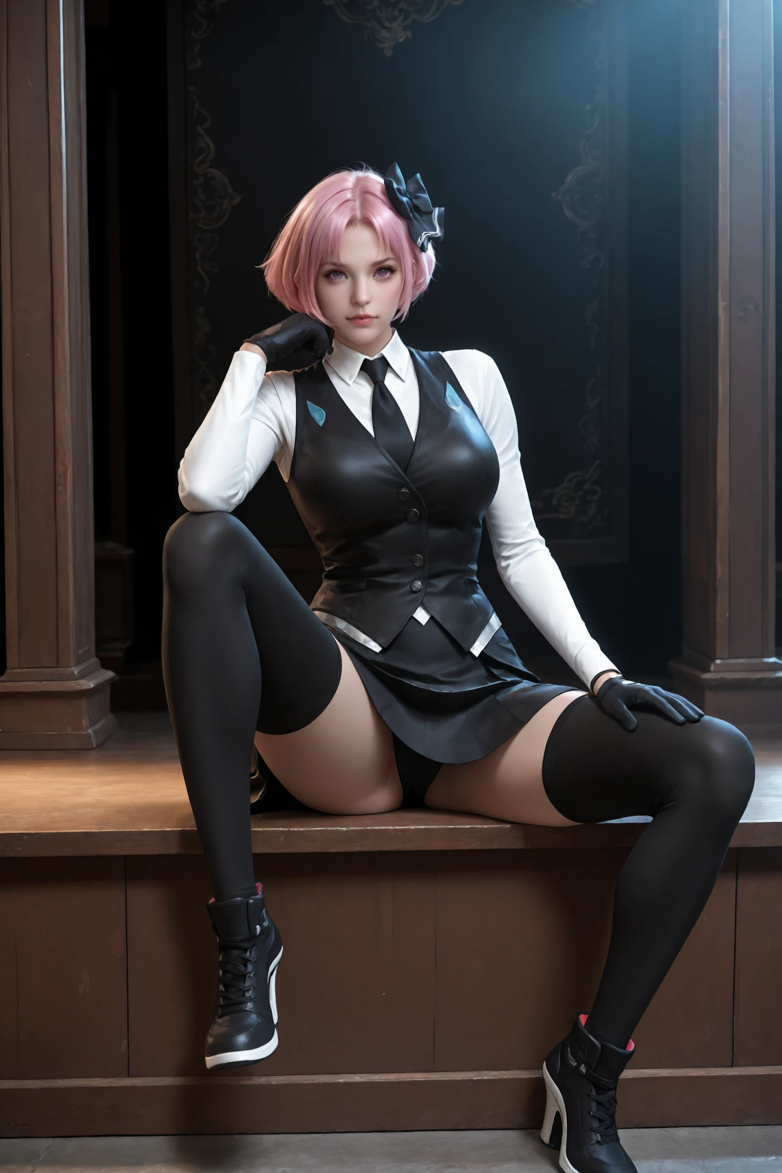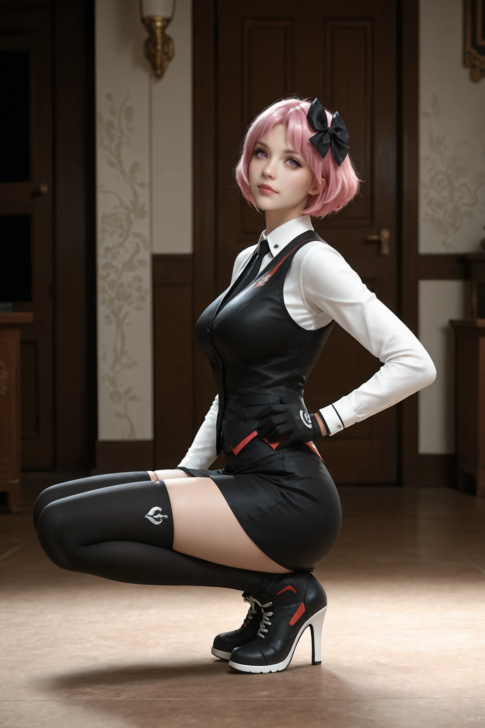 short_hair,pink_hair,hair_bow, large_breasts,necktie, collared_shirt,vest,black_gloves,skirt,black_thighhighs, black_footwear,sneakers,high_heels,