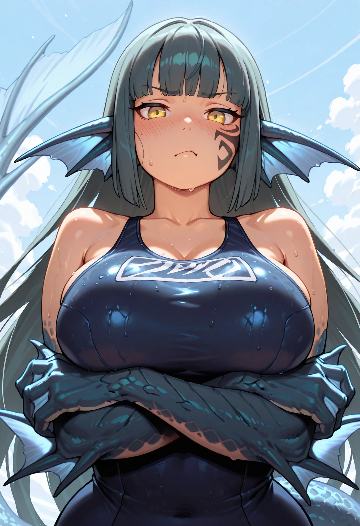 very long hair, dark grey hair, blunt bangs, yellow eyes, facial tattoo, leg tattooπ Aquatic Attire: