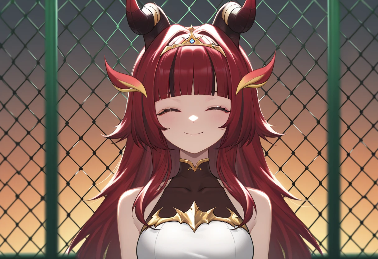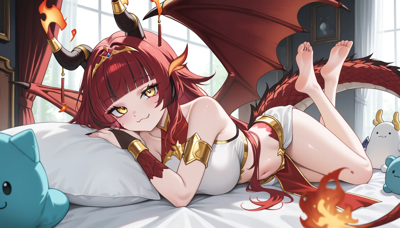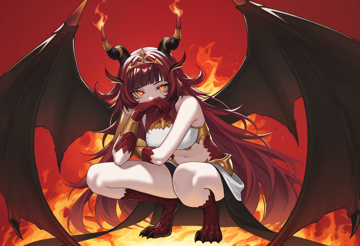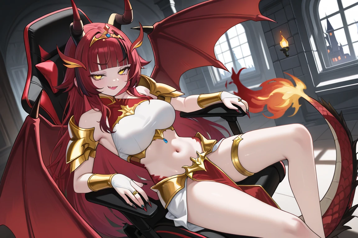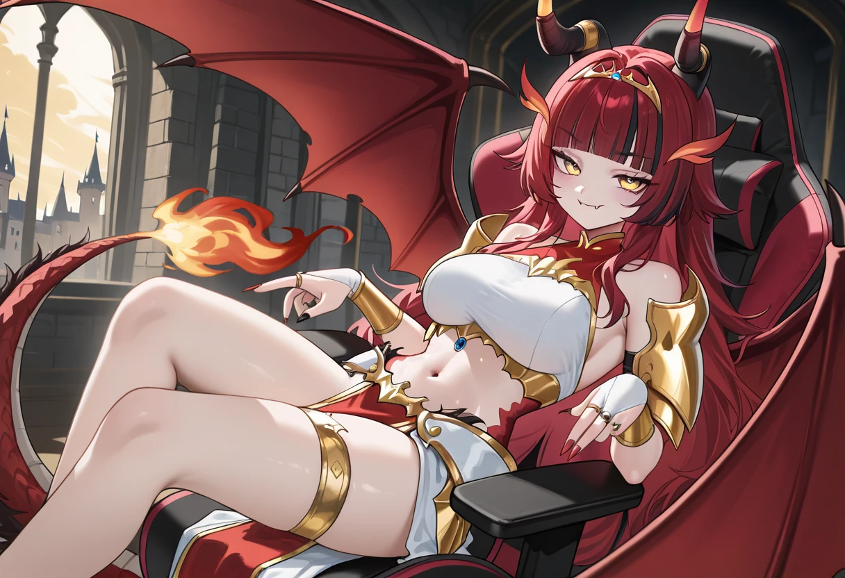alekirser, 1girl, solo, dragon girl, horns, dragon horns, horn ornament, wings, dragon wings, red hair, black hair, streaked hair, multicolored hair, very long hair, long hair, blunt bangs, yellow eyes, breasts, large breasts, navel, midriff, stomach, bare shoulders, thighs, fang, fang out, scales, pelvic curtain, crop top, sleeveless, bridal gauntlets, armlet, tiara, jewelry, gold trim