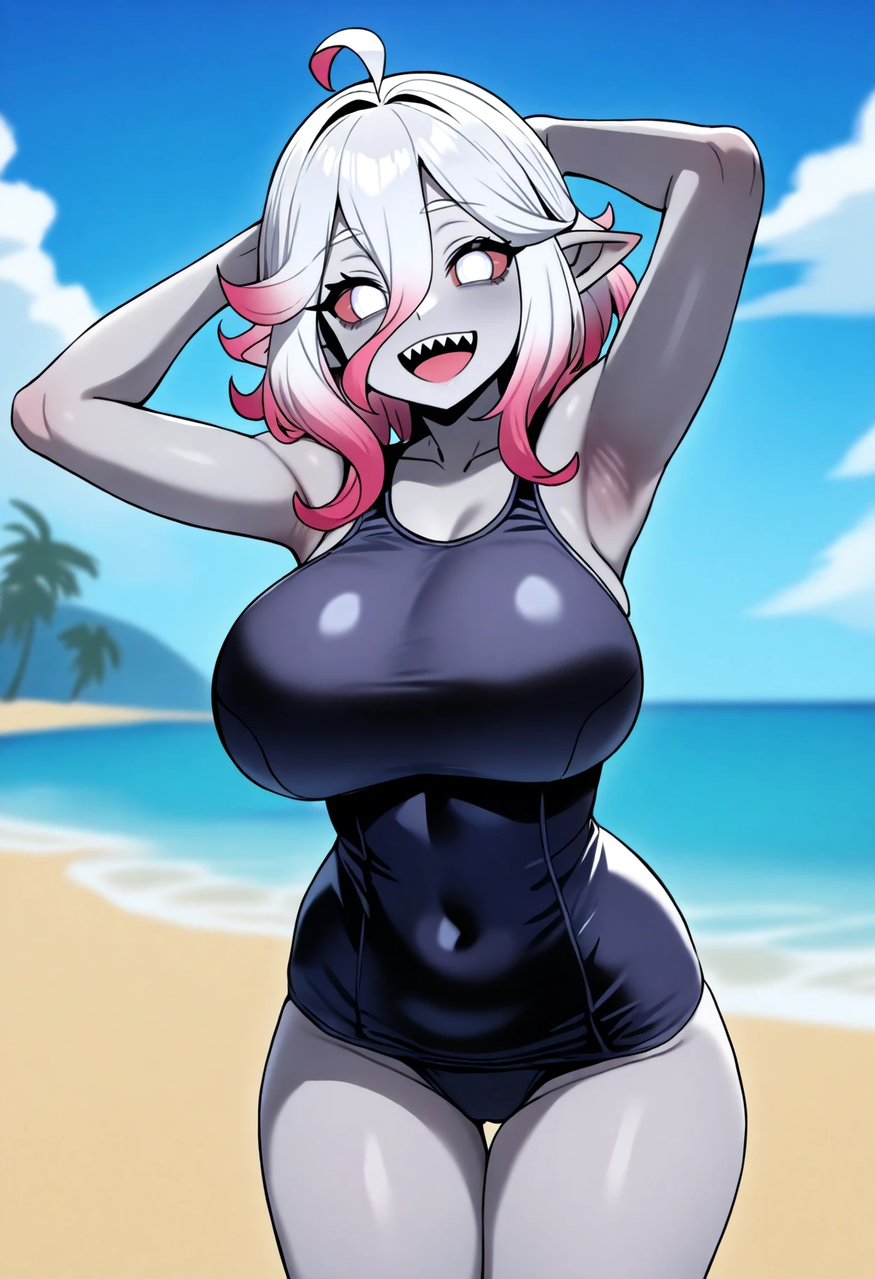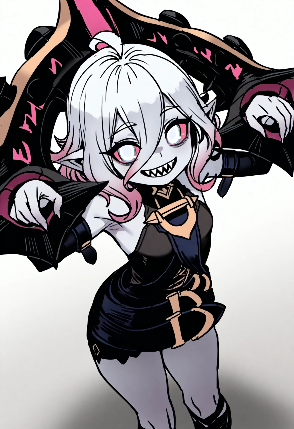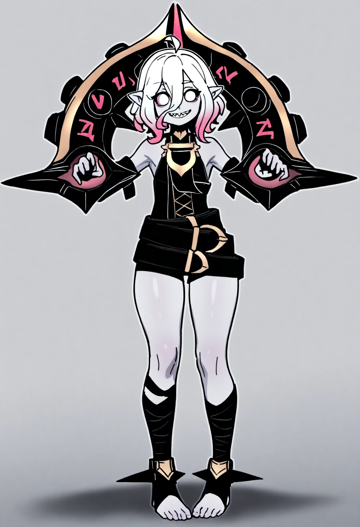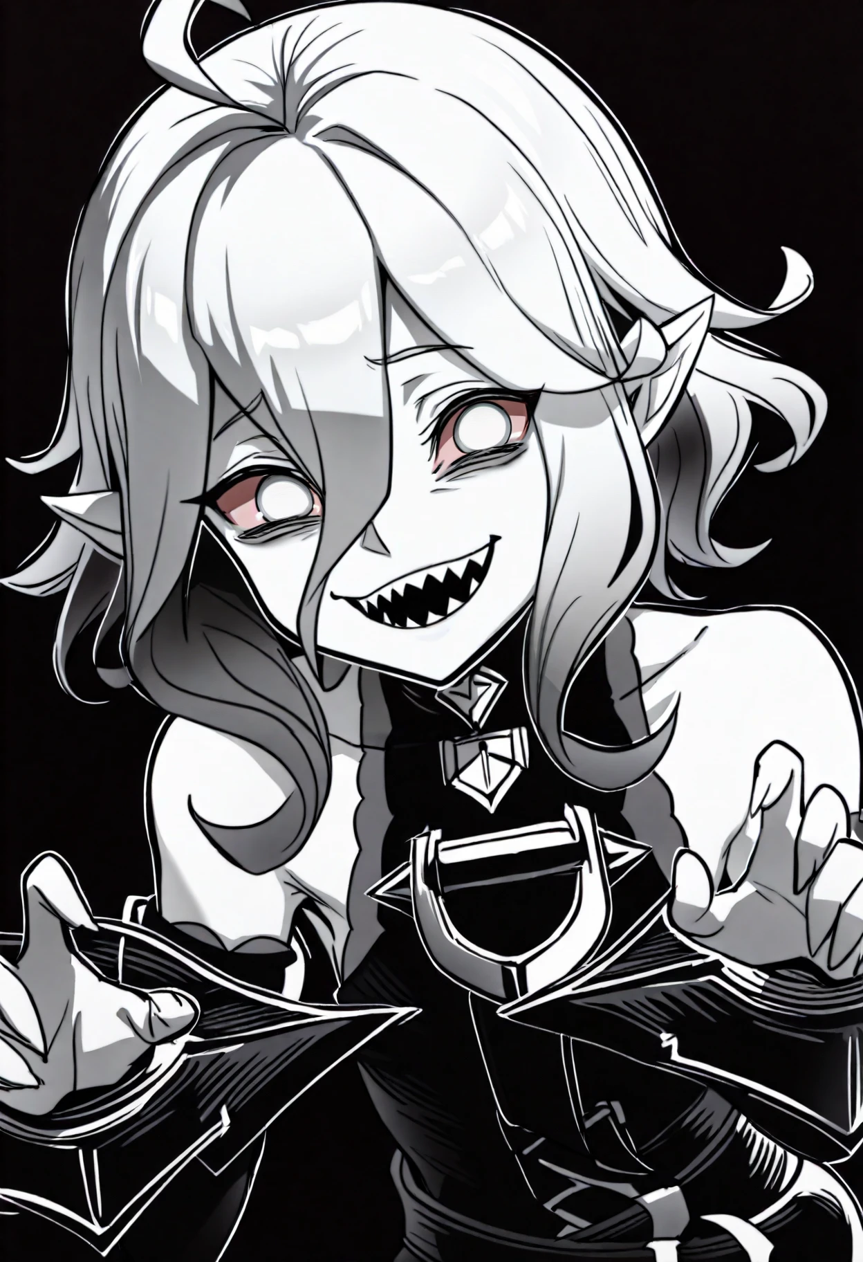 Basic prompts : 1girl, briar, white eyes, colored sclera, white hair, gradient hair, short hair, hair between eyes, ahoge, pointy ears, sharp teeth, grey skin