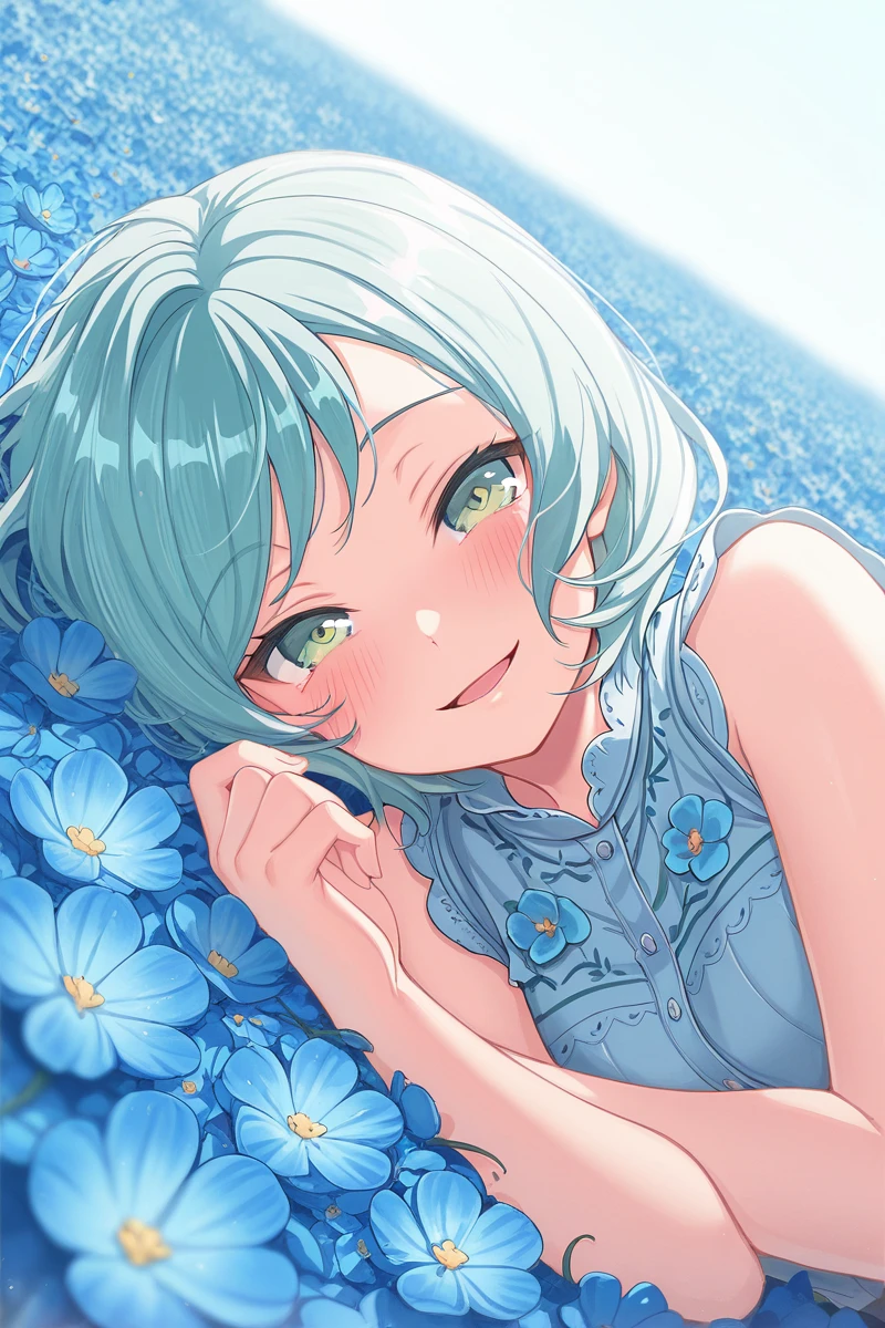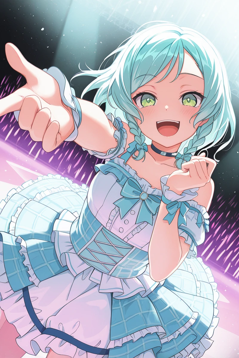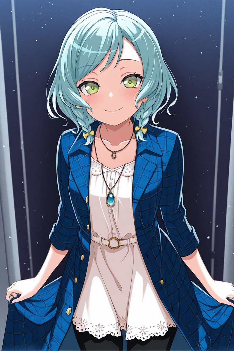 hikawahina, 1girl, solo, braid, green eyes, dress, aqua hair, side braids, looking at viewer, jewelry, necklace, white dress, plaid coat, blue coat, collarbone, twin braids, short sleeves, hair bow, pendant, bow, cslskSchool uniform Hina: