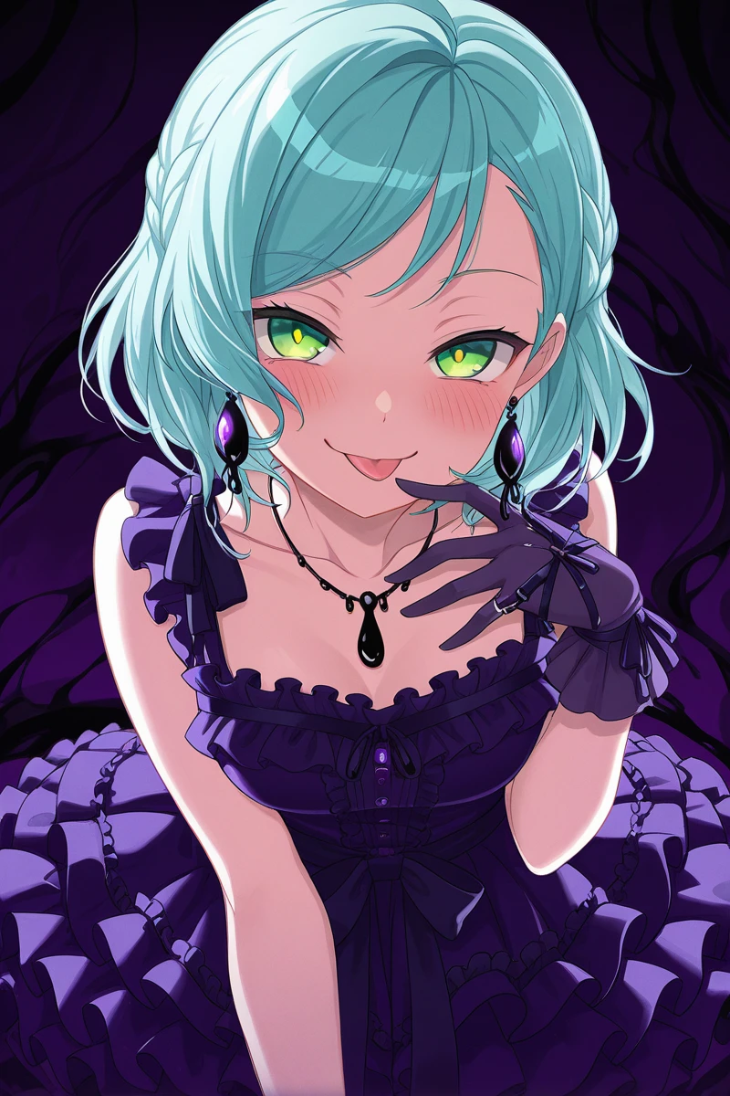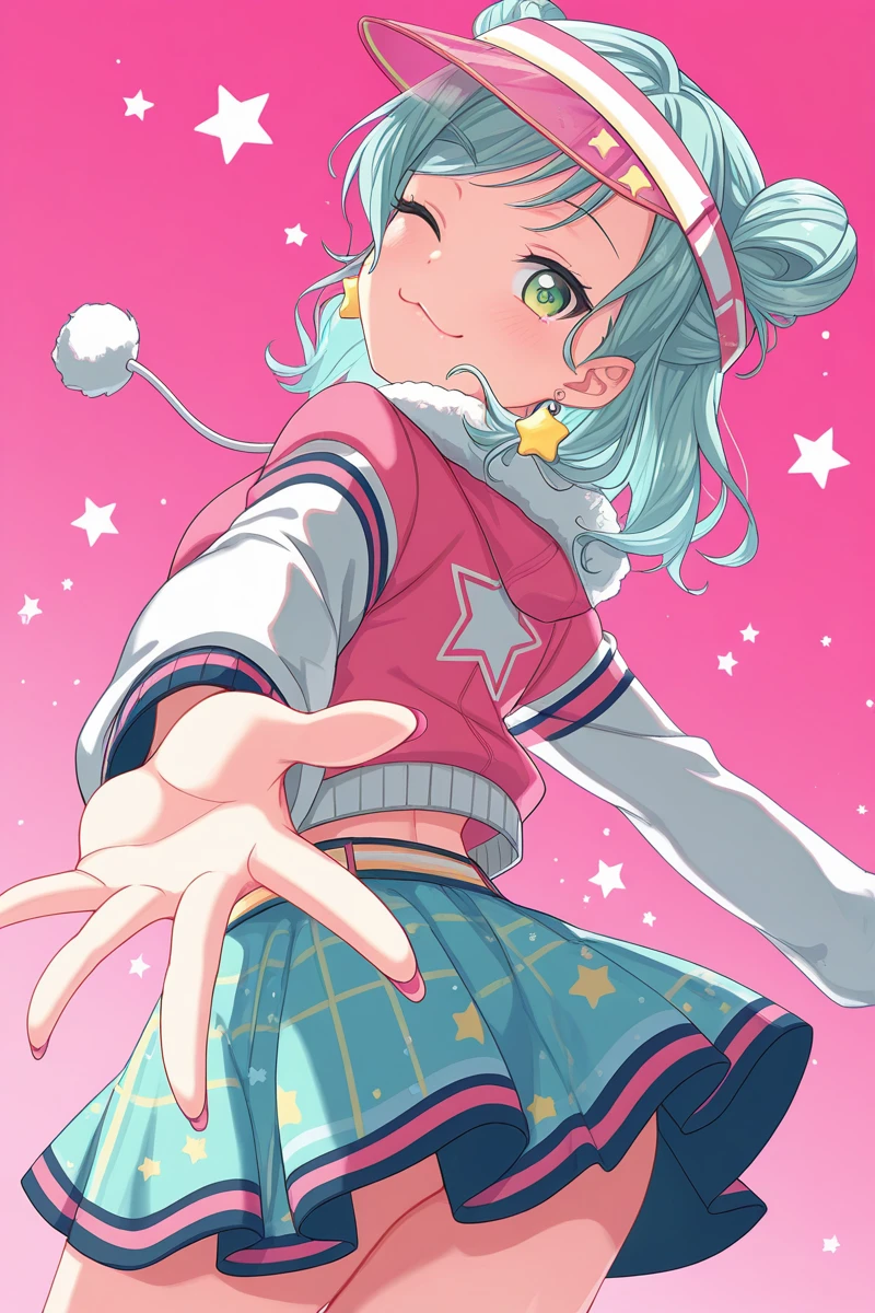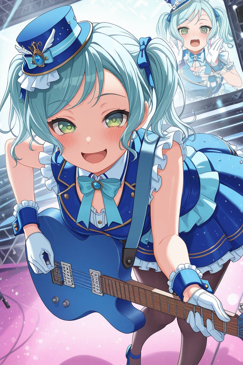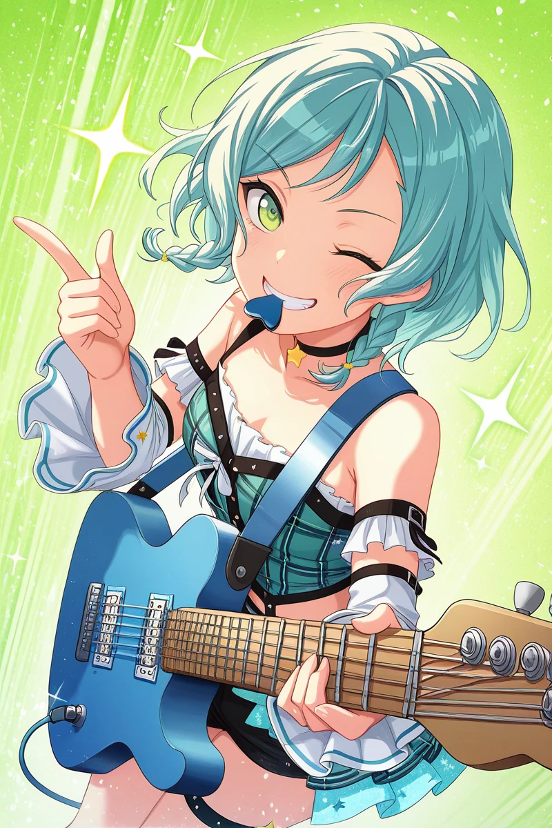hikawahina, 1girl, solo, braid, green eyes, dress, aqua hair, side braids, looking at viewer, jewelry, necklace, white dress, plaid coat, blue coat, collarbone, twin braids, short sleeves, hair bow, pendant, bow, cslskSchool uniform Hina: