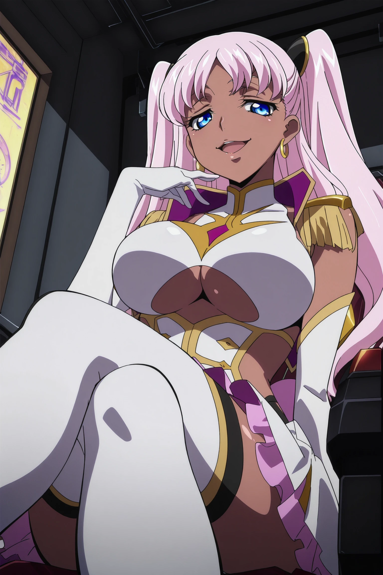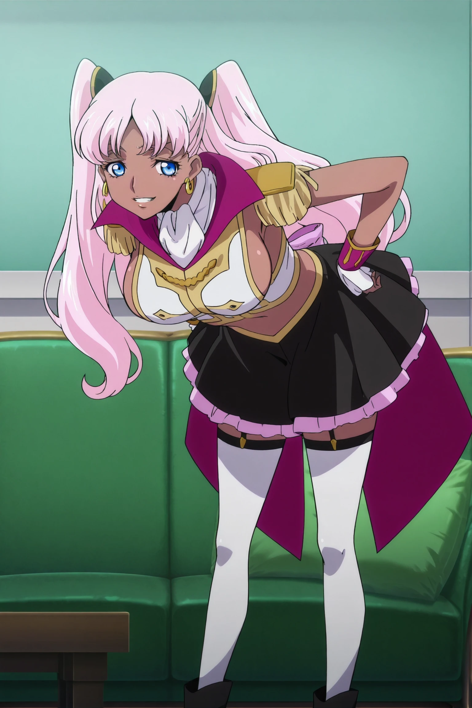 Essential keywords: 1girl, pink hair, blue eyes, dark skin, dark-skinned female, large breasts, twintails