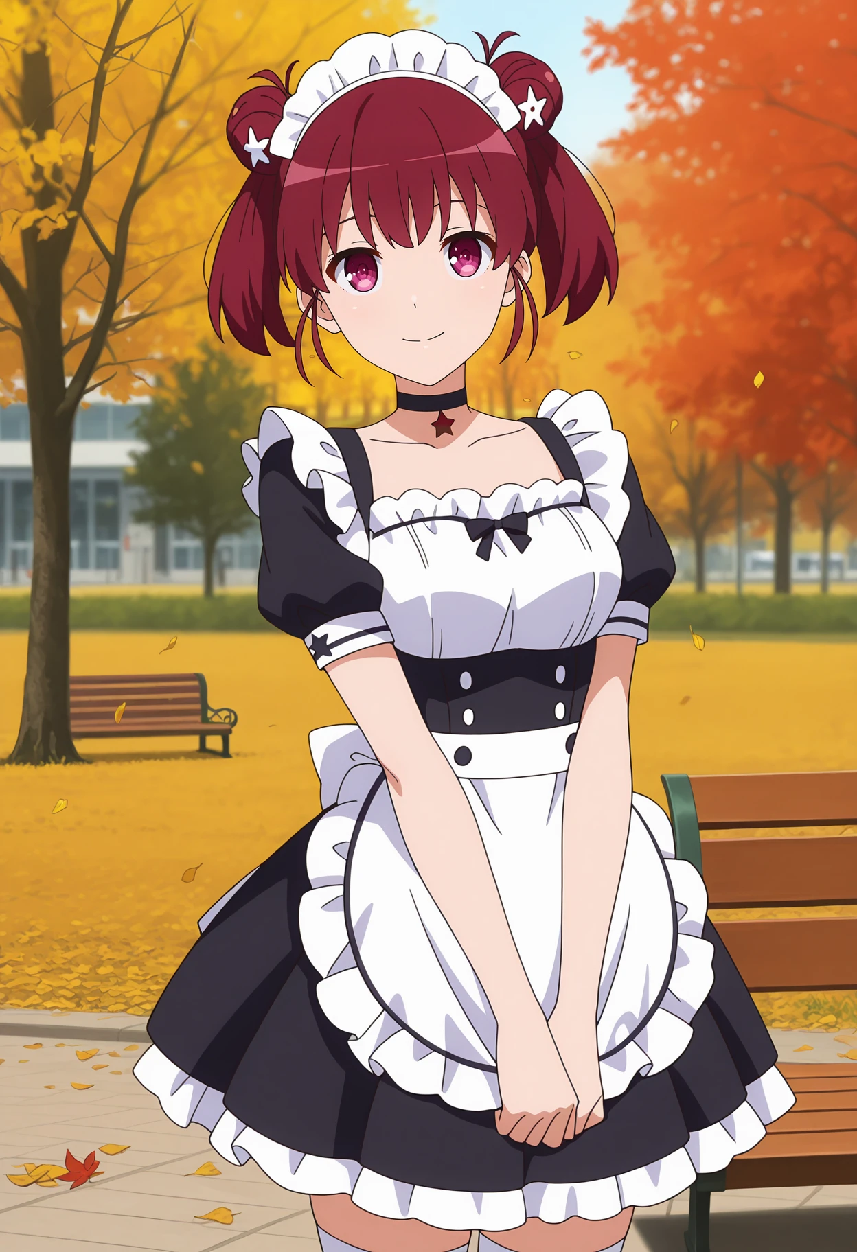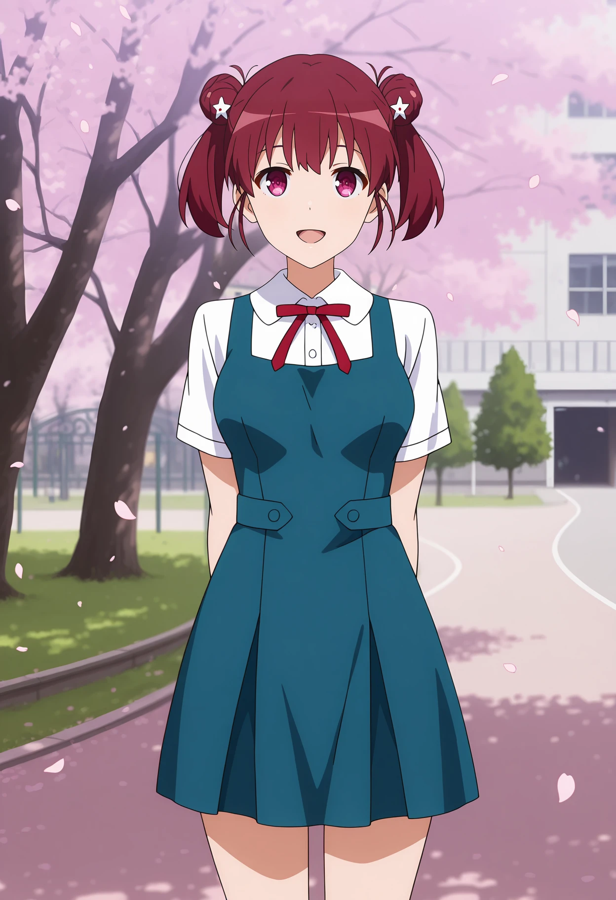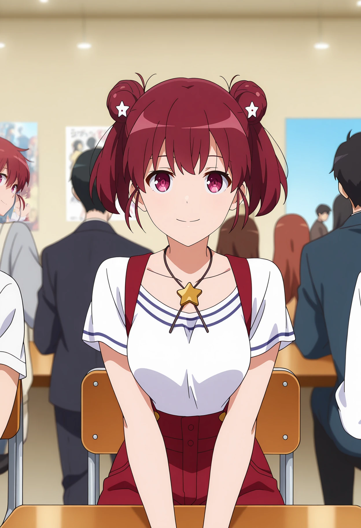 double bun, short twintails, red hair, pink eyes, star hair ornament