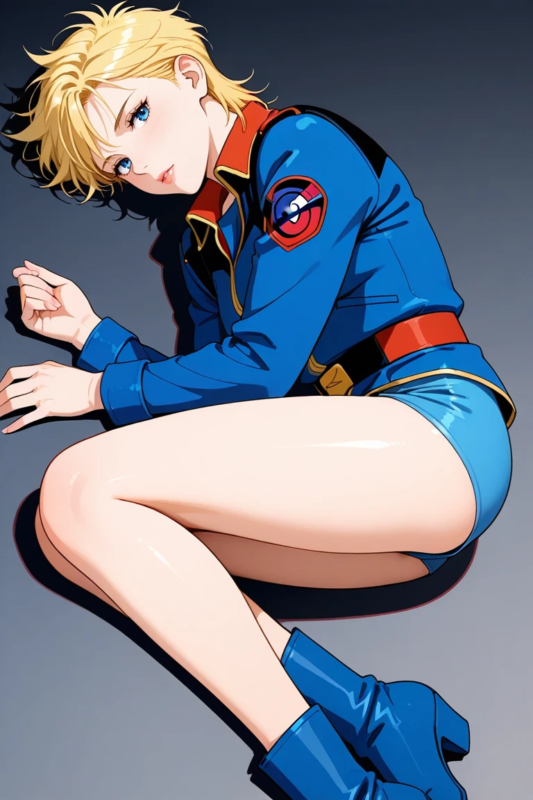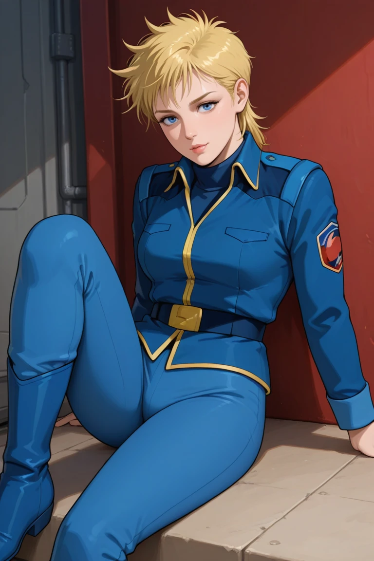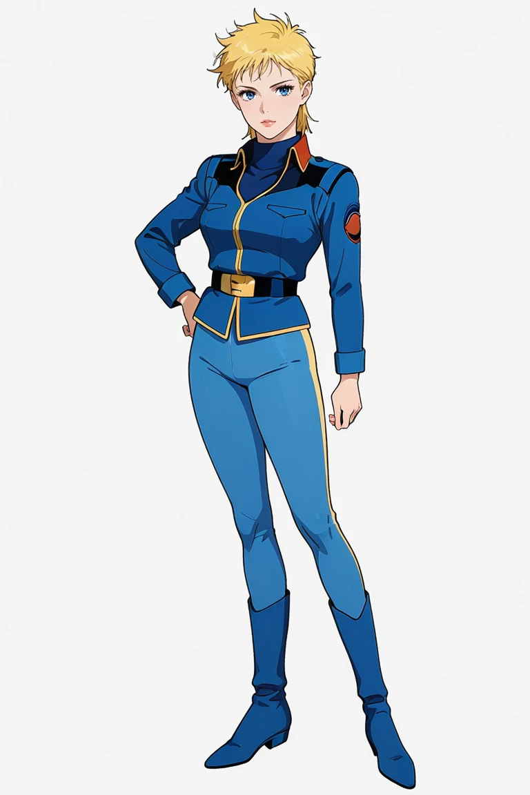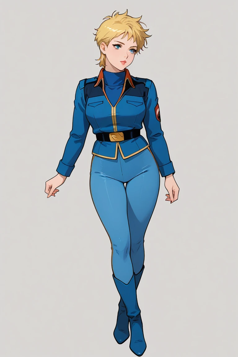kayra_su,slender mature_female,blonde short hair,spiky hair, messy hair,mullet,blue eyes,lips, blue military_uniform, blue pants,blue boots,