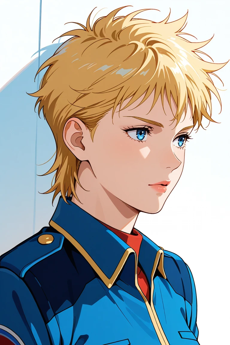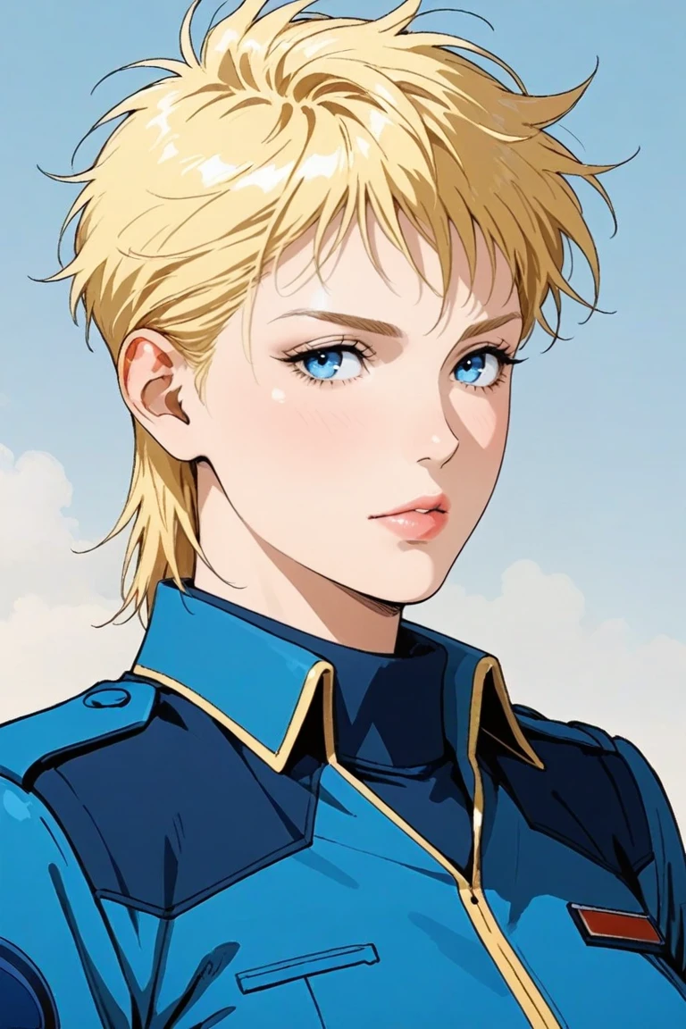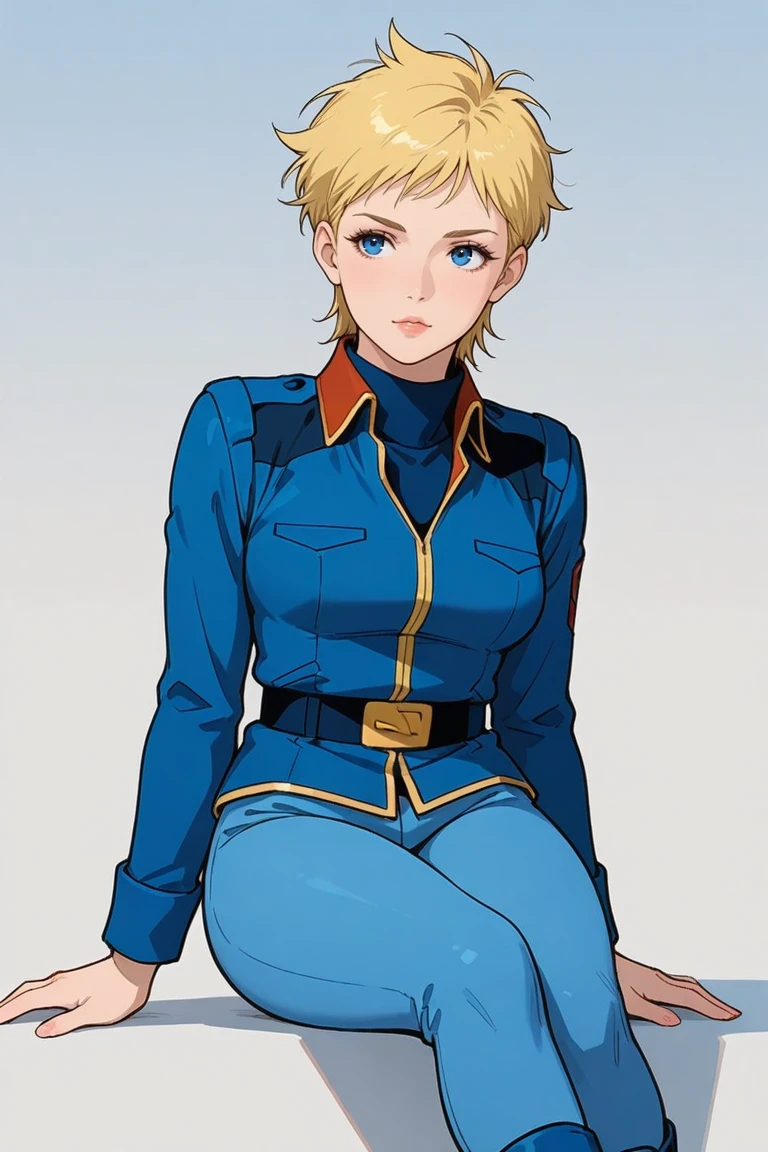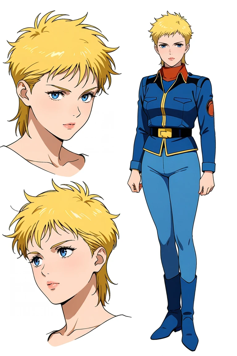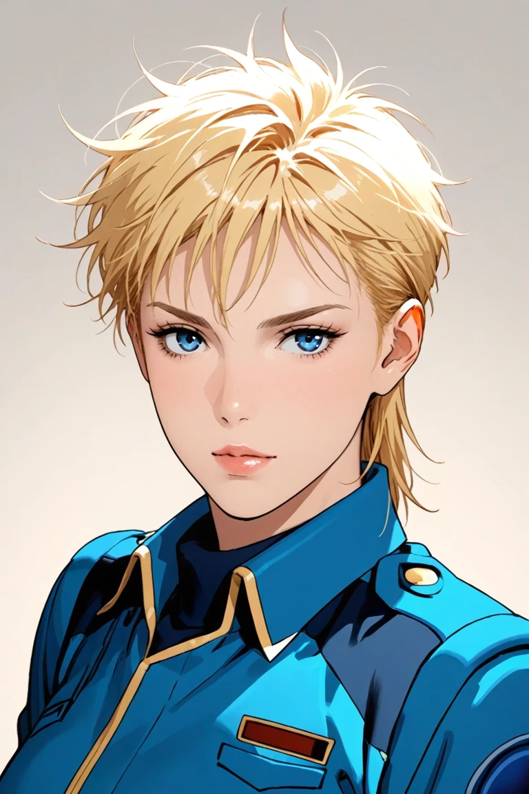 kayra_su,slender mature_female,blonde short hair,spiky hair, messy hair,mullet,blue eyes,lips, blue military_uniform, blue pants,blue boots,