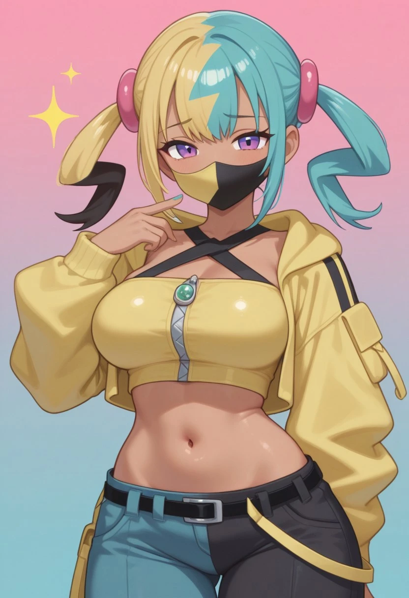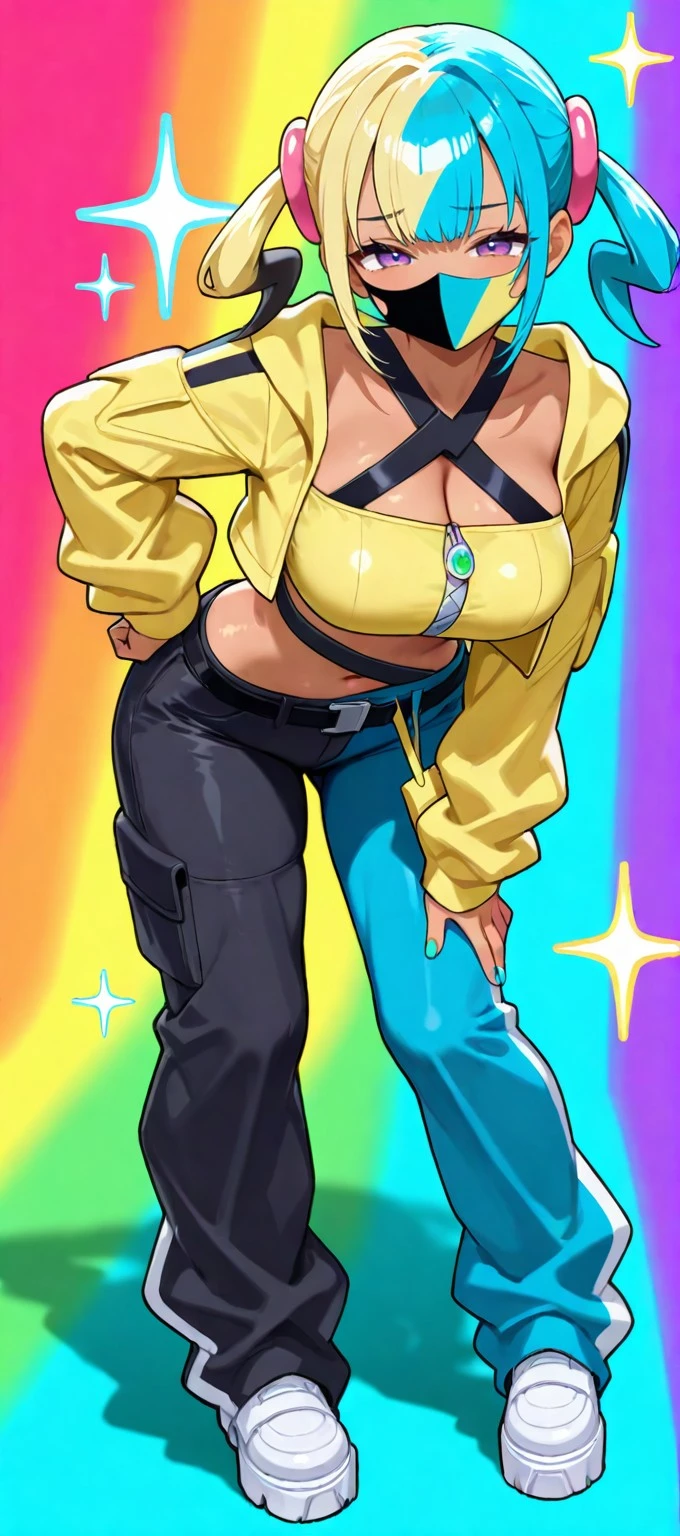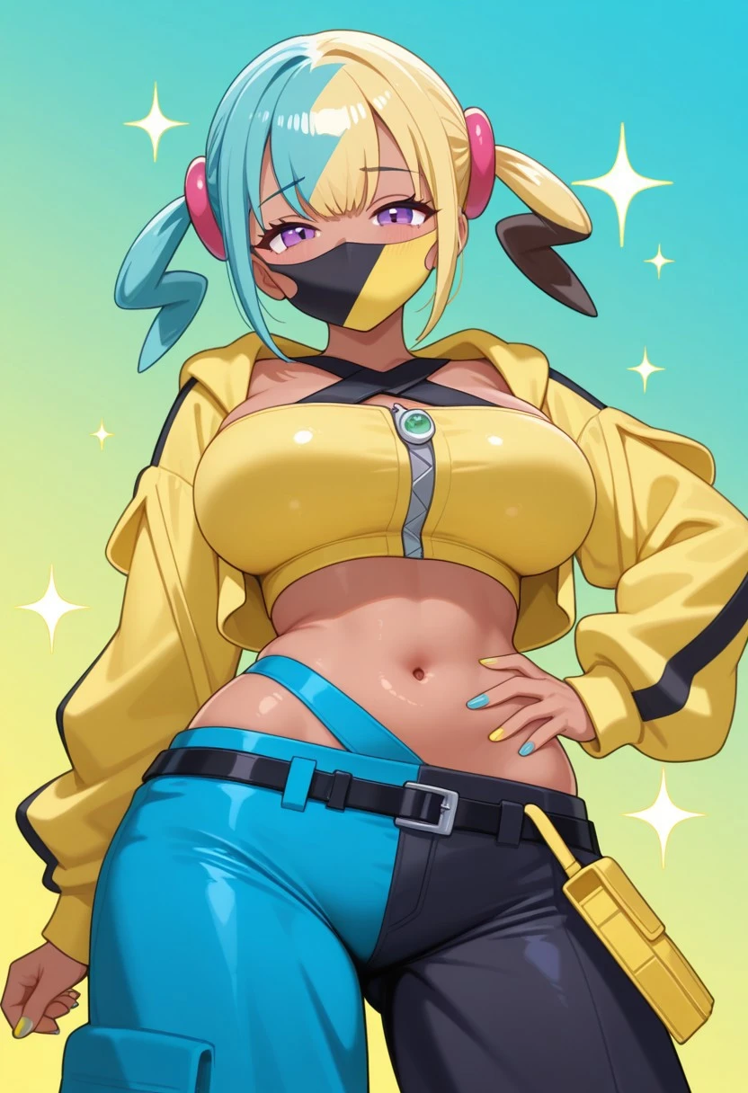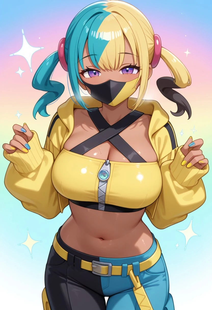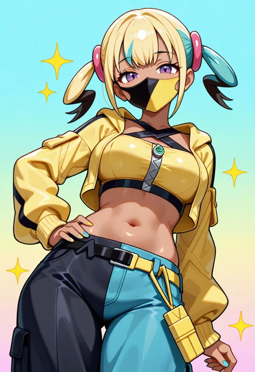 canari, canari \(pokemon\), two-tone hair, split-color hair, (blonde hair:0.5), (black hair:0.3), blue hair, twintails, hair ornament, blue eyes, dark-skinned female, two-tone mask, black mask, yellow mask, cropped jacket, yellow jacket, open jacket, long sleeves, two-tone nails, yellow nails, blue nails, nail polish, criss-cross halter, yellow crop top, zipper, navel, midriff, two-tone pants, black pants, blue pants, baggy pants, belt, shoes, white footwear, aged up