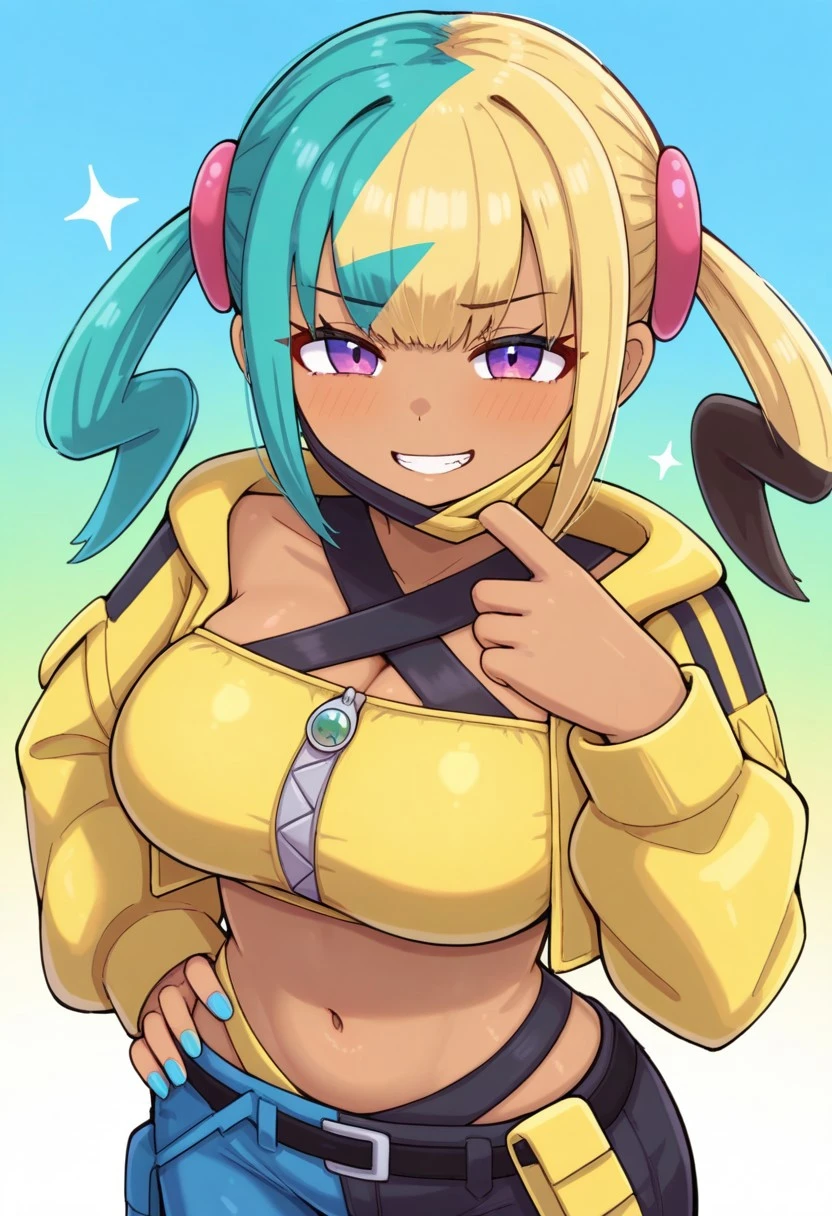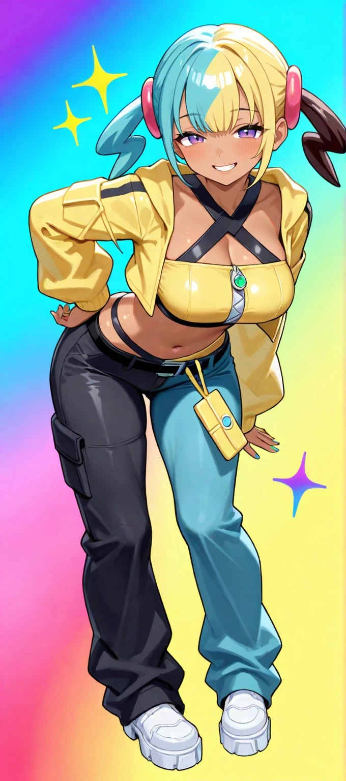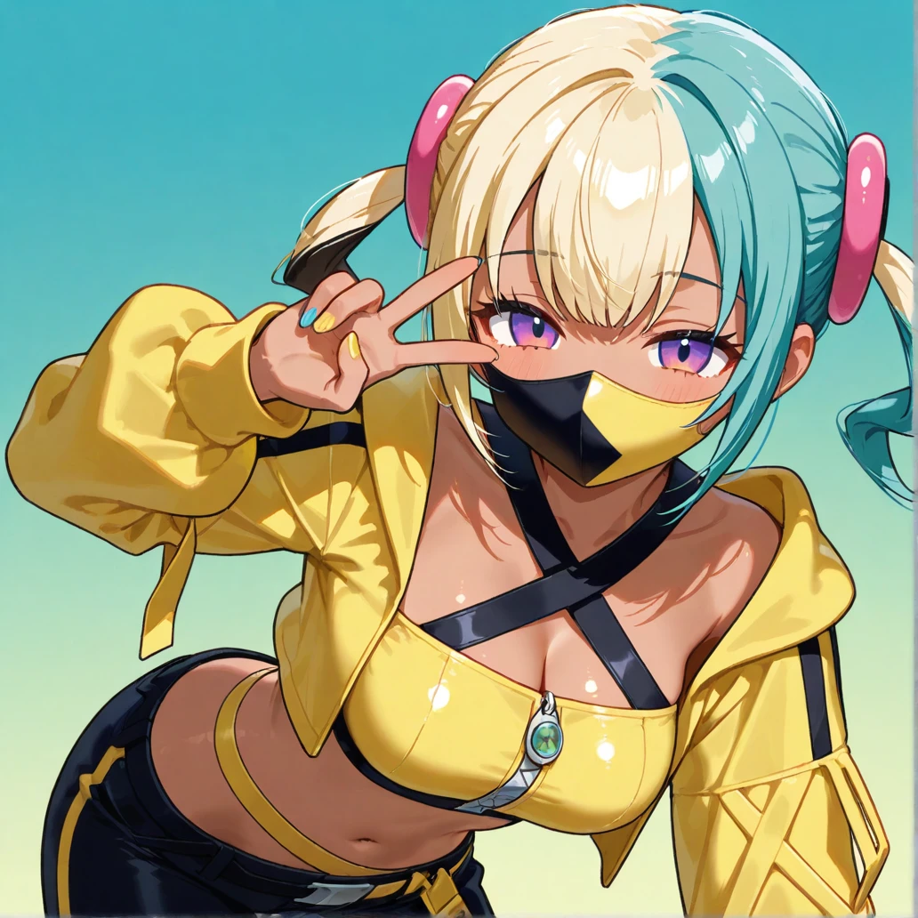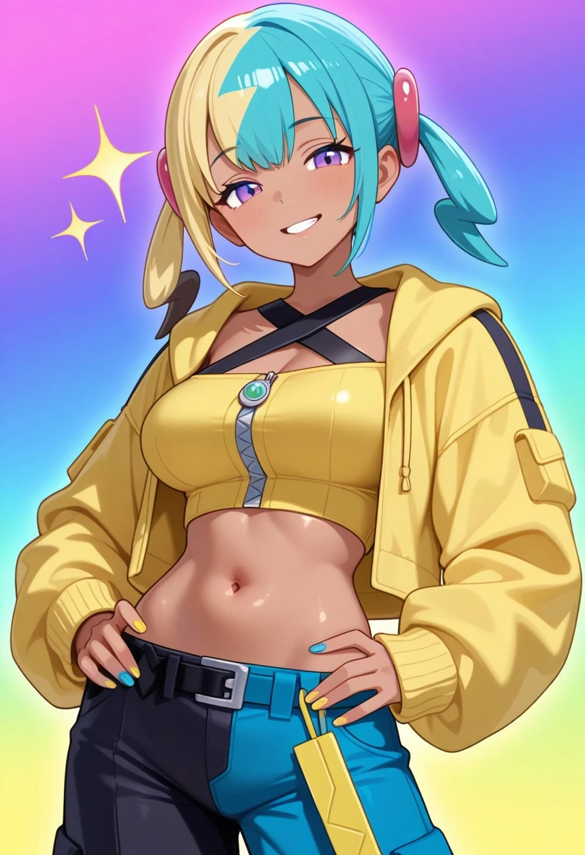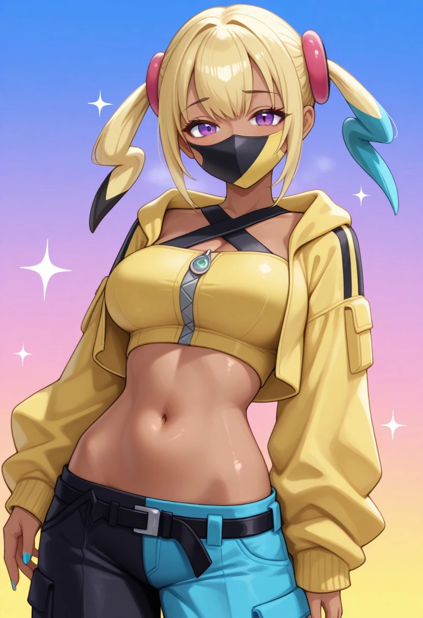 canari, canari \(pokemon\), two-tone hair, split-color hair, (blonde hair:0.5), (black hair:0.3), blue hair, twintails, hair ornament, blue eyes, dark-skinned female, two-tone mask, black mask, yellow mask, cropped jacket, yellow jacket, open jacket, long sleeves, two-tone nails, yellow nails, blue nails, nail polish, criss-cross halter, yellow crop top, zipper, navel, midriff, two-tone pants, black pants, blue pants, baggy pants, belt, shoes, white footwear, aged up