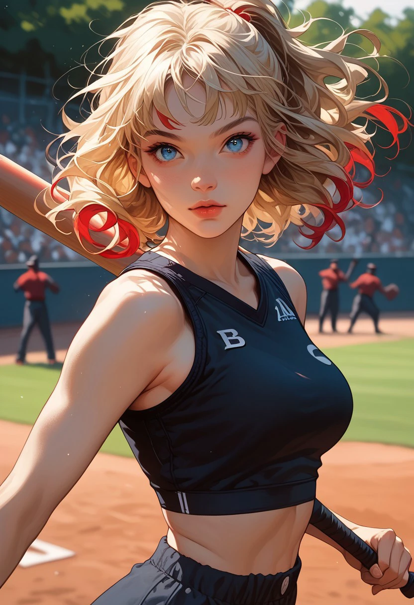Riley Blaze, multicolored hair, medium length hair, pigtail, blond hair, red streaks, more red streaks, wavy hair, bangs, hair tie, blue eyes, almond shaped eyes, medium breasts,