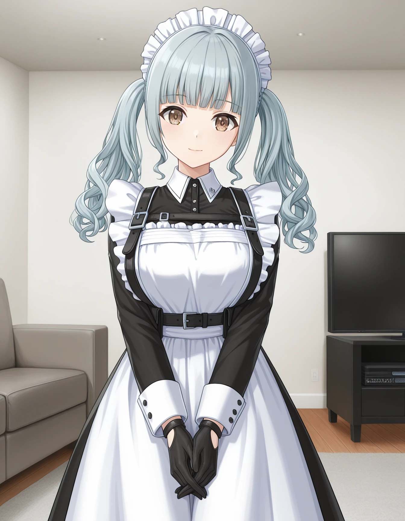 Mei_Maid, maid, maid headdress, maid apron, black harness, long skirt, white pantyhose, black gloves