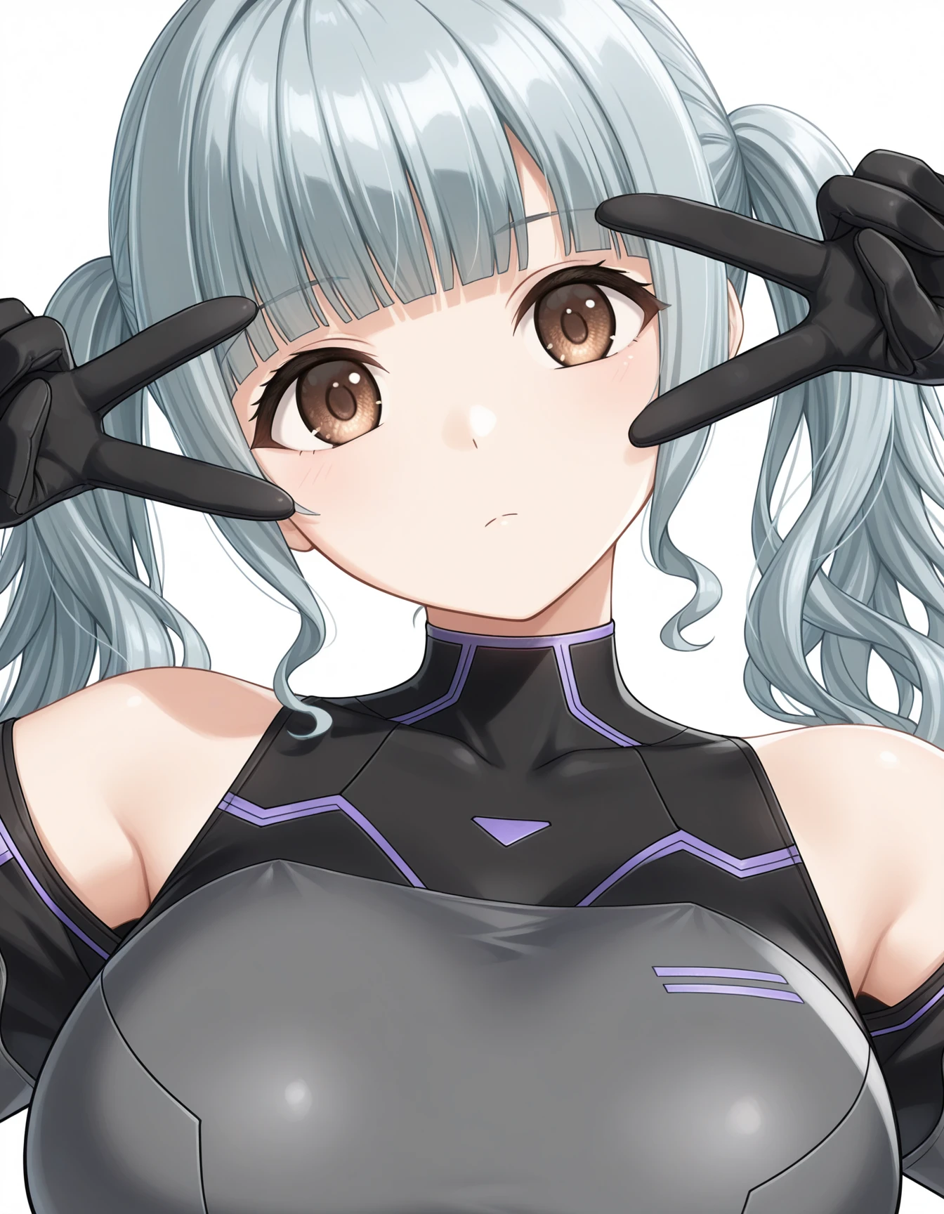 nagato mei, grey hair, wavy hair, twintails, blunt bangs, brown eyes